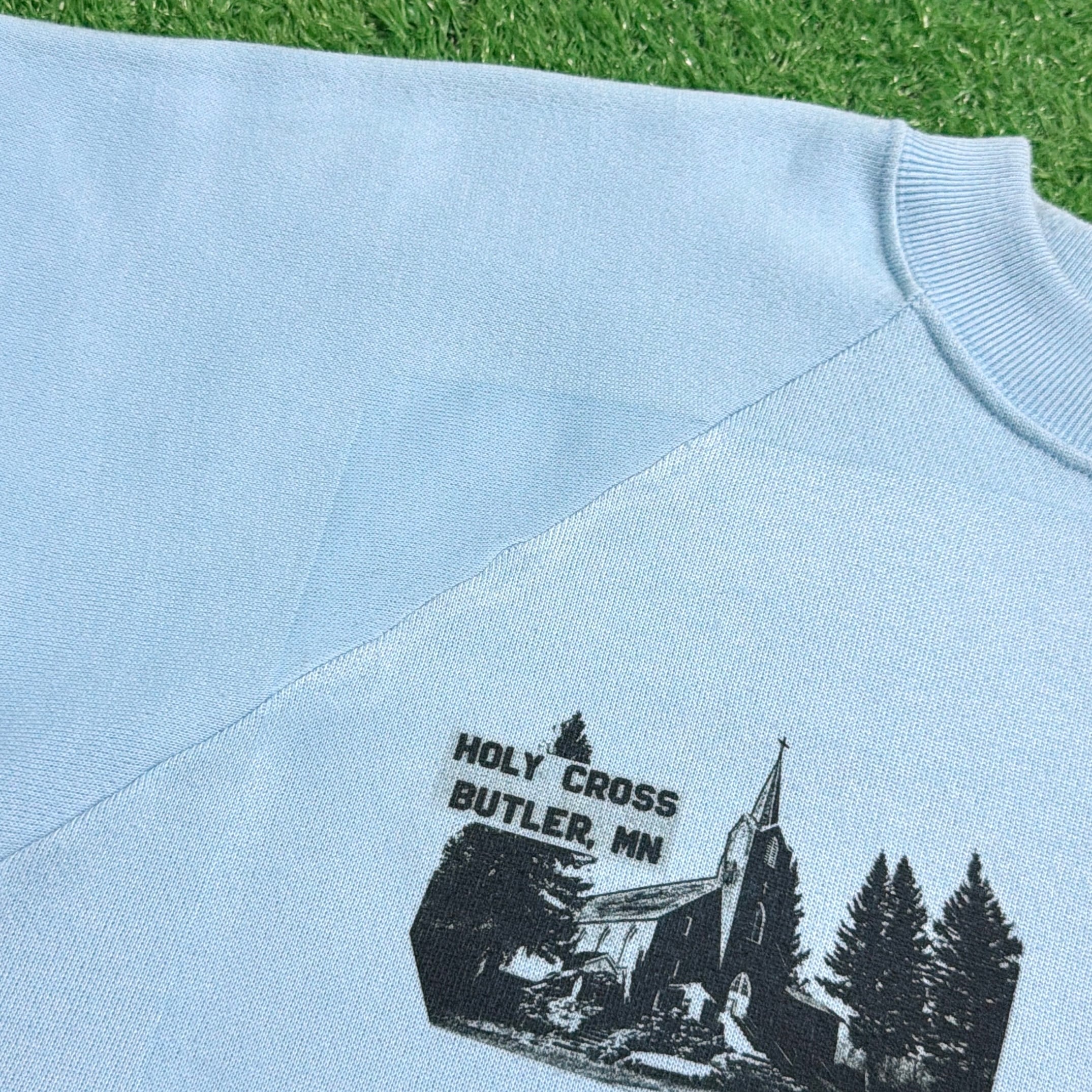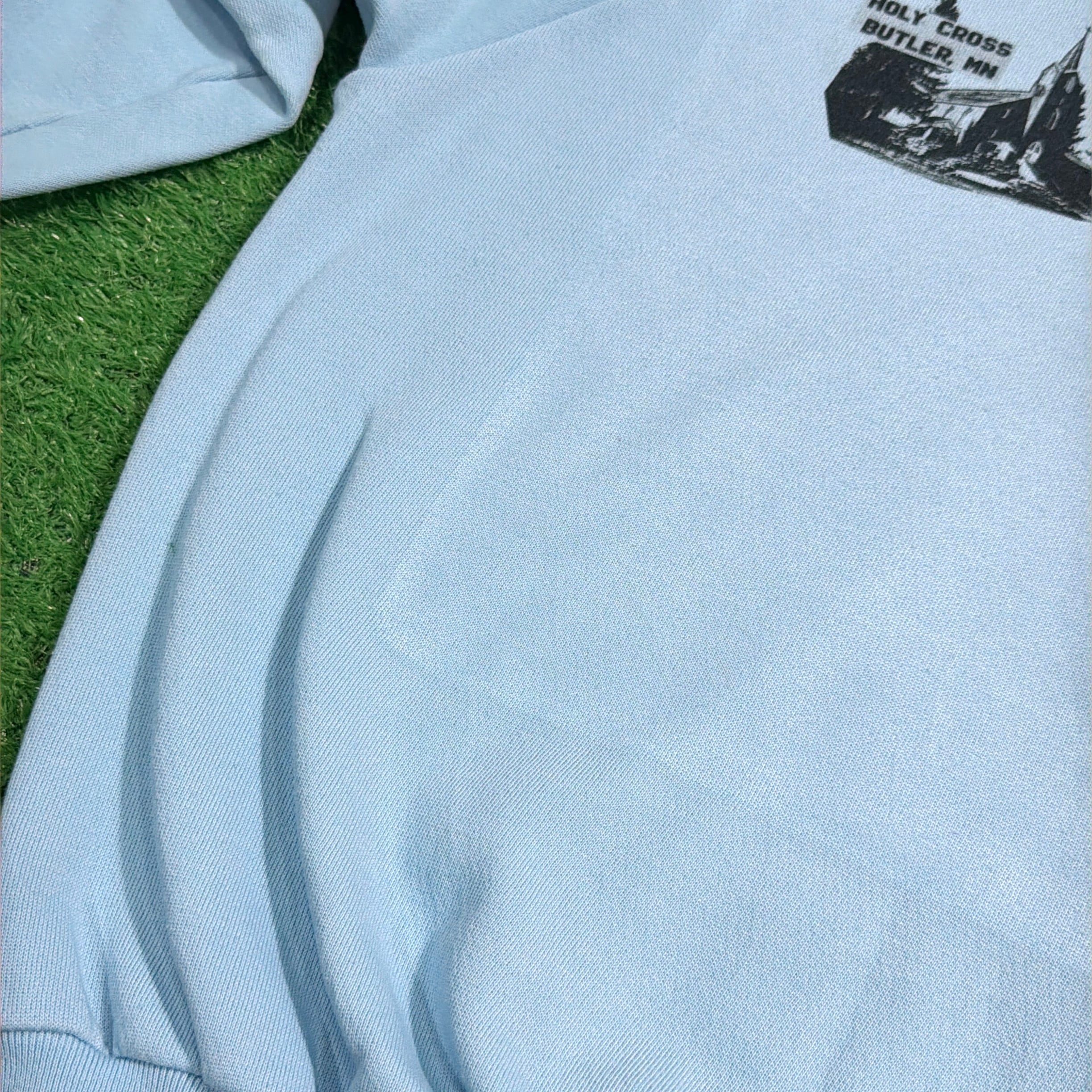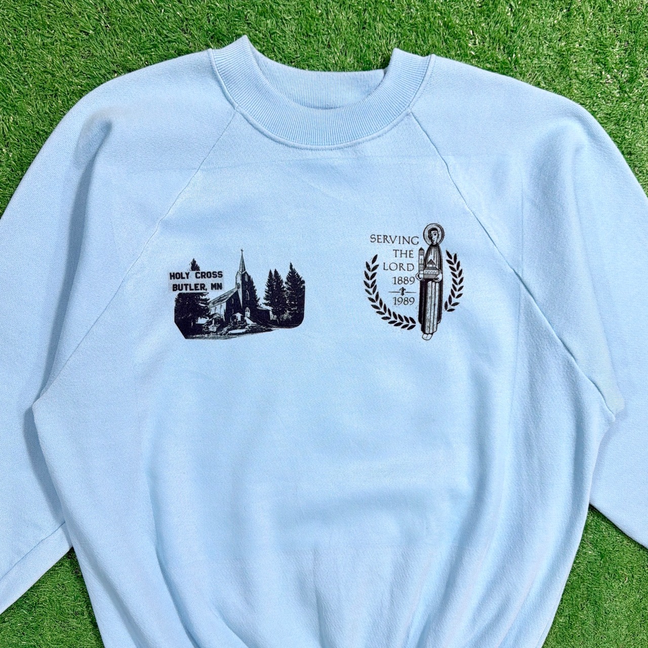 フロントには ミネソタ州バトラー(BUTLER, MN)にある “Holy Cross Catholic Church(ホーリークロス教会)” のイラスト と、“SERVING THE LORD 1889–1989” の記念ロゴ がプリントされています。創立100周年(1889〜1989)を記念して作られた、イベント系アニバーサリースウェットの一枚です。