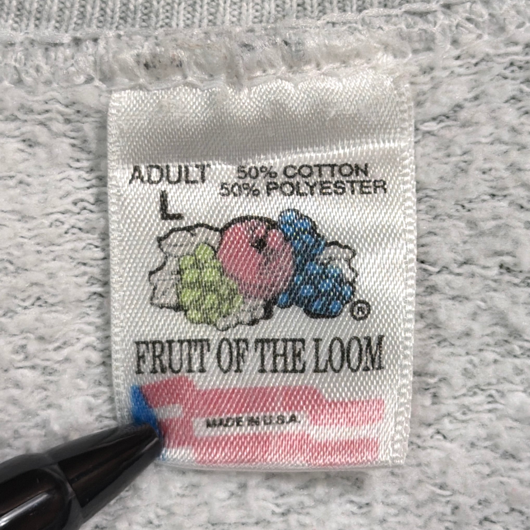 グレー杢のボディにカラフルなプリントが映える、古着らしいデザインです。