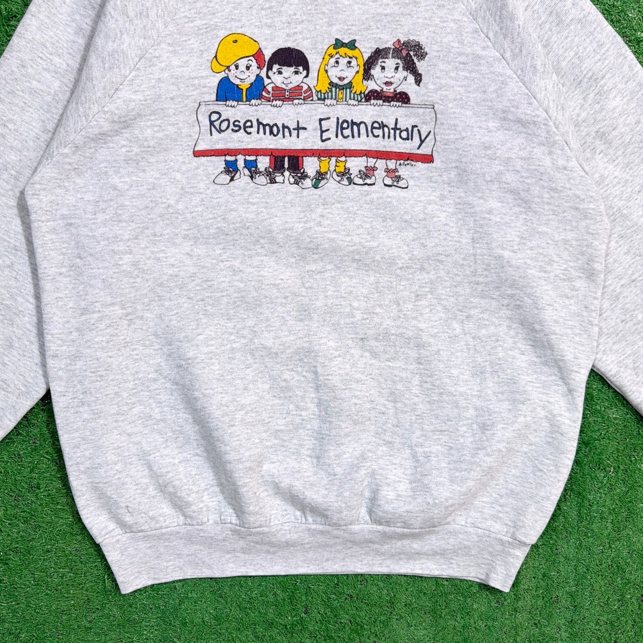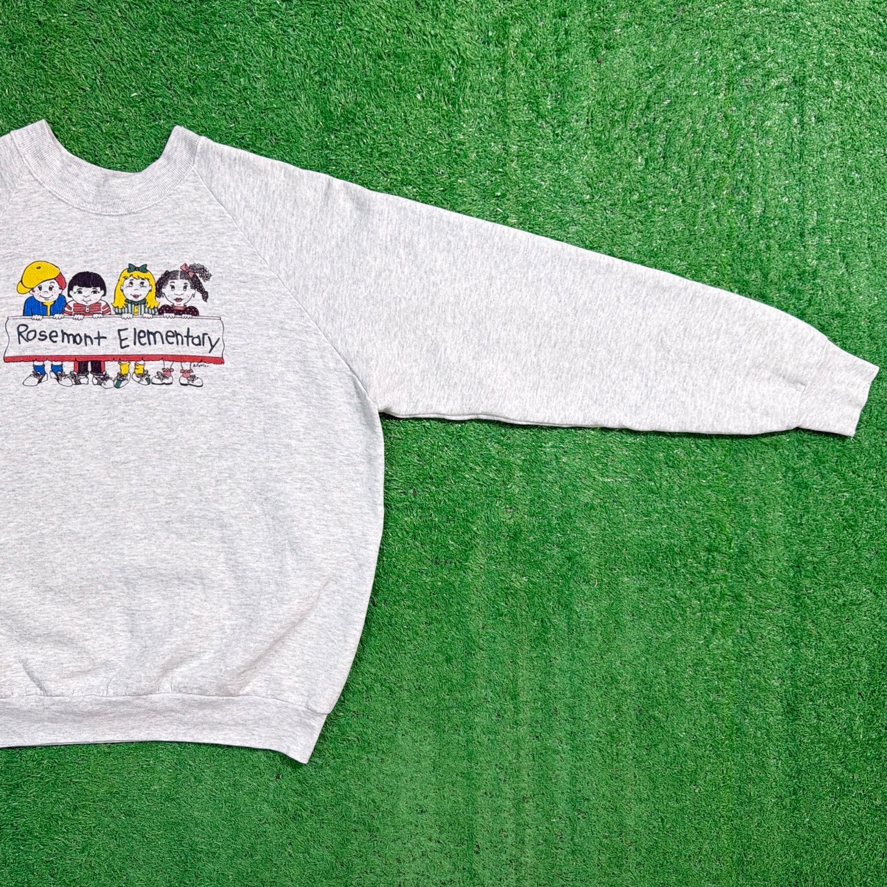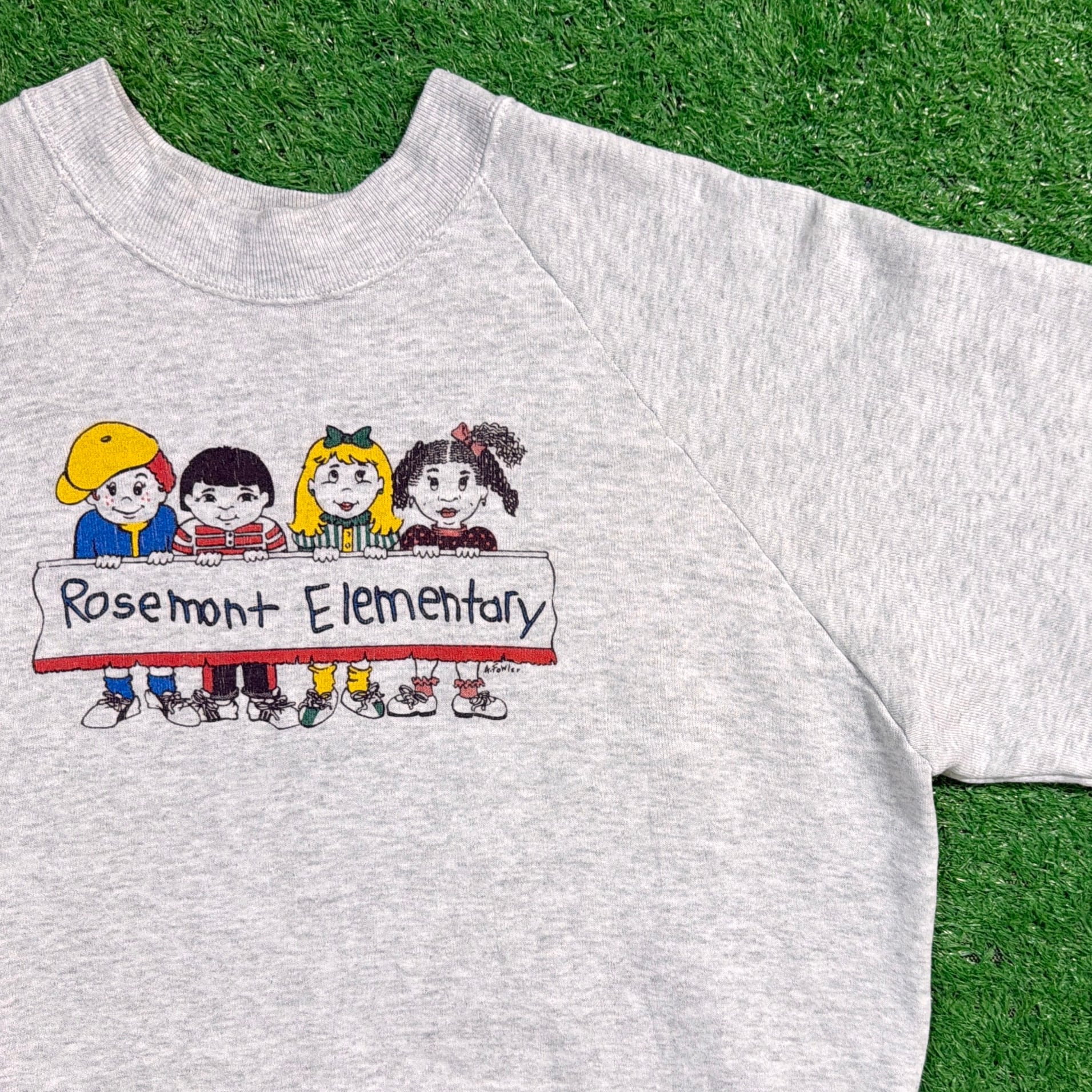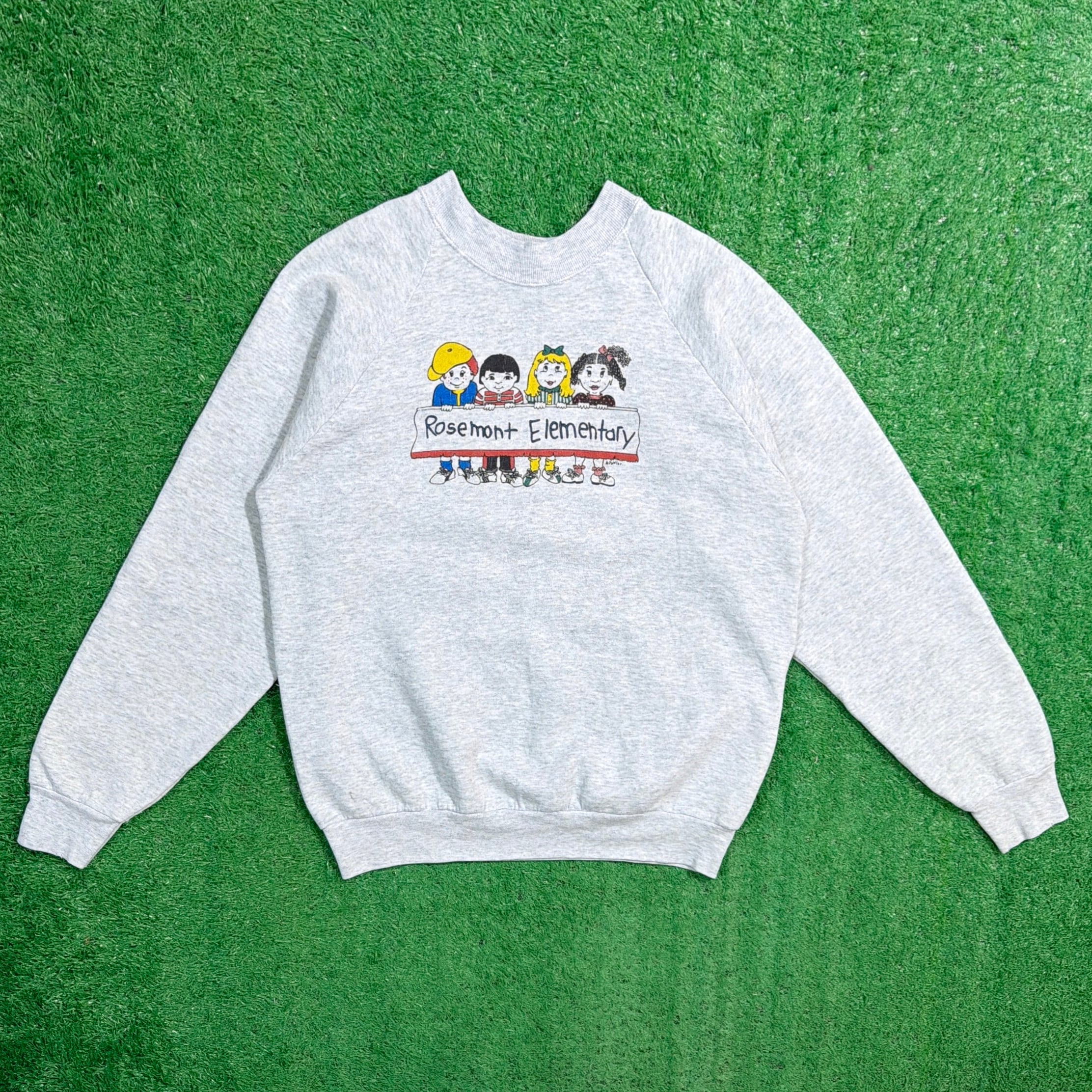 1990年代のアメリカ製、Rosemont Elementary(アメリカの小学校)をモチーフにしたスウェットシャツです。フロントには子どもたちのイラストが描かれており、ポップで可愛らしい雰囲気の1枚。