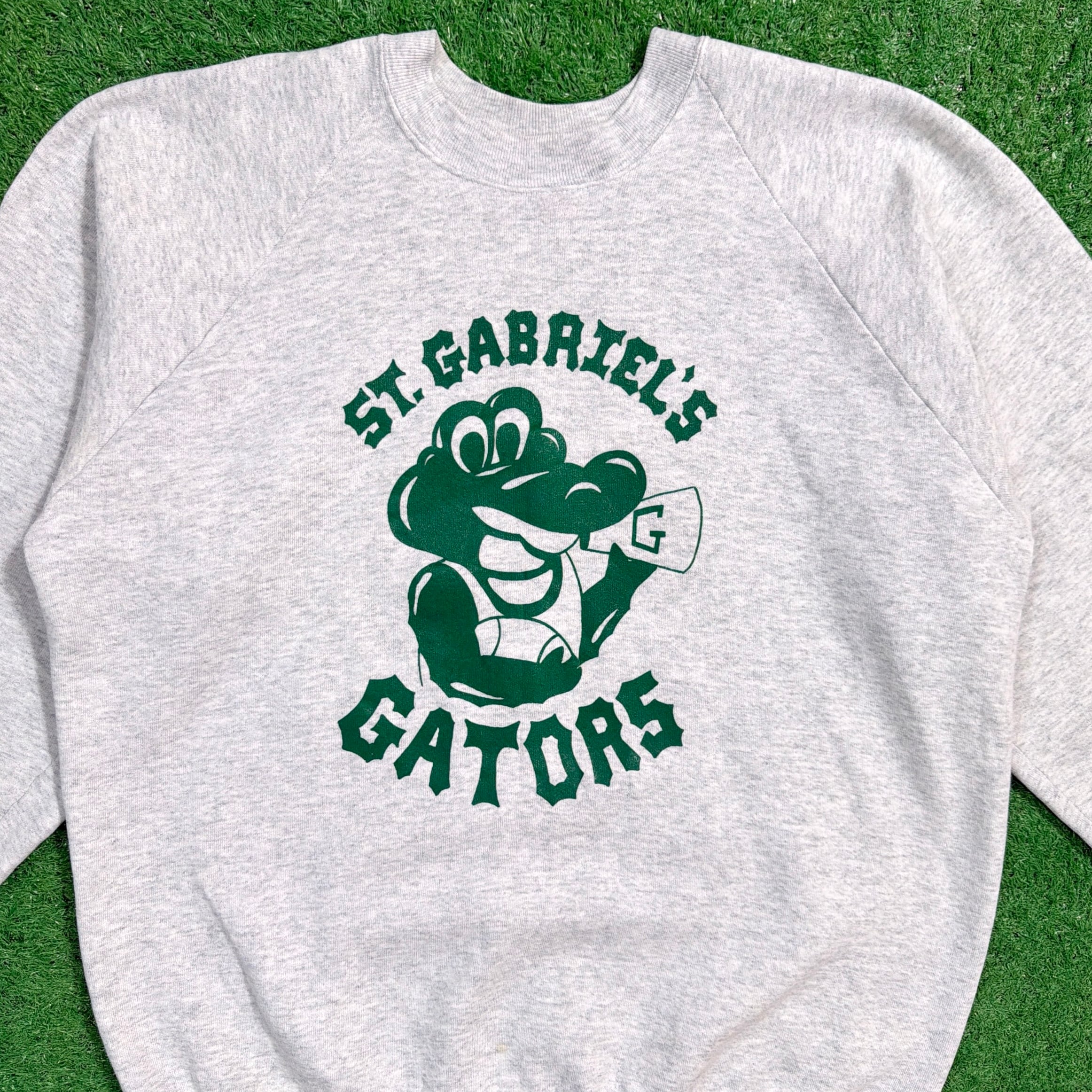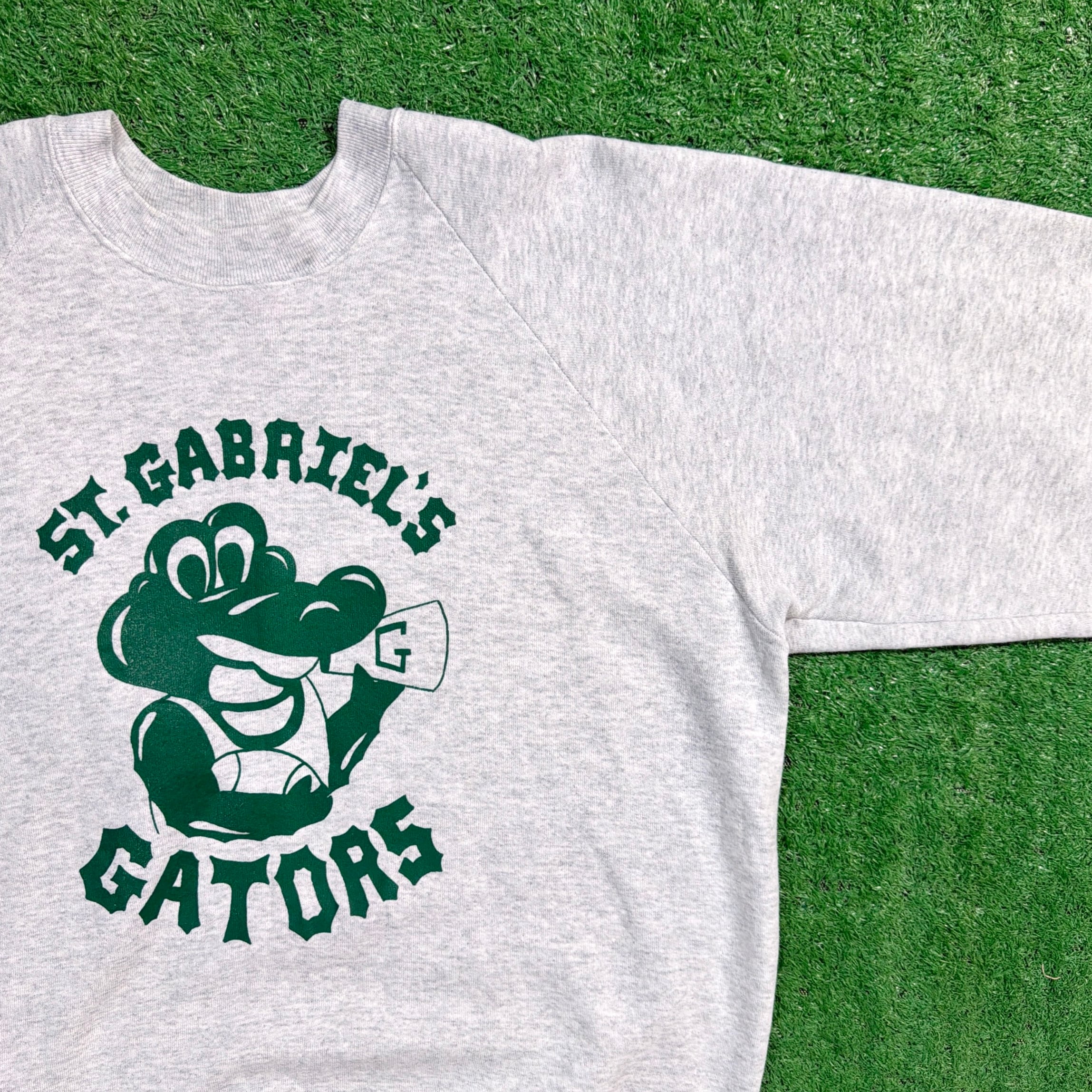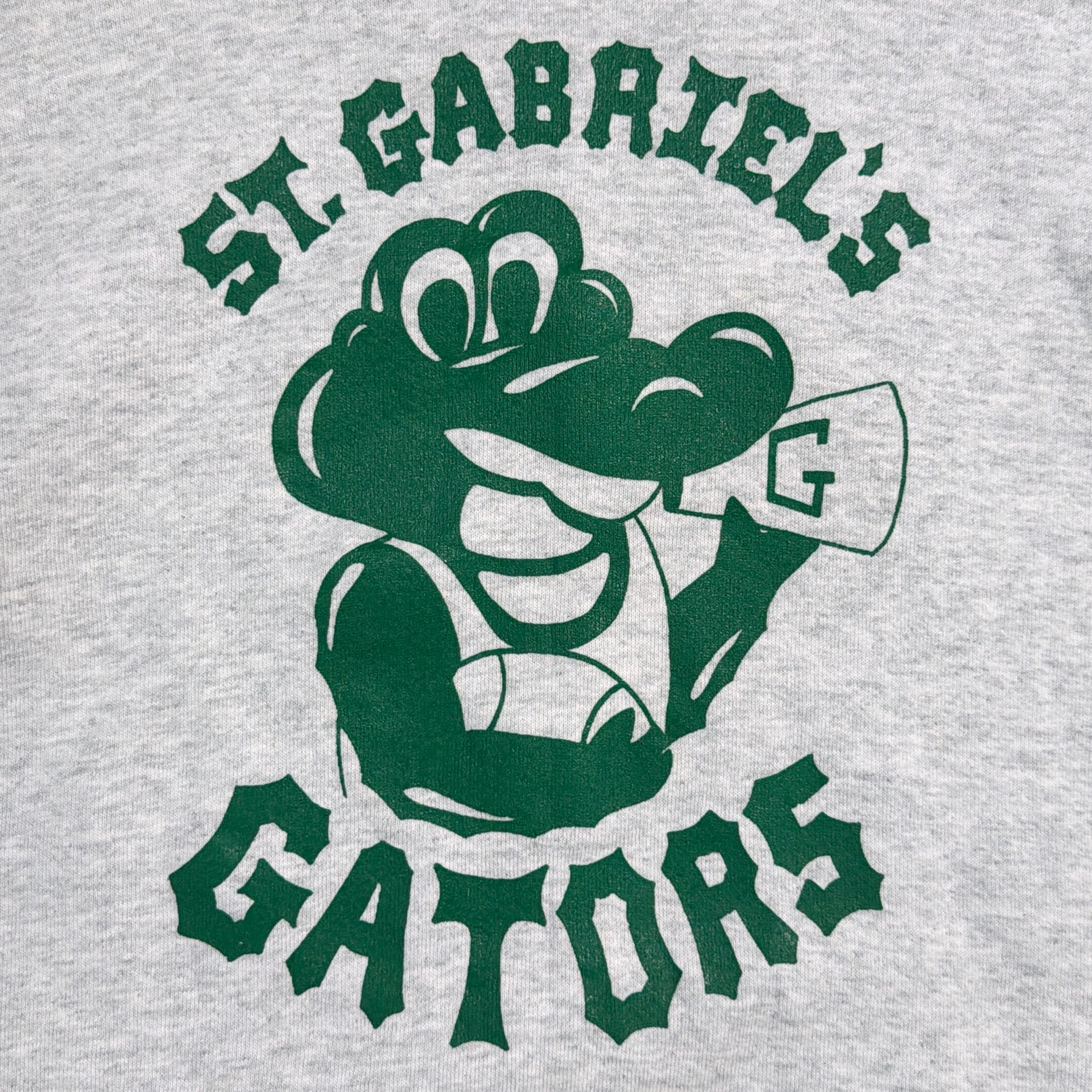 フロントには、アメリカ各地にある St. Gabriel’s School のチーム “Gators” をモチーフにした、メガホンを持ったワニのマスコットプリントが入った一枚。ライトな杢グレーのボディにグリーンのプリントが映える、クラシックなカレッジテイストのデザインです。ユニセックスで着られるシルエットで、デイリーにさらっと着やすいスウェットです。