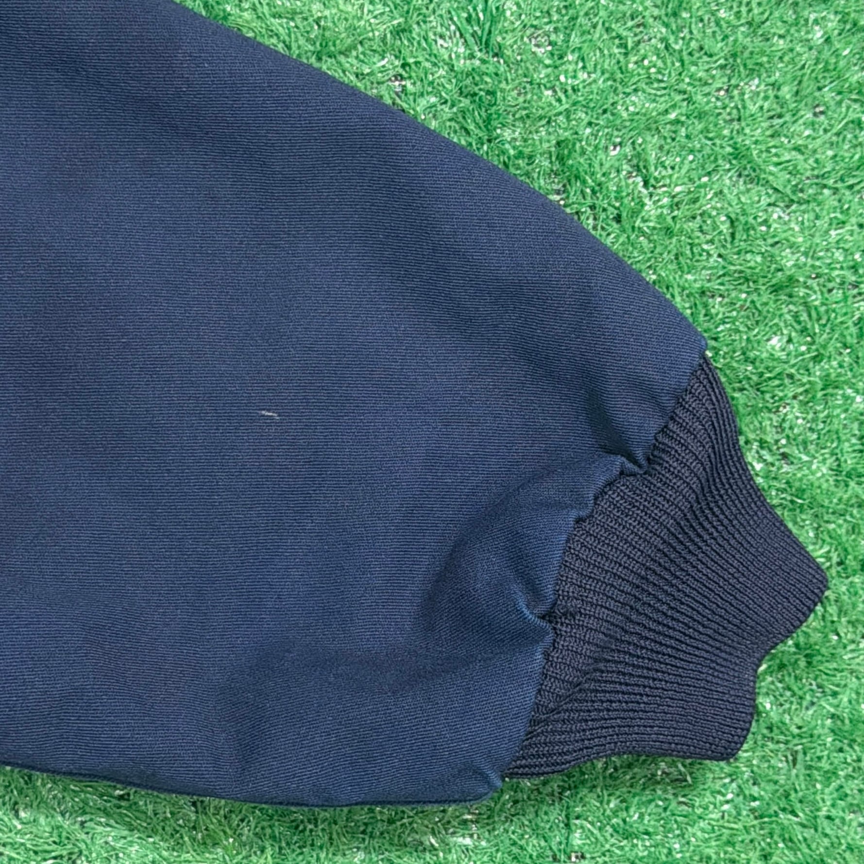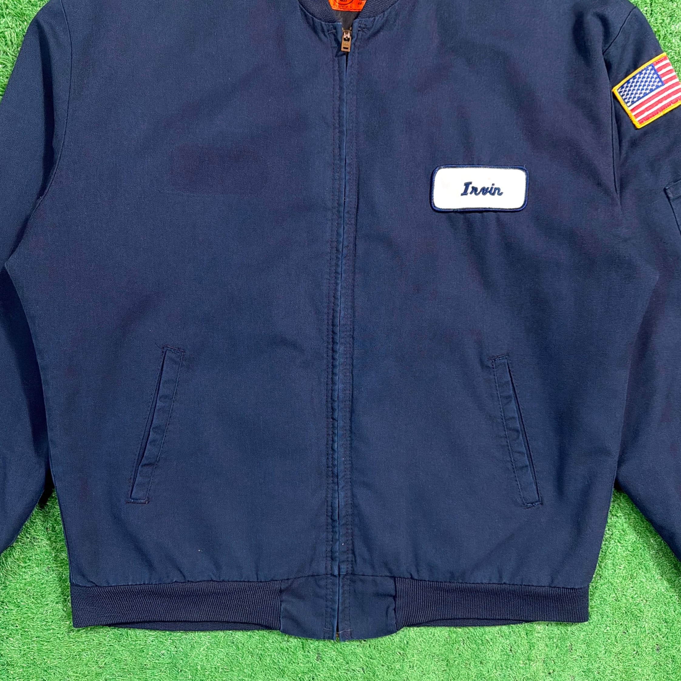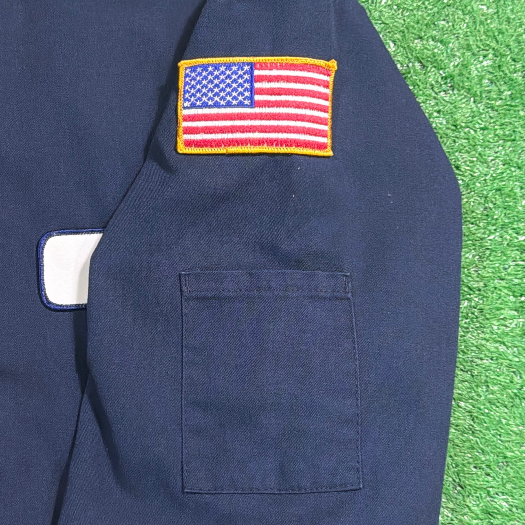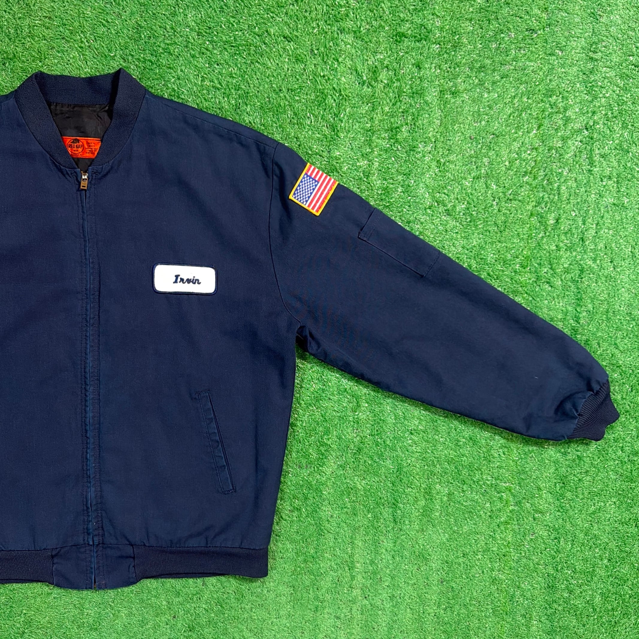ネイビーのしっかりしたワーク生地に、胸の ネームワッペン と袖の アメリカ国旗パッチ がポイント。中綿は“厚すぎない”ライトな仕様で、重たくならずにラフに羽織れるバランスです。