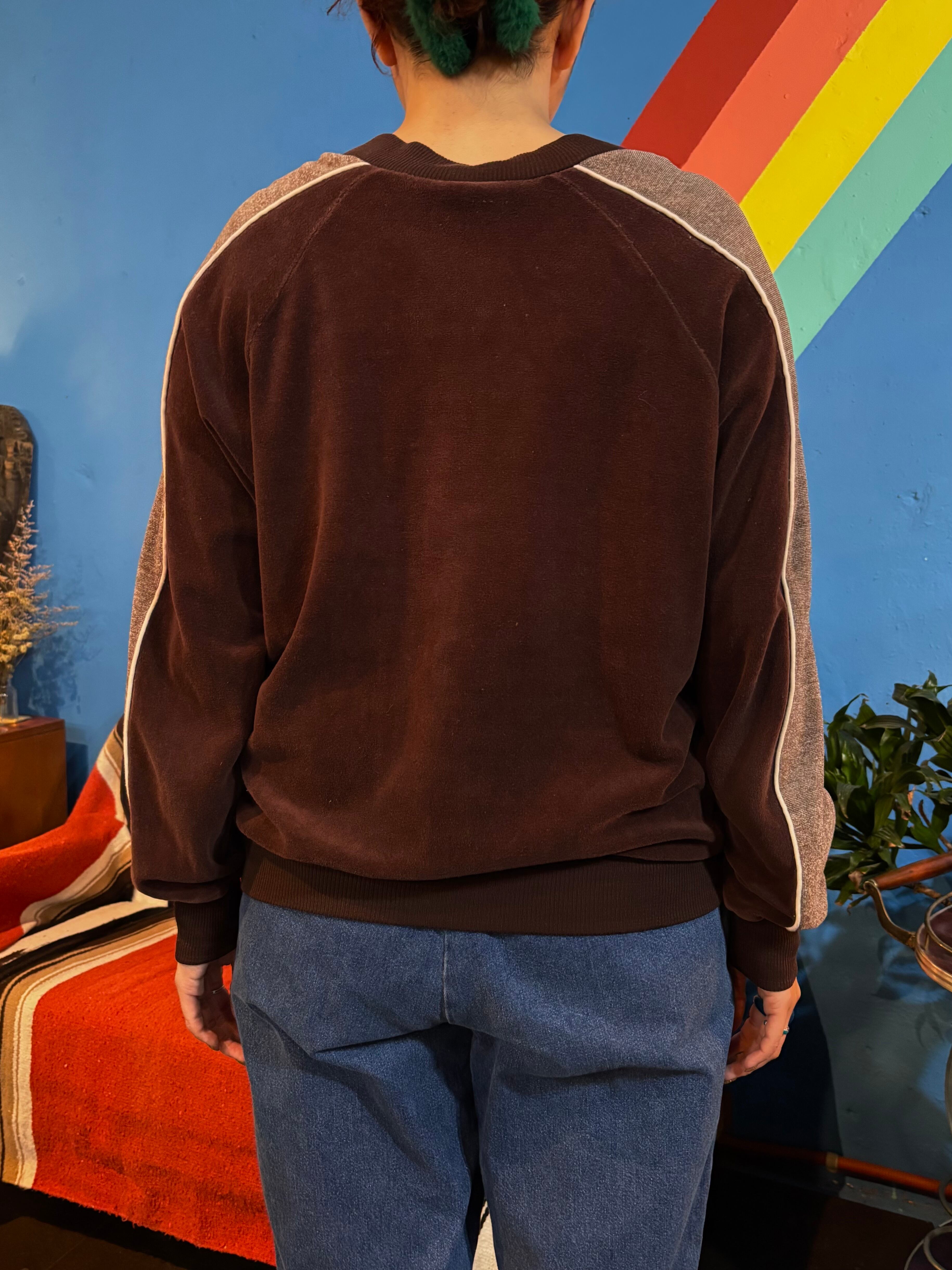 柔らかなベロアの光沢感と、肩にかけて落ちるラグランスリーブのシルエットが相まって、古着らしいゆるさと存在感をしっかり感じられる一着です。