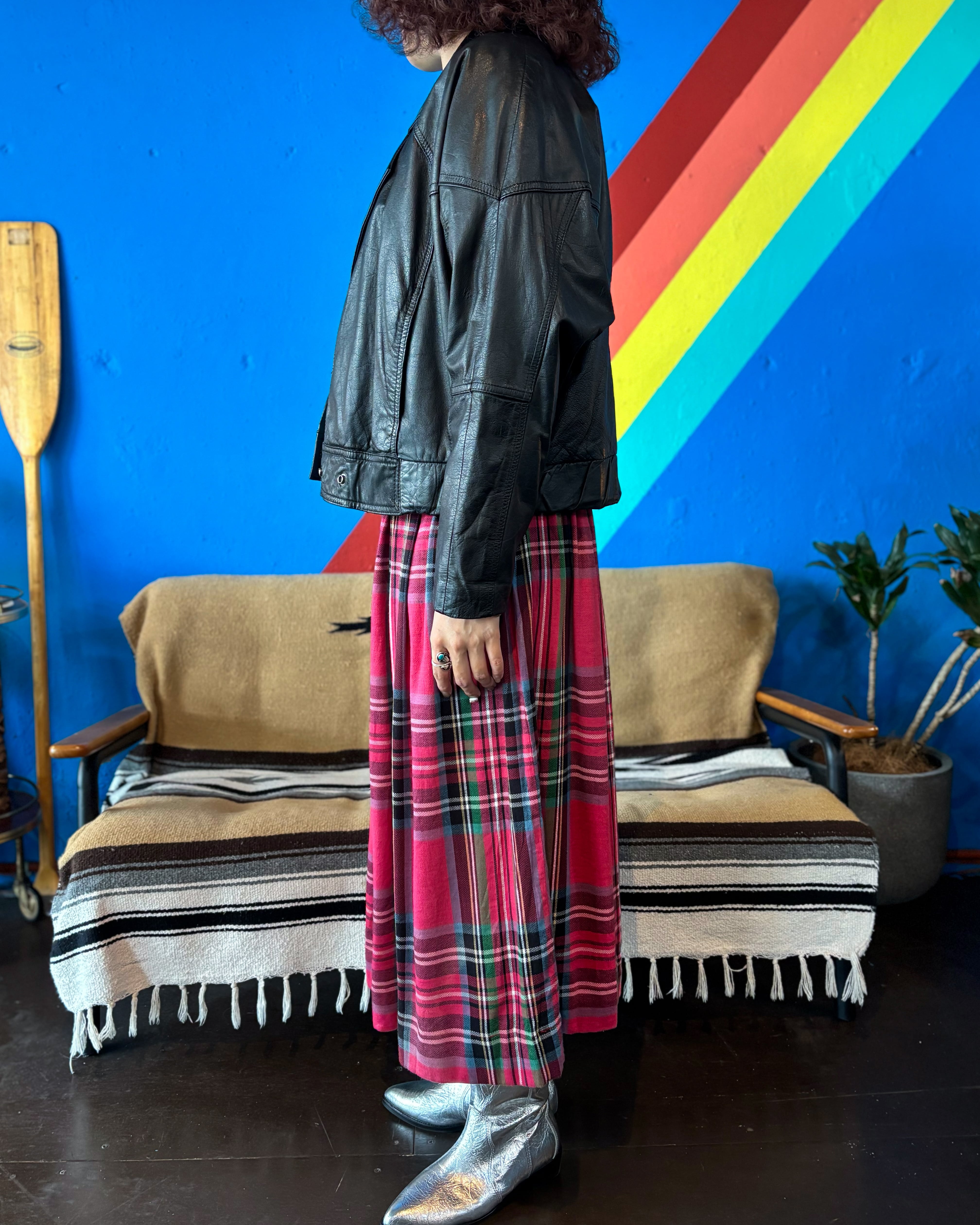80〜90年代のレザージャケットです。短丈で身幅が広く、ドルマンスリーブ気味の独特なシルエットが魅力の一着。レザーは柔らかく、ほどよくくったりした質感で古着らしい風合いを楽しめます。裾に向かってキュッと引き締まるデザインで、スタイルにメリハリが出るのもポイント。ゆったりした作りのため、ユニセックスでも着用可能なサイズ感です。