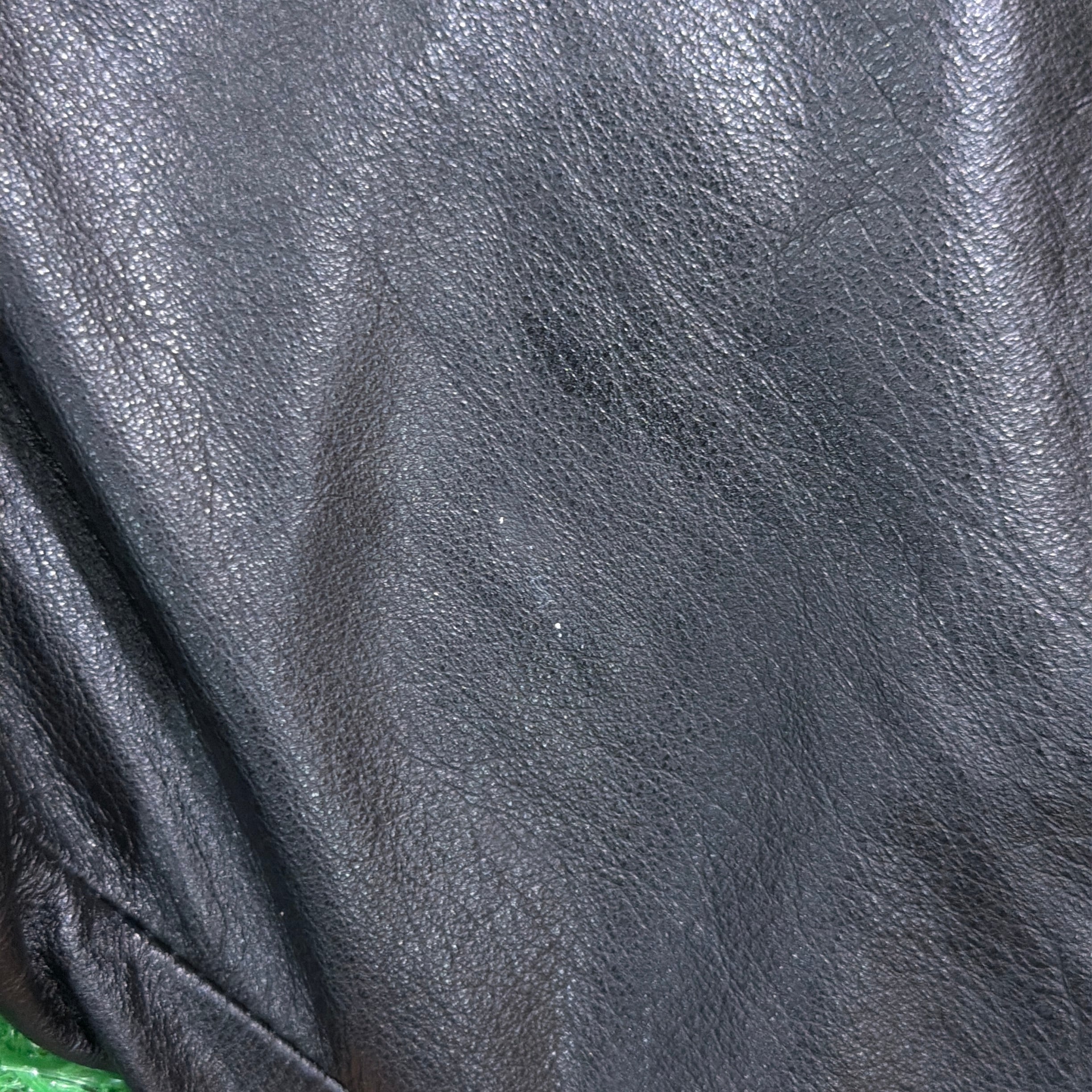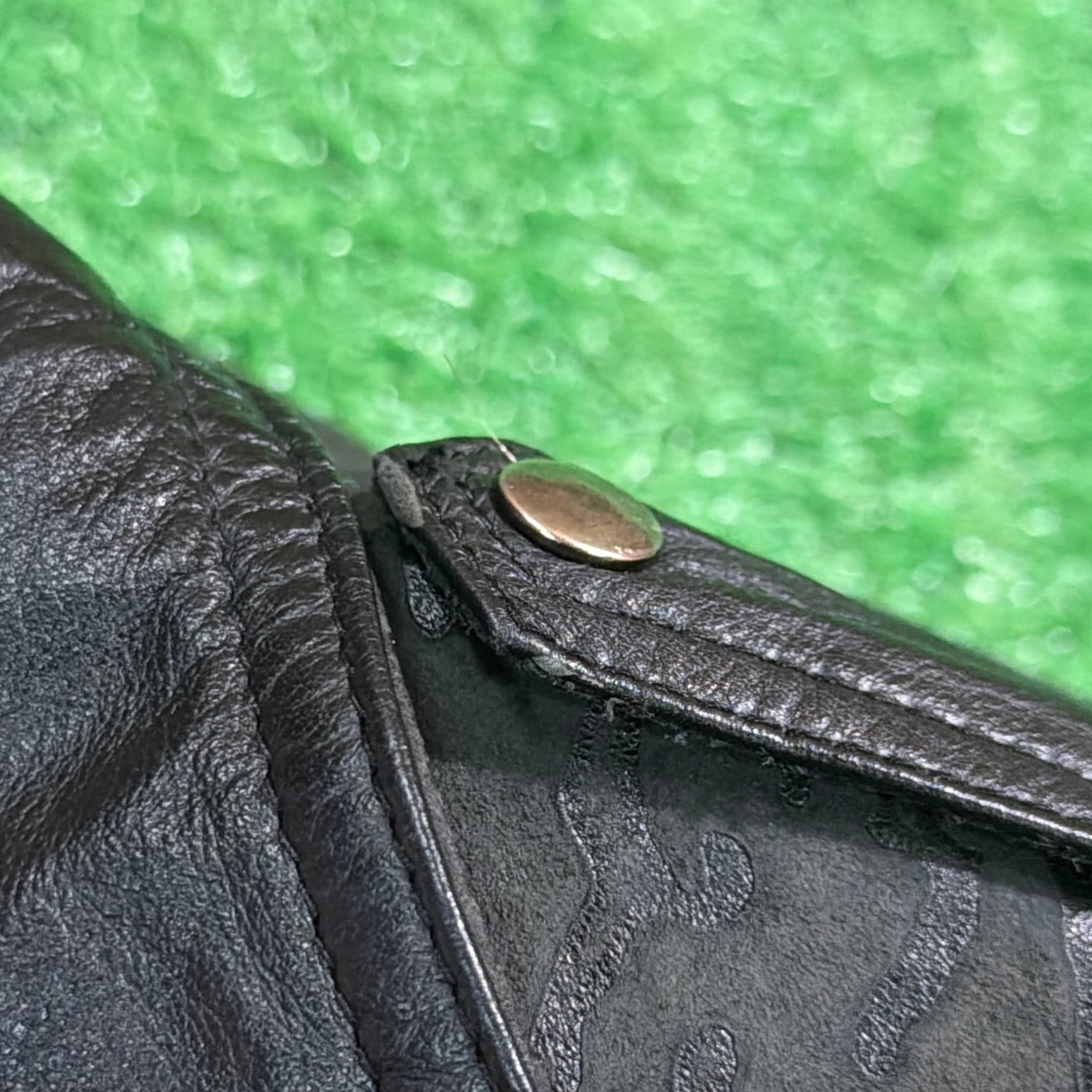 肩周りのレザーにはアニマル風の型押し加工が入っており、重くなりすぎず遊び心のある表情に仕上がっています。さらに胸元にはHarley-Davidsonのピンズ付きで、古着好きには嬉しいアクセント。