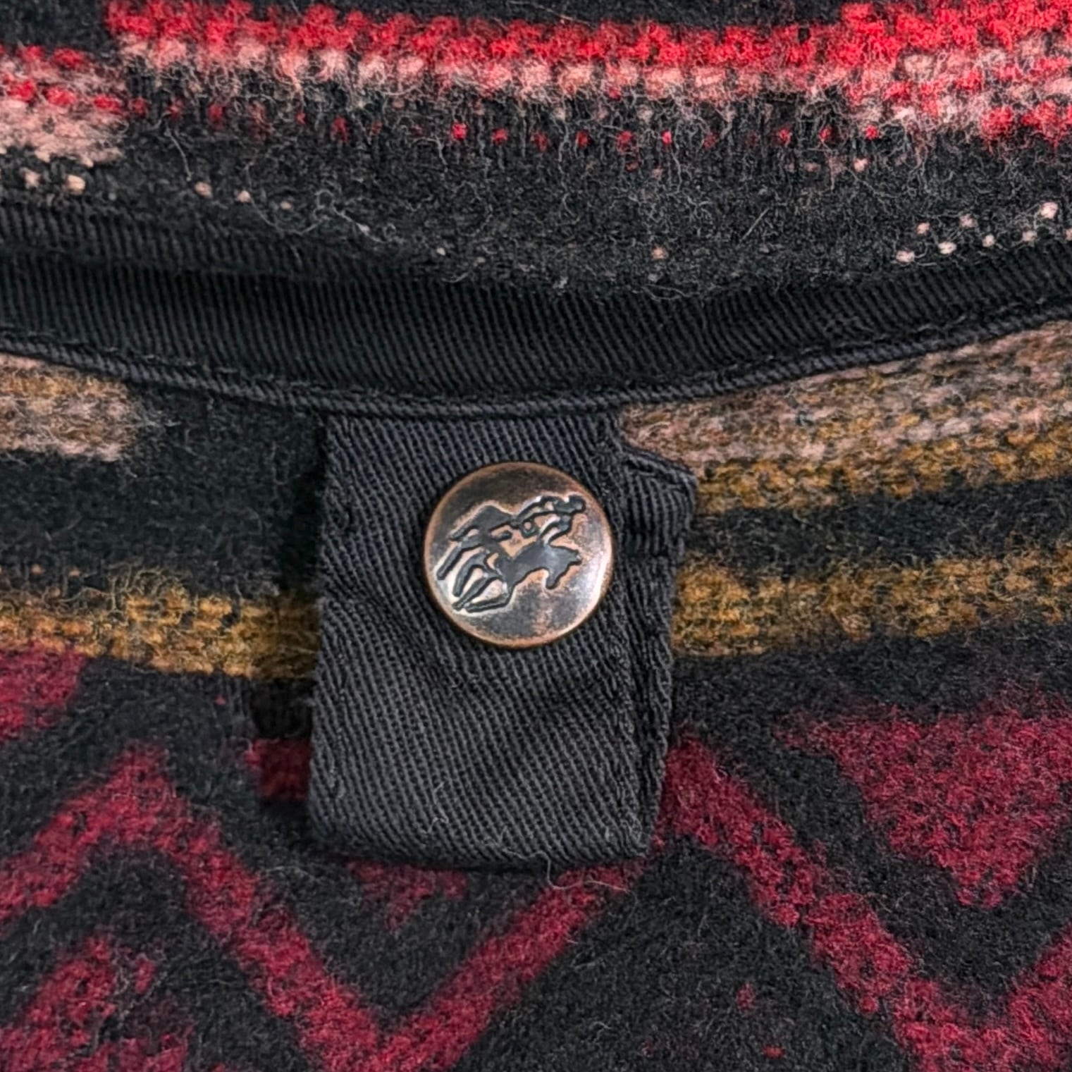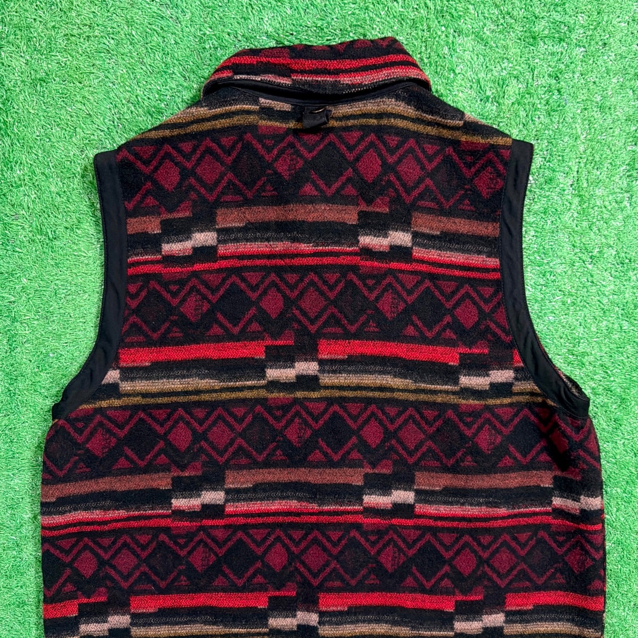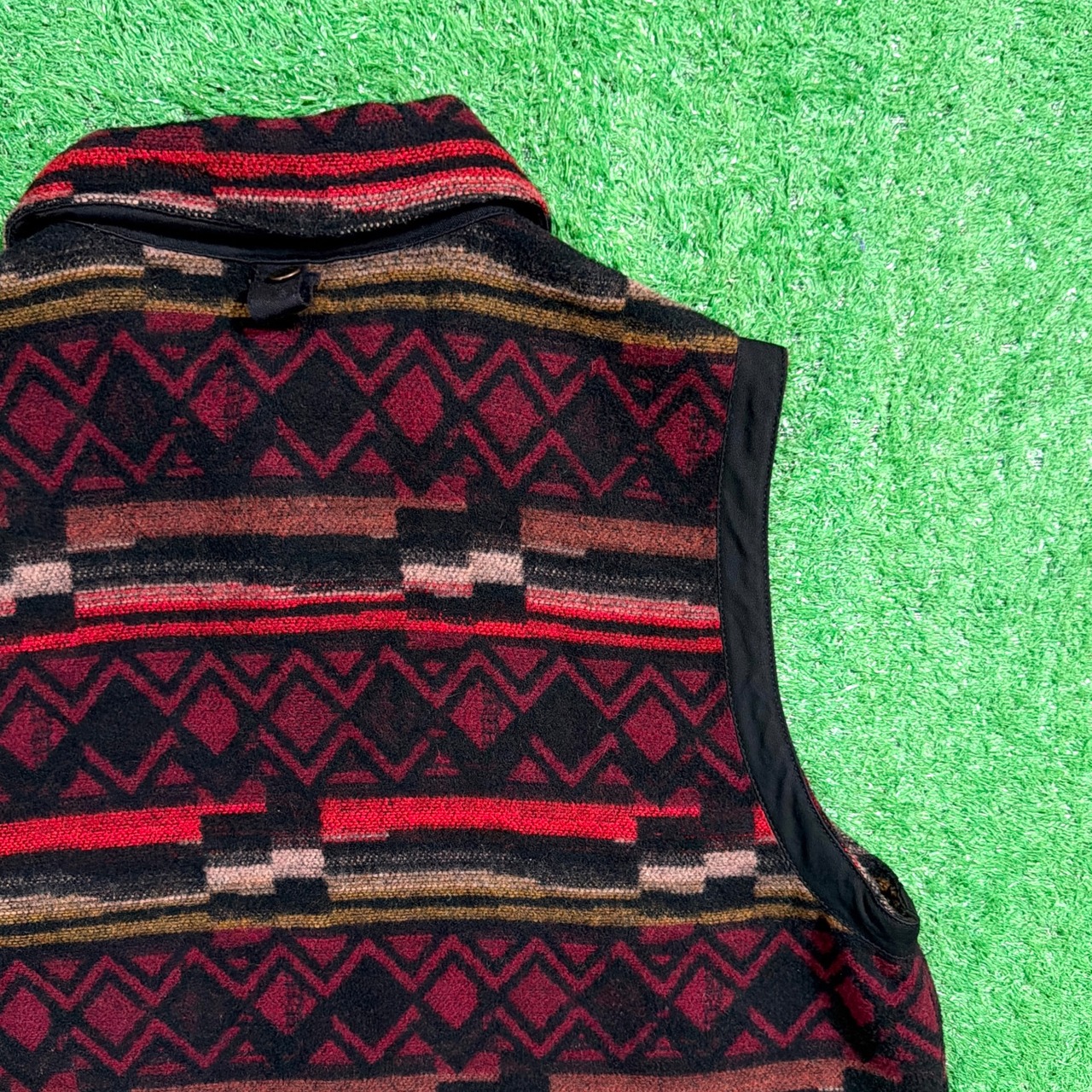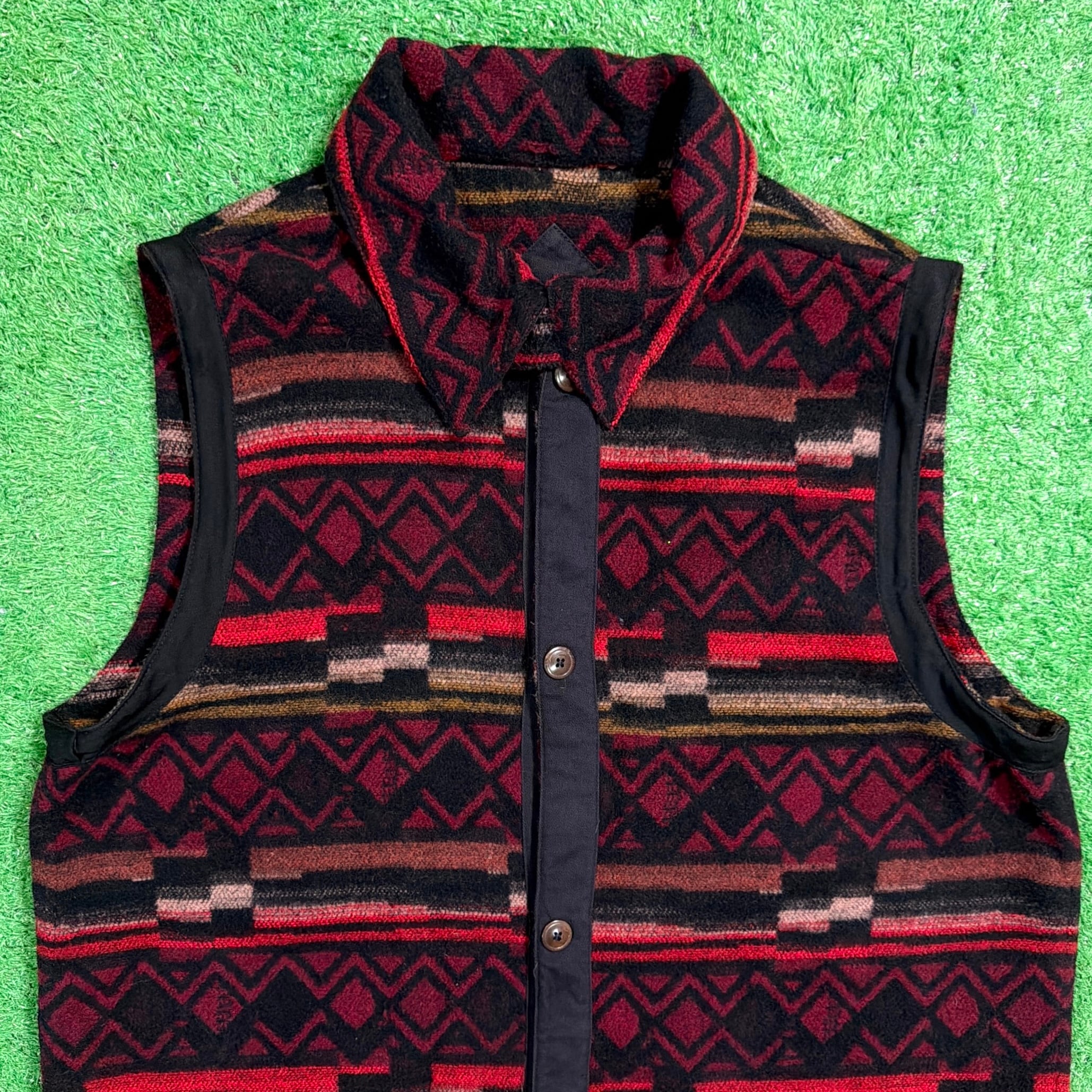 1990年代のネイティブ柄ベストです。しっかり厚みのある生地感で、ポリエステル ×ウールのあたたかみを感じる素材。前立てのテープ・襟の切り替えがアクセントになっており、古着らしい雰囲気のある一着です。