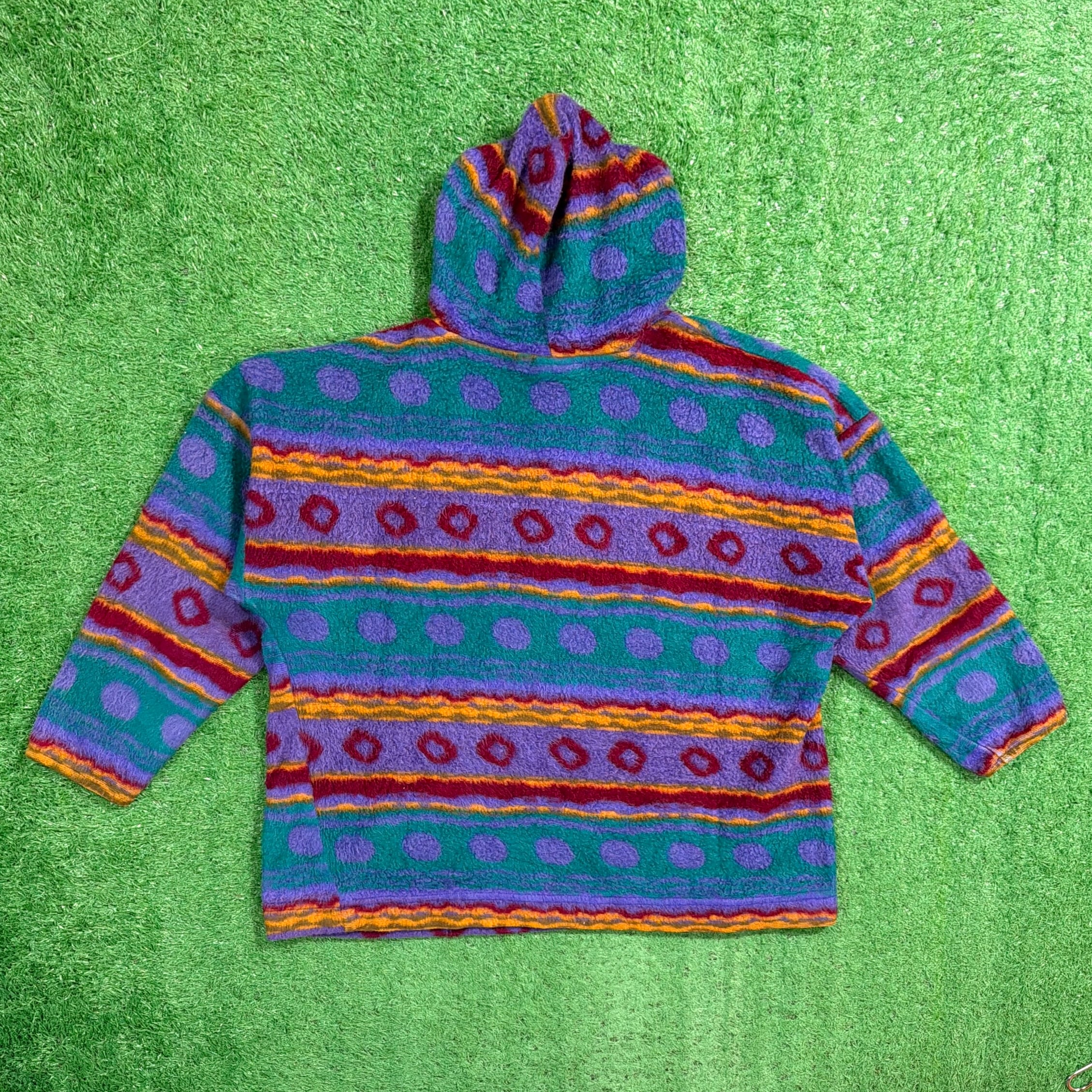 毛足の長めのシャギーフリース素材で、ふわっと軽くて暖かい着心地。パープル・ターコイズ・レッドなど、90sらしい鮮やかで個性的なカラーリングが魅力的です。ドロップショルダーのゆったりしたシルエットで、レディースアイテムですが大きめに着られるデザインです。袖丈が短めの作りで、レディース特有のバランス感もしっかり出ています。