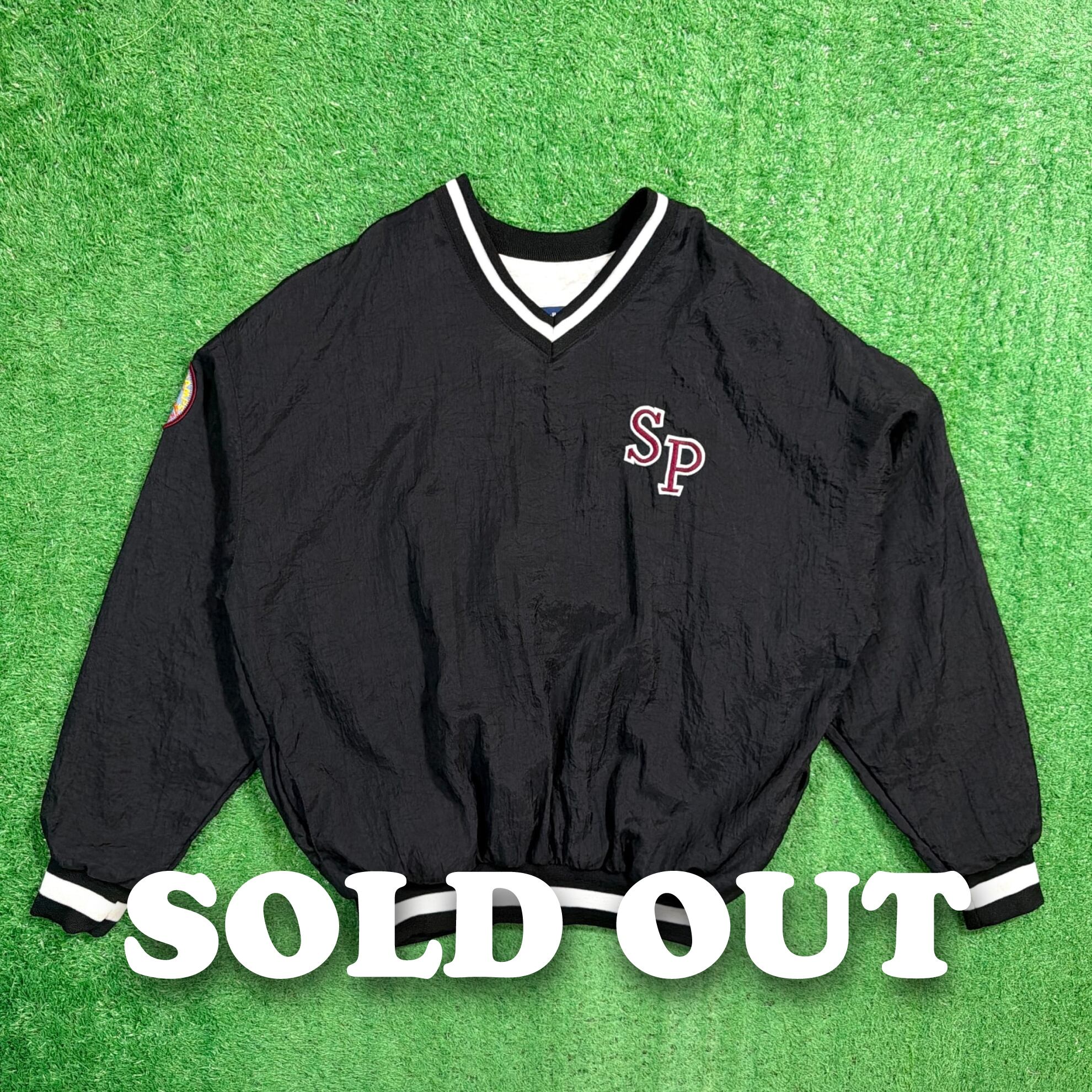 胸にはチーム頭文字の「SP」ワッペン、袖には “SLOW PITCH” とバット&ボールのワッペン、背面にはチーム名と思われる “SUCCAH PUNCH” の大きなロゴが入った存在感のある一枚。ハリのあるナイロン素材で、軽くてサラッと着られるスポーツ系トップスです。