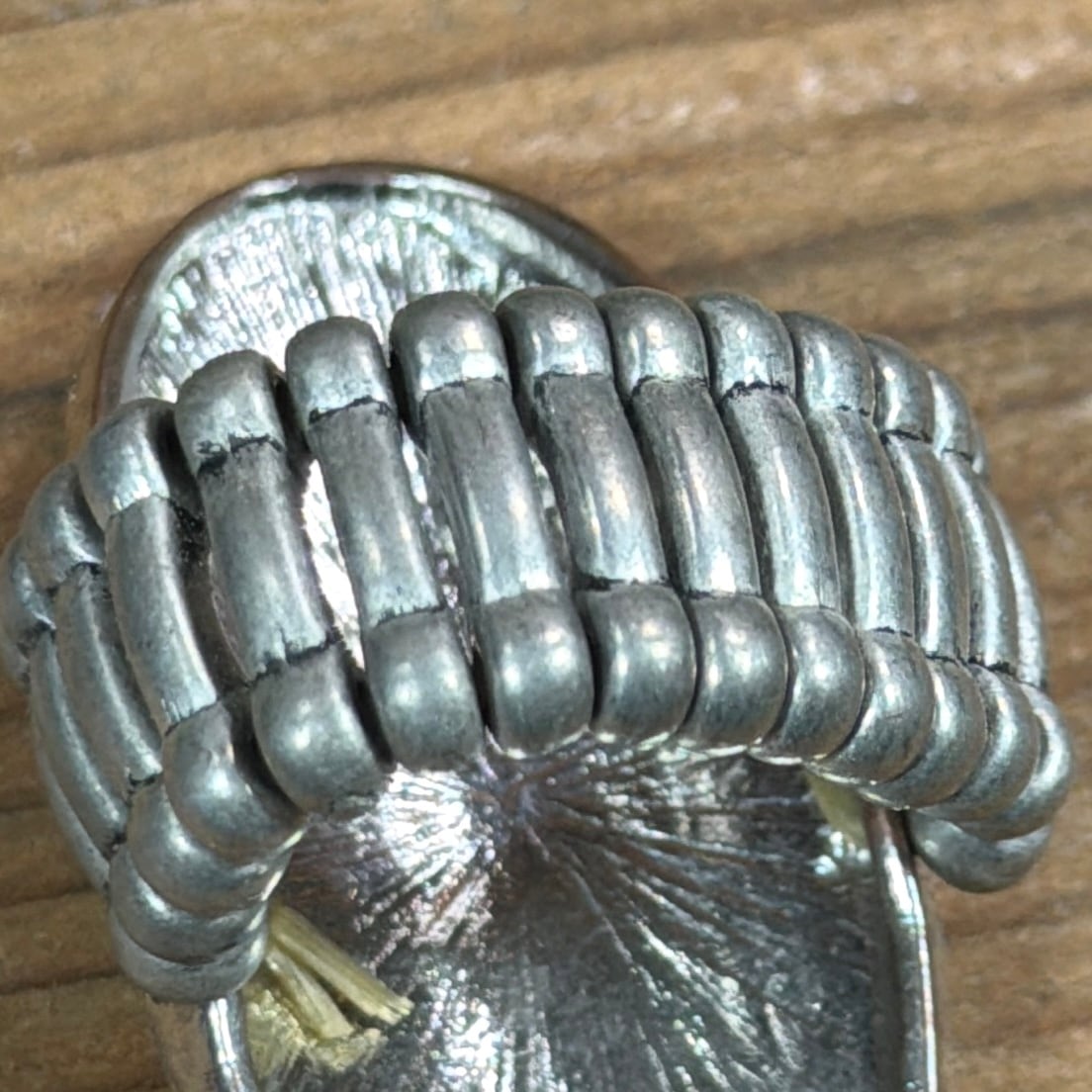 ベースはメタル調で、程よくヴィンテージらしい風合いを持った表情が魅力。バンド部分はゴム仕様になっており、指にフィットしやすく、気軽に着用できます。