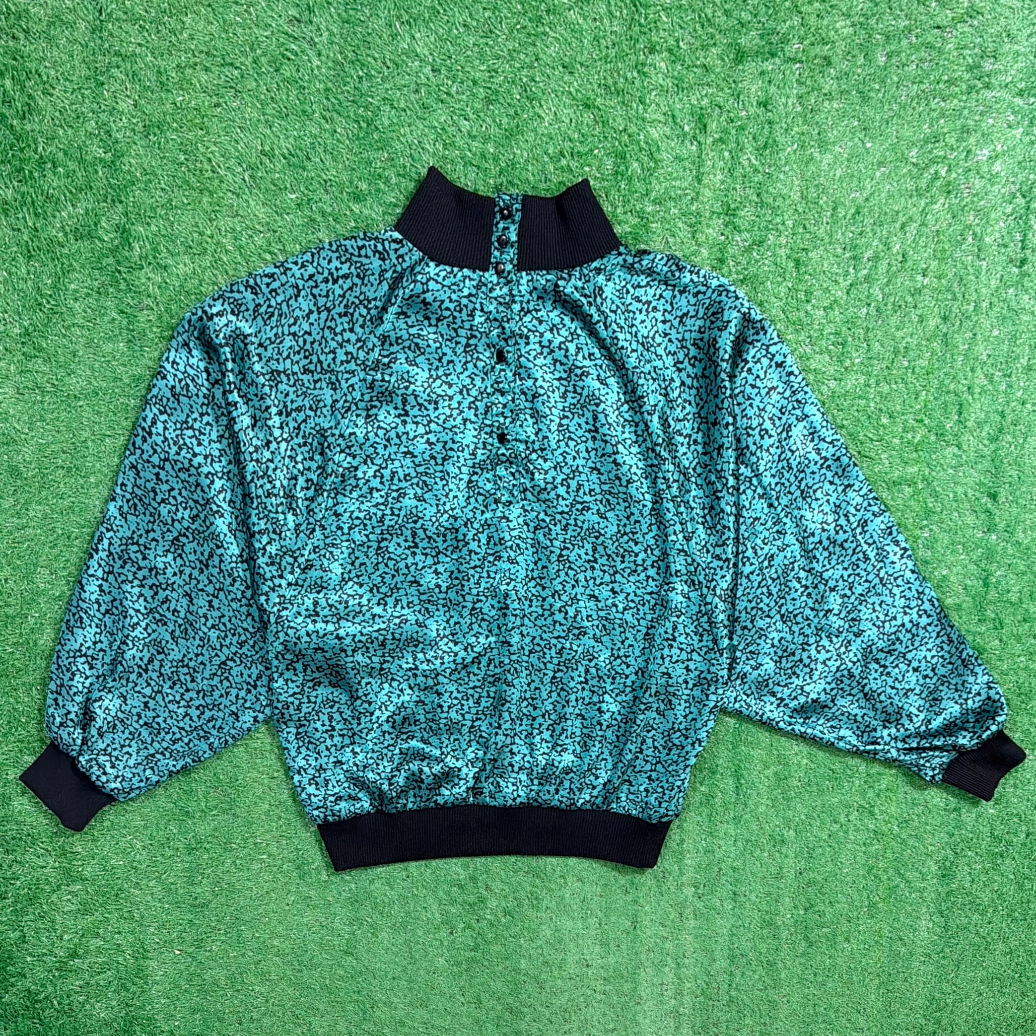 モックネックと袖・裾の太めリブがアクセントになり、シルエットにメリハリをつけてくれます。清涼感のあるカラーと抽象柄が80sらしい雰囲気をしっかり感じられる一枚です。
