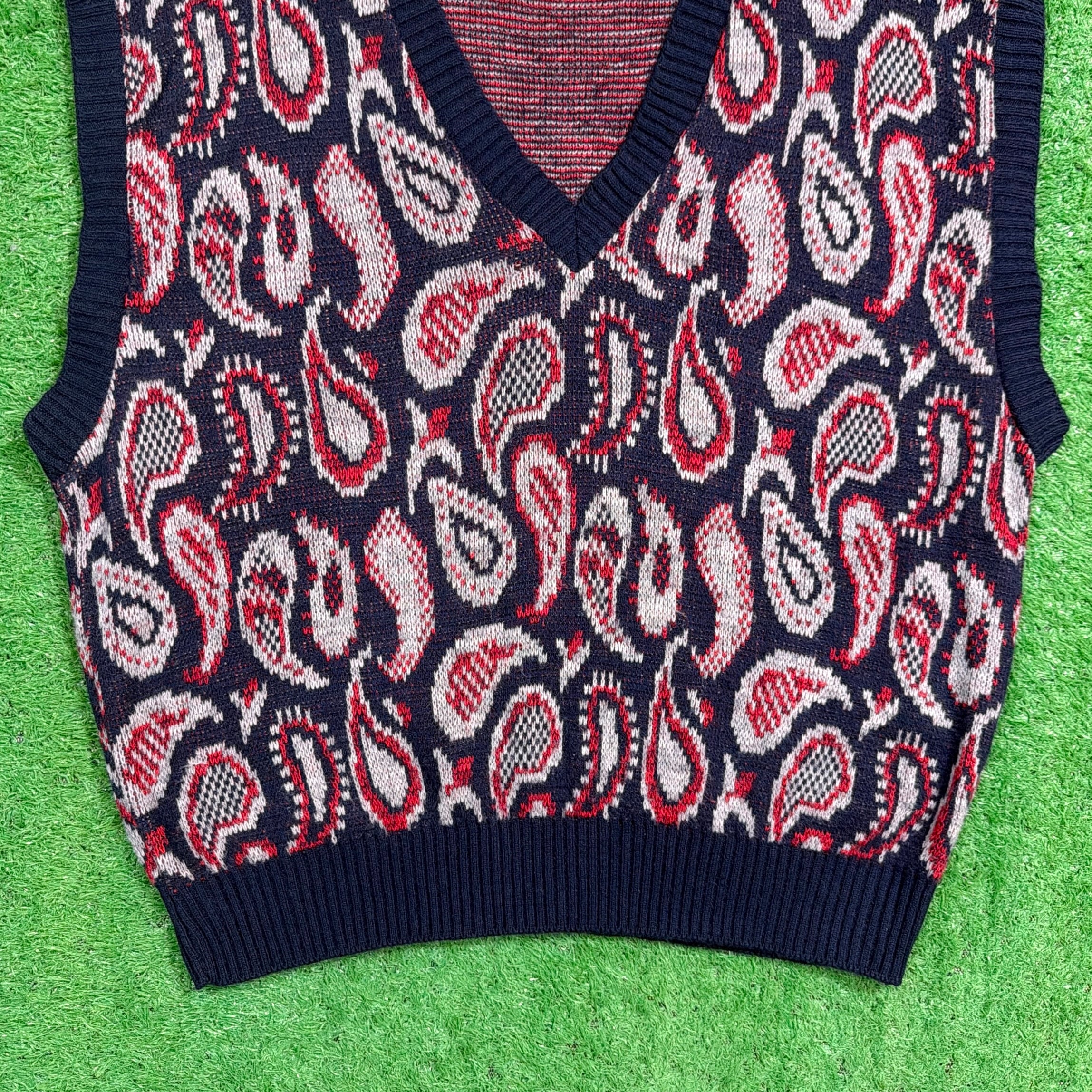 1990年代のアメリカ製、ペイズリー柄が存在感抜群のニットベストです。深めのVネックと総柄デザインが90sらしい雰囲気で、コーディネートの主役になる一着。