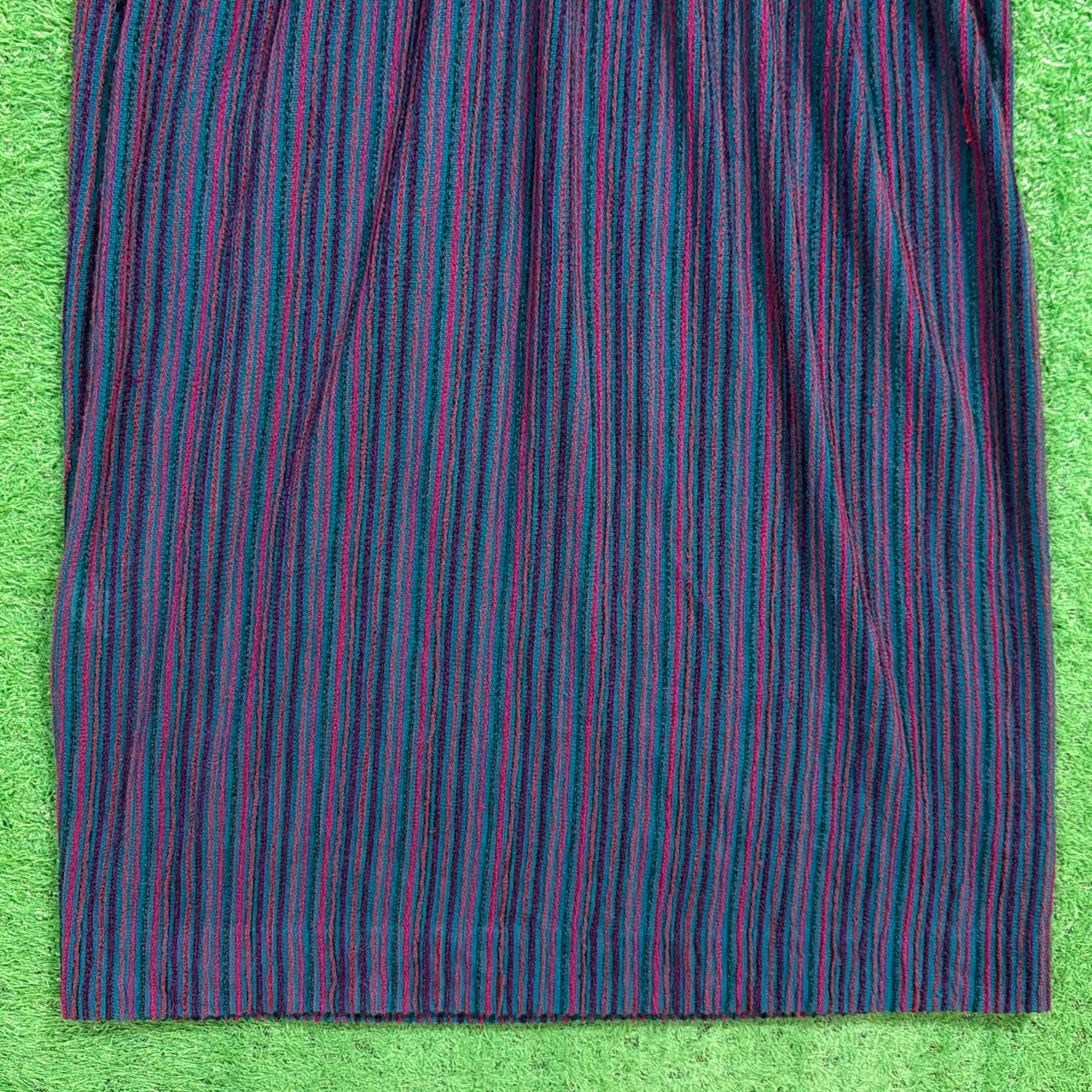 ボディラインを拾いすぎないリラックスしたシルエットに、ウエストはゴム仕様で自然にメリハリがつくデザイン。柔らかい素材感で着心地も良く、レトロな配色ボーダーが70sらしい雰囲気を放っています。
