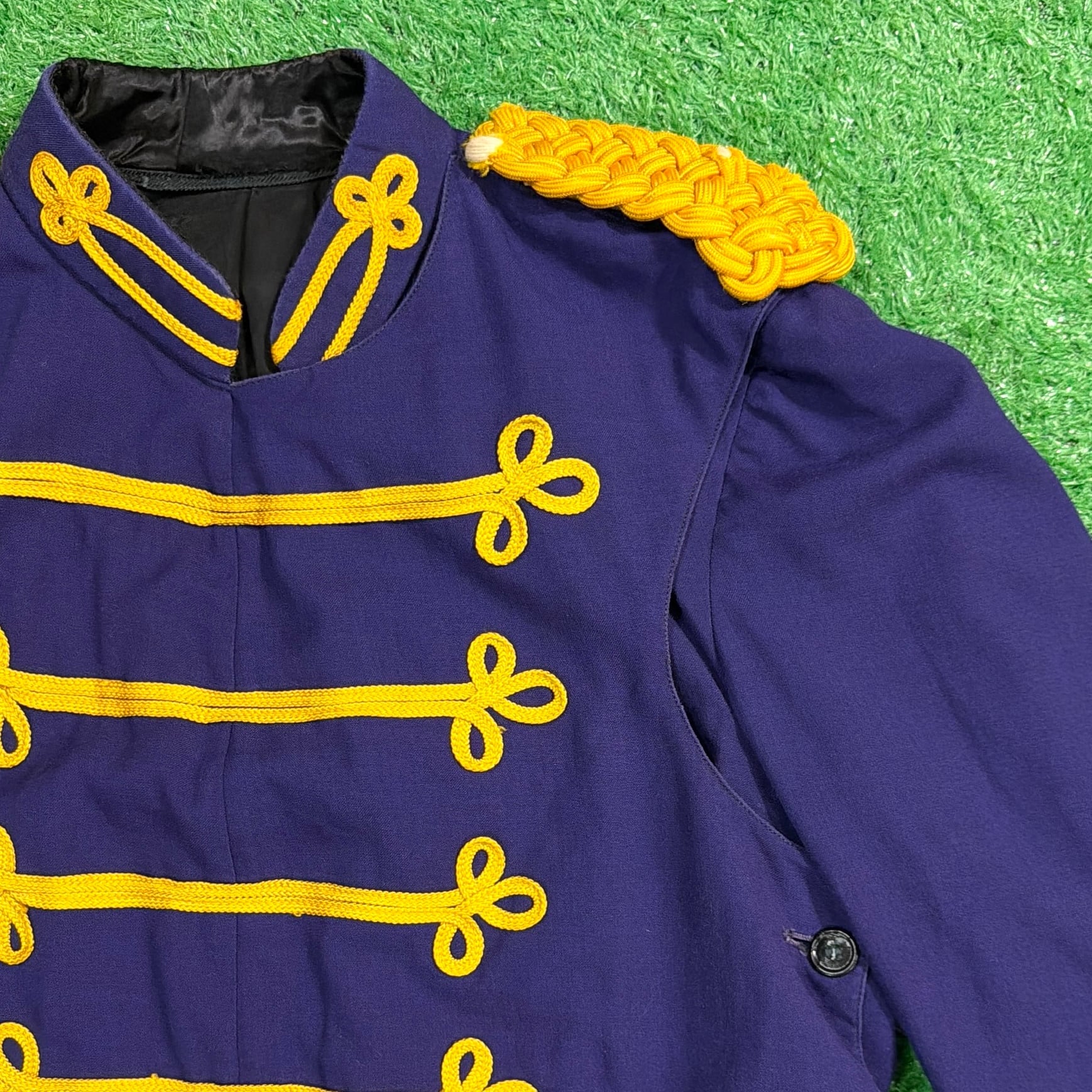 1960〜70年代ごろのナポレオンジャケットです。深いパープルにゴールドの装飾が映える、存在感のある一着。エポレットやフロントの飾りロープ、袖口の装飾など、ヴィンテージならではのディテールがしっかり残っています。ショート丈でバランスが取りやすく、当時らしいバンド衣装風のデザインが魅力的です。