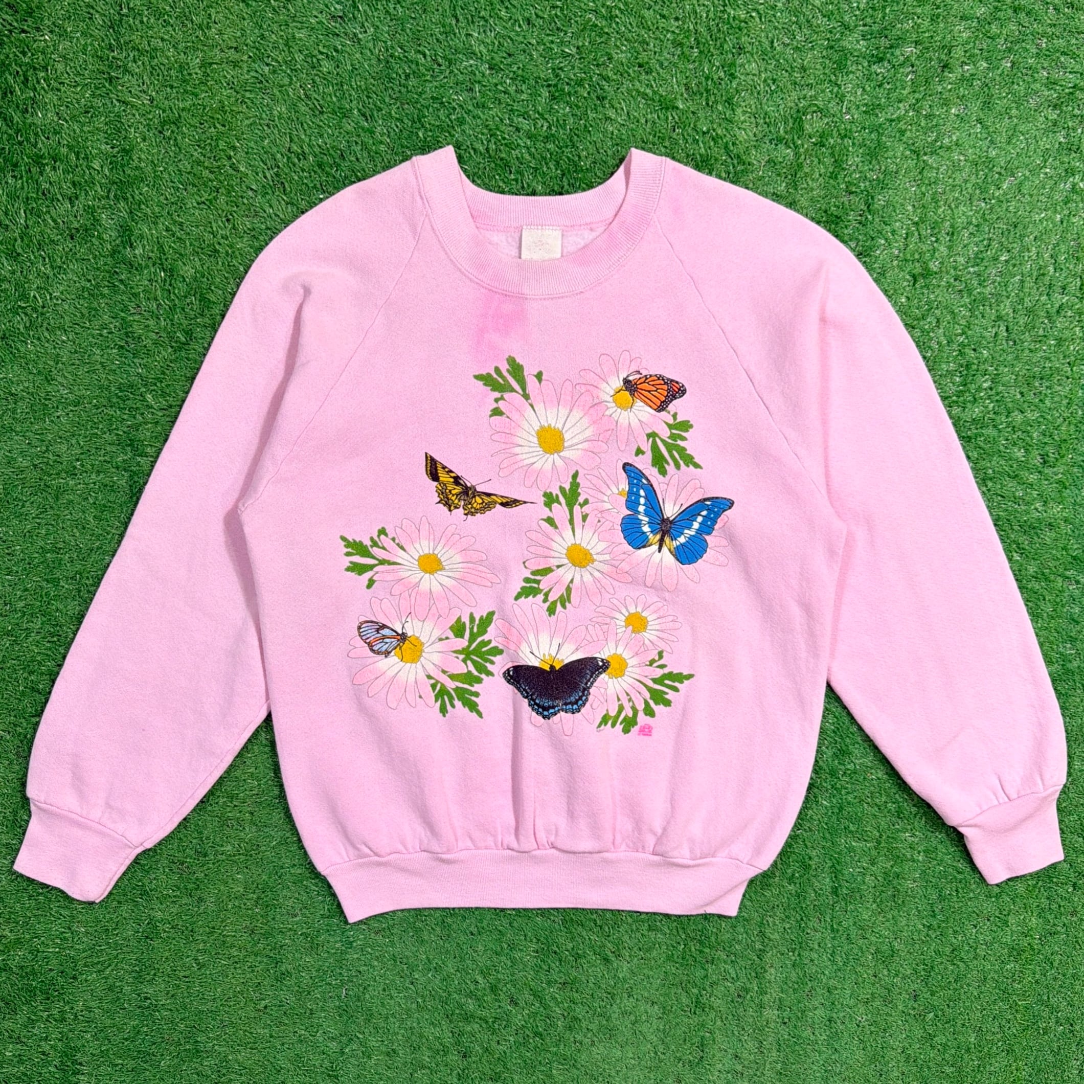 【Lady's】 80s 蝶々 イラスト スウェットシャツ / 80年代 スウェット スエット トレーナー ピンク 古着 レディース ラグラン 1304