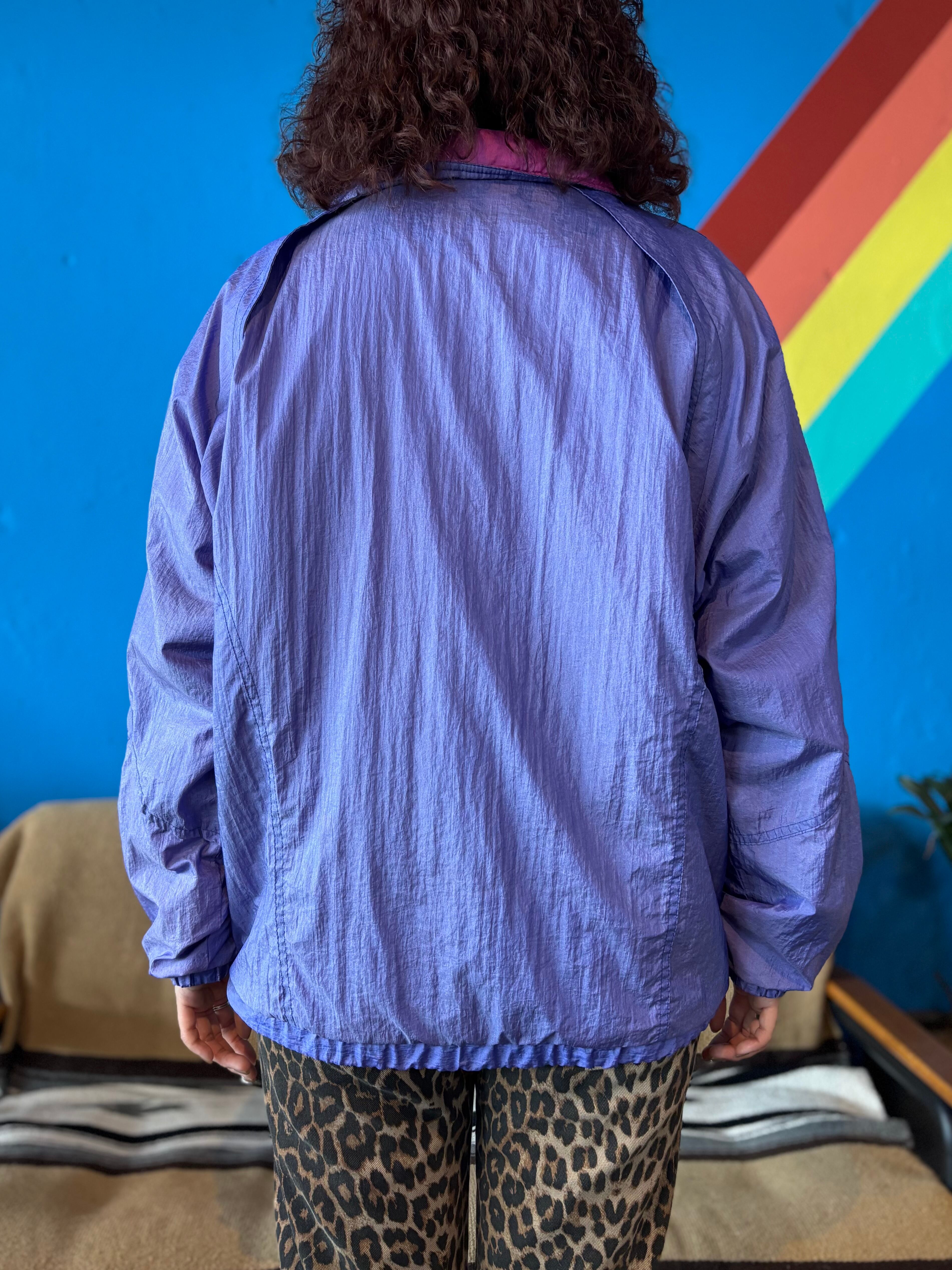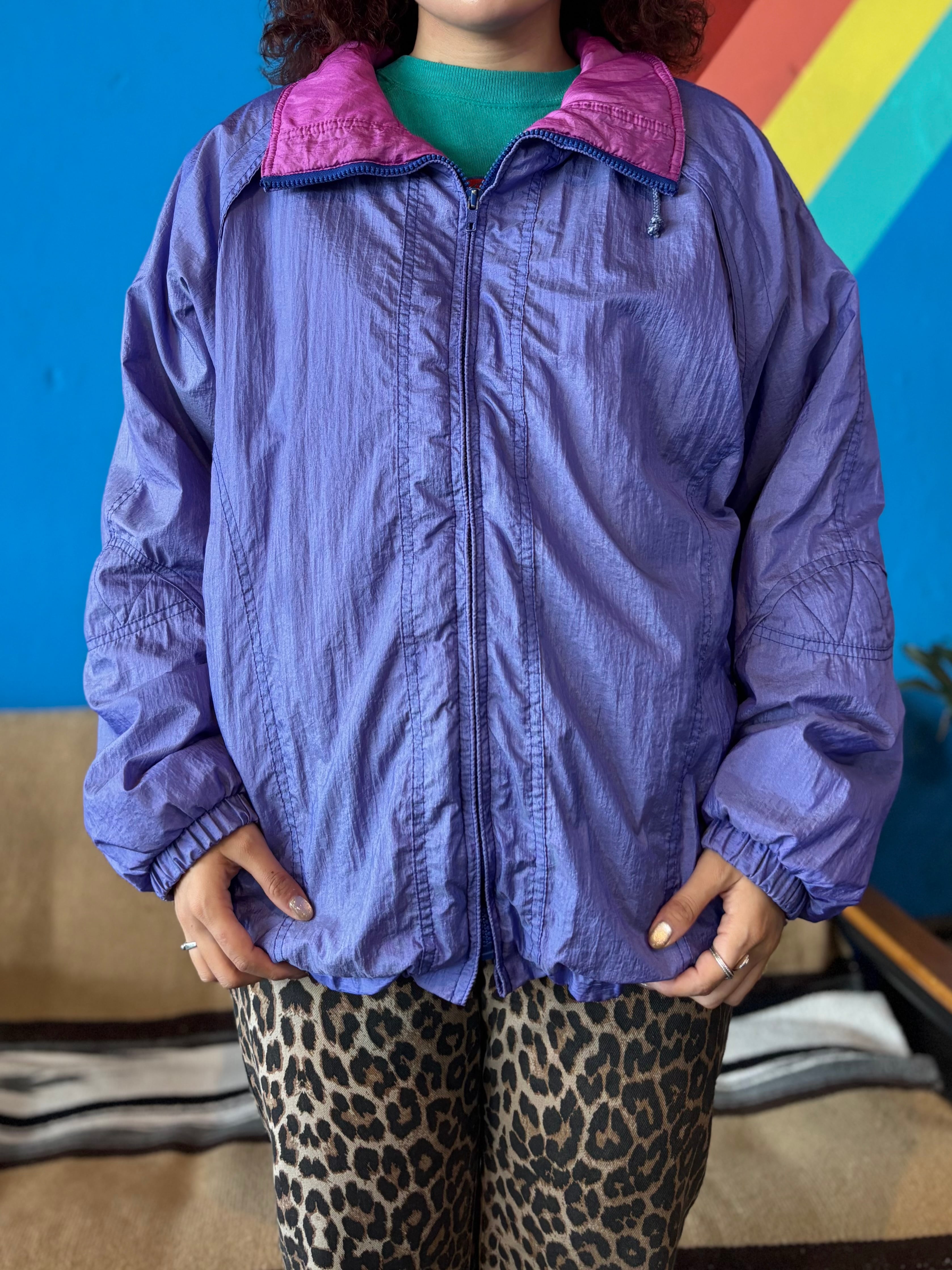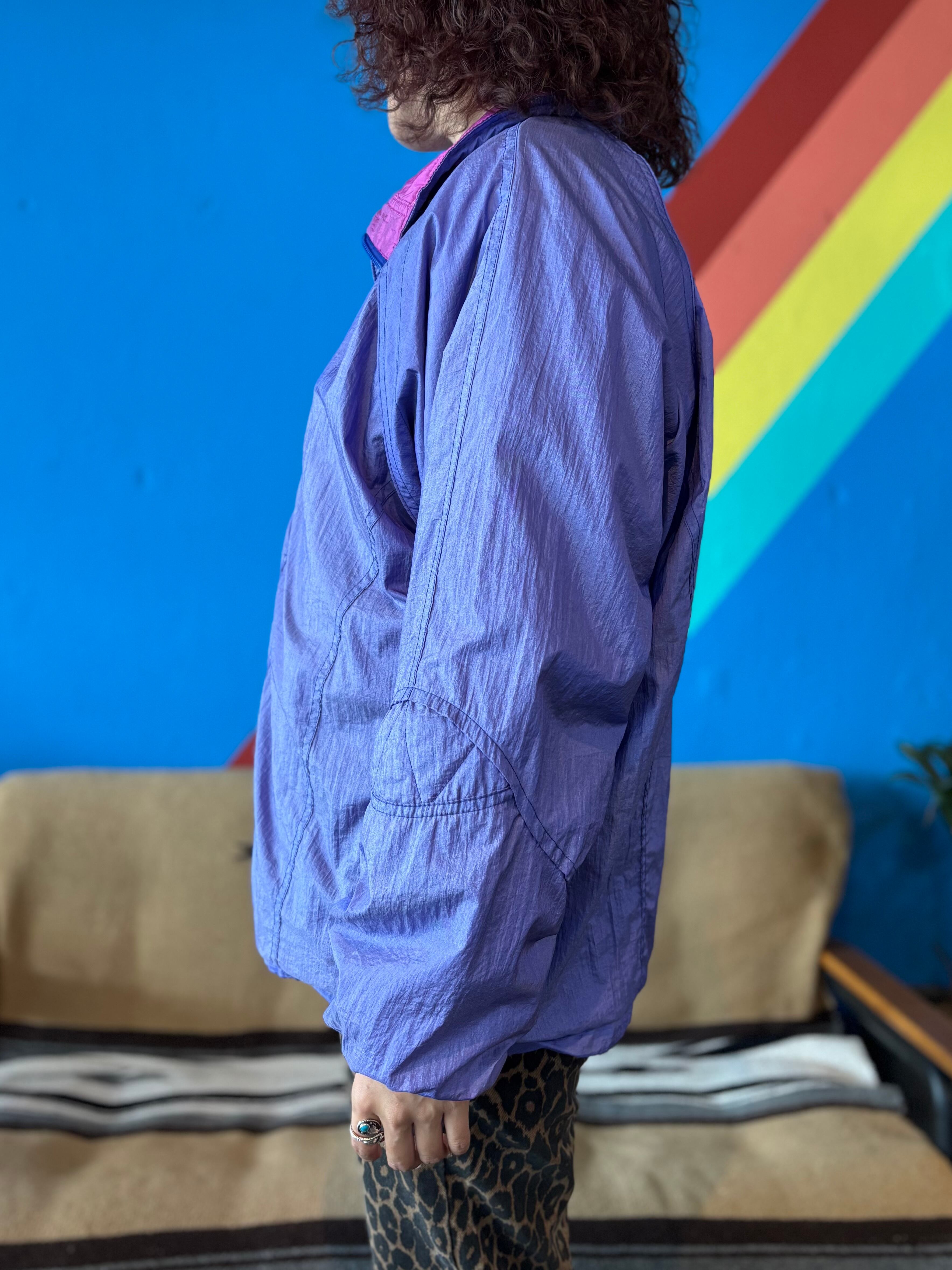 表地は軽量ナイロンで、内側にはモコっと厚手のフリースライナーが付いた、暖かさ抜群の一着。パープル×ピンクの90sらしいカラーリングが可愛く、ほんのりスポーティでレトロな雰囲気に仕上がっています。ハイネックデザインで首元までしっかり防寒できるのも嬉しいポイント。デイリーで気軽に羽織れる、アウターとして使いやすいアイテムです。