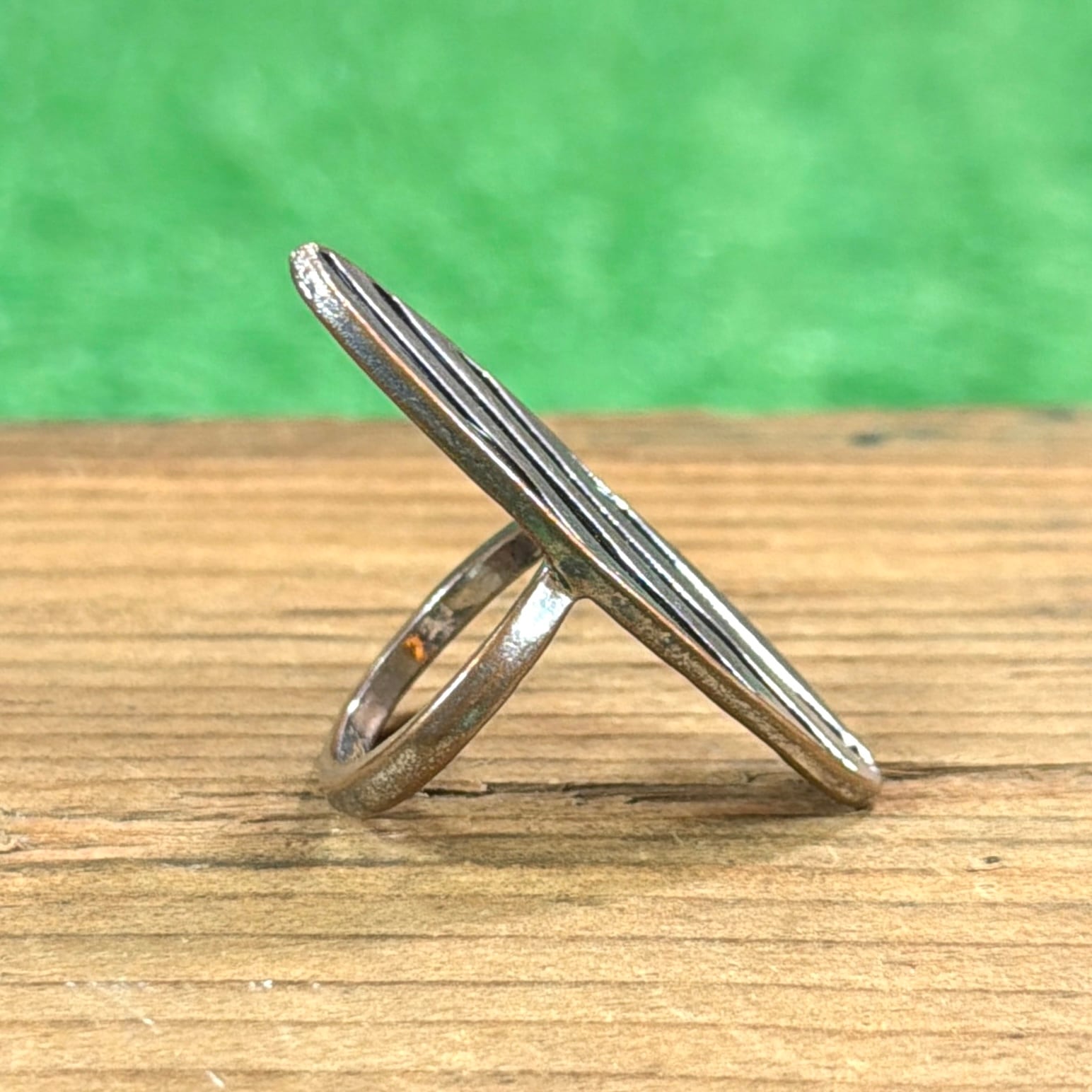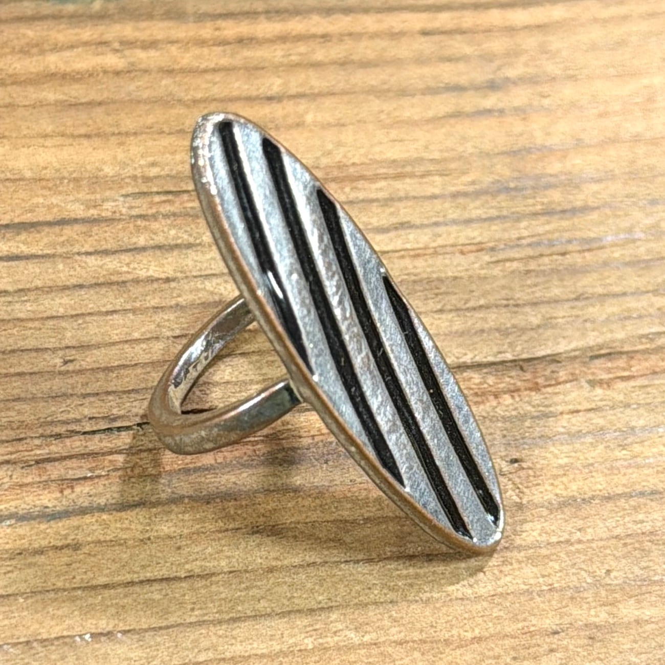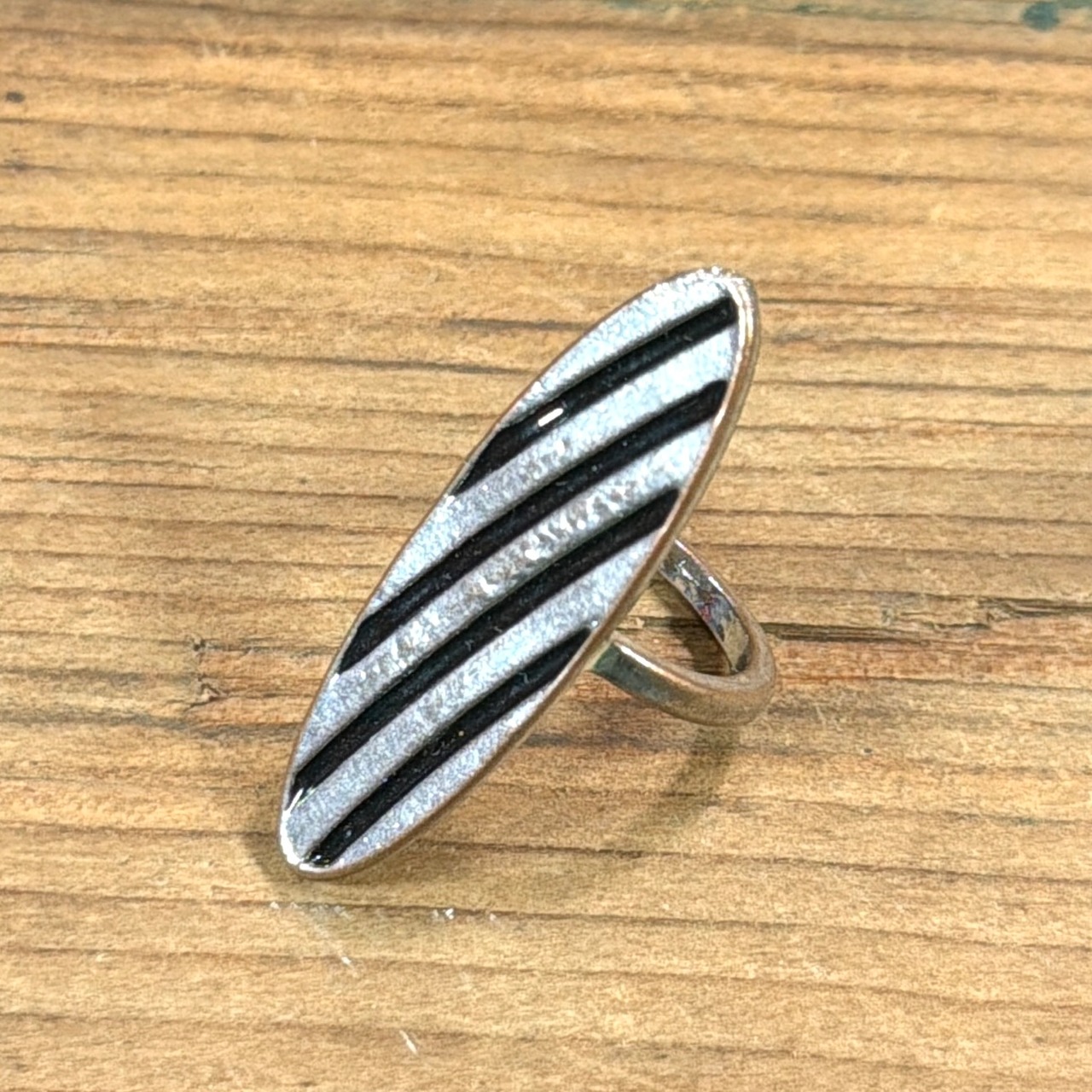 細長いオーバル(楕円)型トップに、縦方向のラインデザインが施されたリングです。