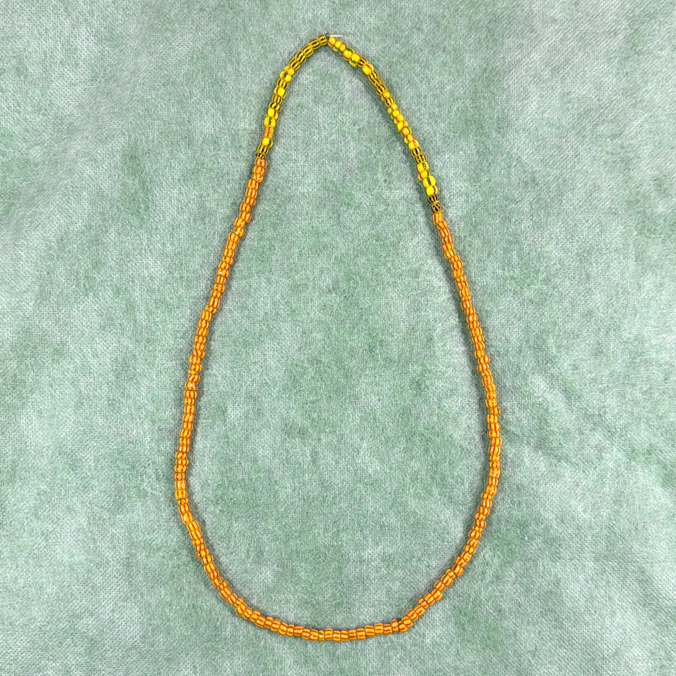 ビーズはハンドメイドならではの揺らぎがあり、イエロー×ブラックのストライプが程よい存在感。ナチュラルなコードの風合いも相まって、民族調・ボヘミアン・ストリートなど幅広いスタイルに馴染む一本です。
