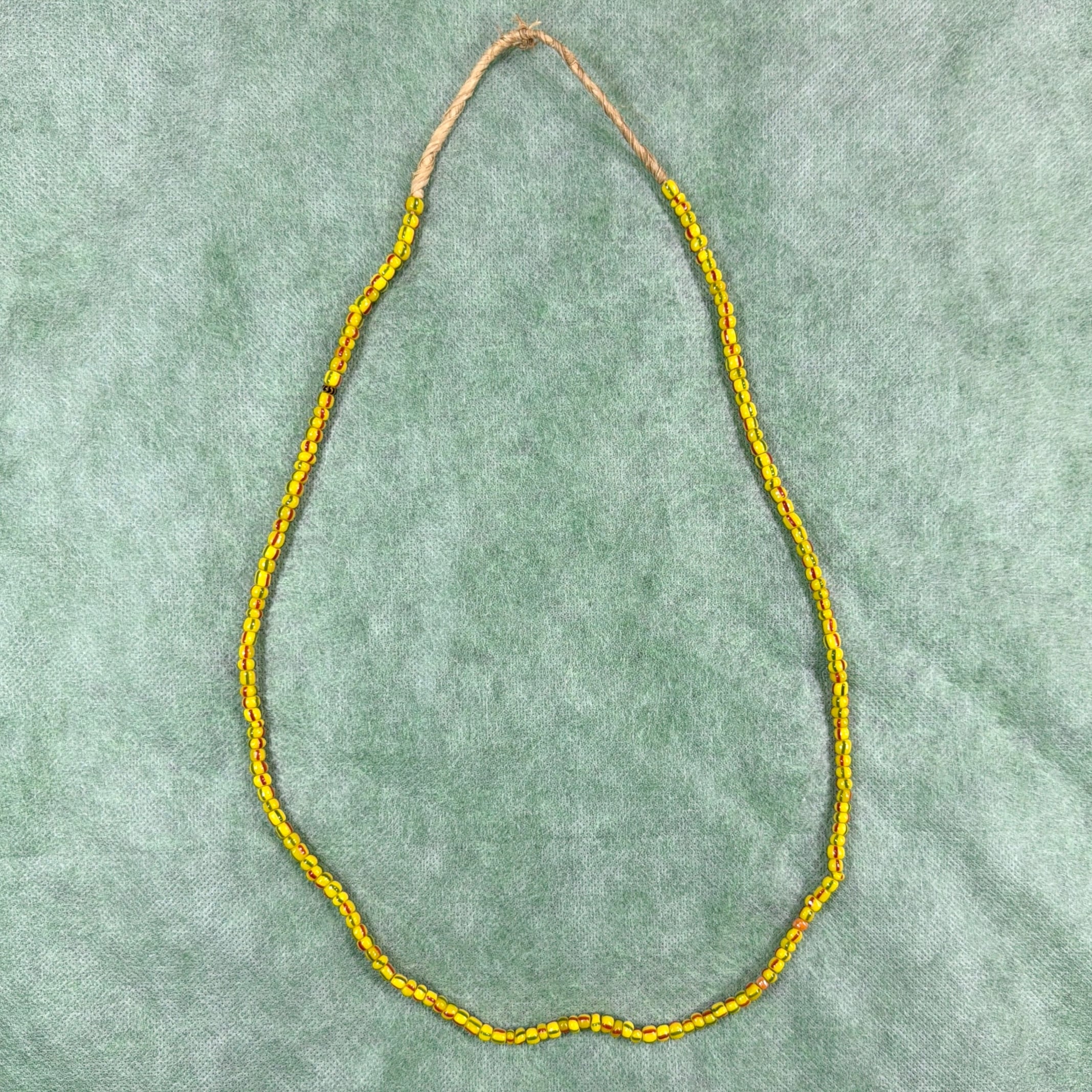 ビーズはハンドメイドならではの揺らぎがあり、イエロー×ブラックのストライプが程よい存在感。ナチュラルなコードの風合いも相まって、民族調・ボヘミアン・ストリートなど幅広いスタイルに馴染む一本です。
