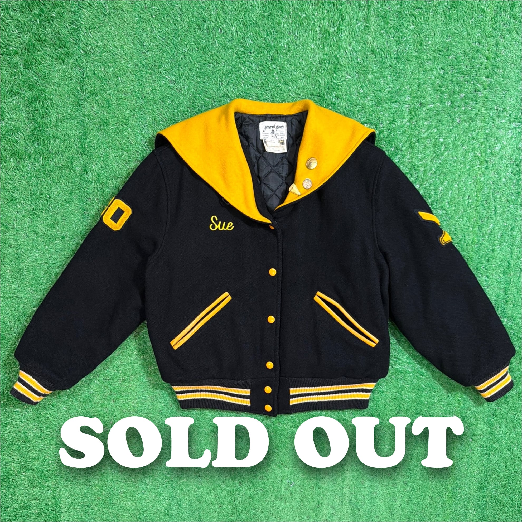 大きなセーラーカラーに鮮やかなイエローの切り替えが入ったデザインが特徴的で、バックには“Braves”の存在感あるロゴ刺繍。フロントには個人名の刺繍も入り、当時のチームウェアらしい特別感が感じられます。キルティング仕様の裏地に中綿が入っており、見た目以上にあたたかく着られるアウターです。ブラック × イエローの配色もクラシックで、70s〜80sの空気感をしっかり楽しめる一枚です。