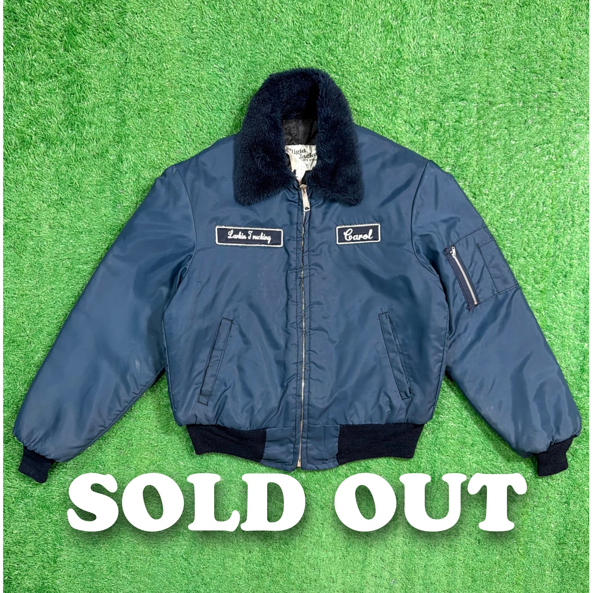 「Flight Jacket」の表記がありますが、ミリタリーではなく 民間ワーカー向けに作られた“フライトジャケット型”のナイロンブルゾン。中綿入りでしっかり暖かく、キルティング仕様の裏地、ボア付きの襟など、当時らしい武骨でタフな雰囲気が魅力です。