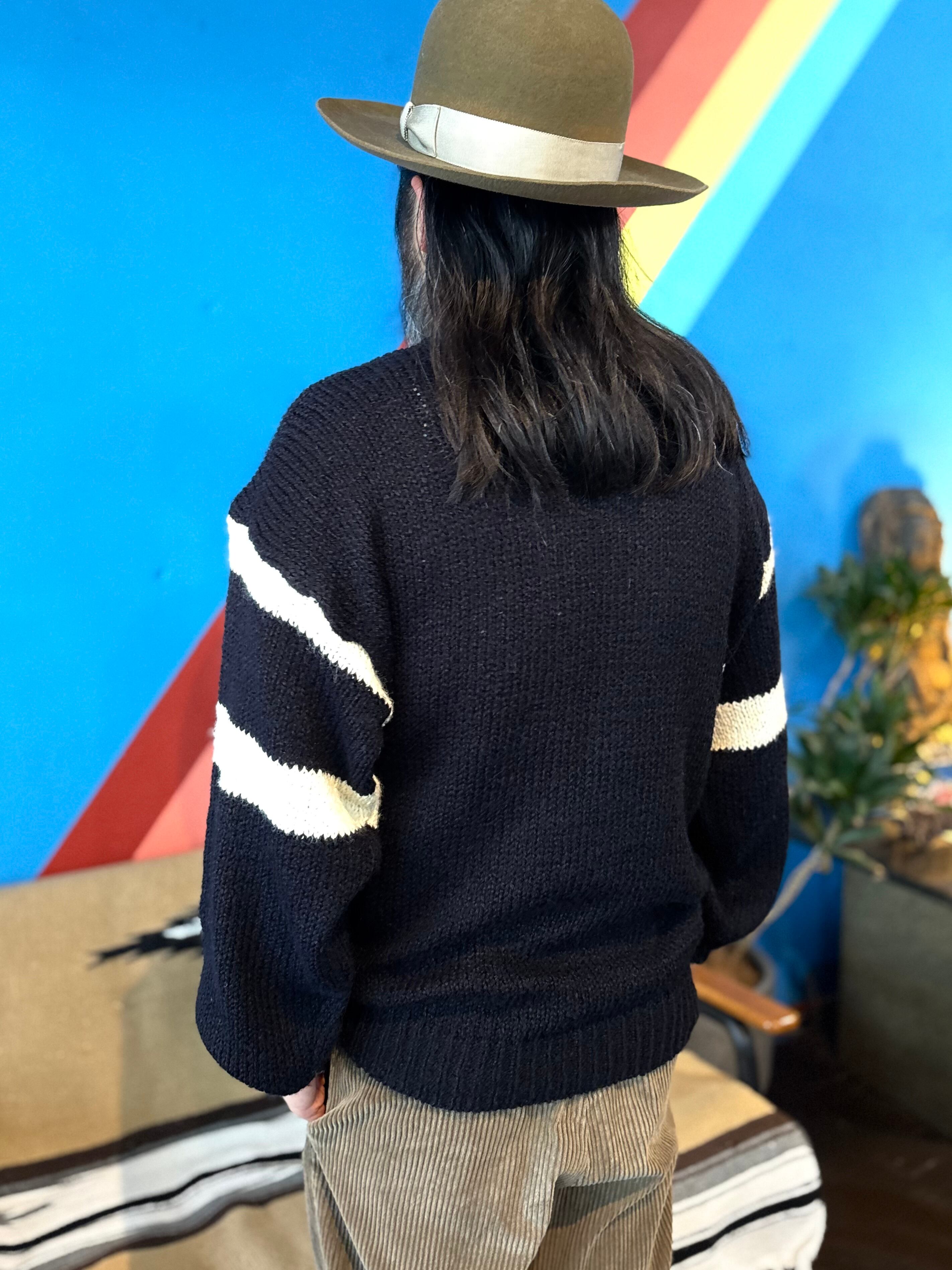 ブラックをベースにパターンが映える存在感のある一枚。ネイティブアメリカンテイストの幾何学模様がアクセントになり、90sらしい雰囲気をしっかり楽しめるデザインです。軽くて扱いやすいアクリル素材で、デイリー使いにもぴったりです。