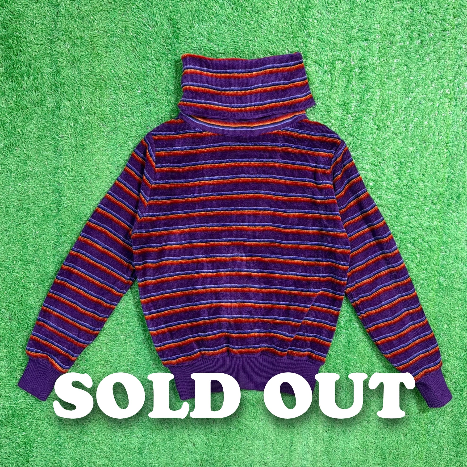 ゆとりあるタートルネックが存在感を引き立て、80sらしいレトロで個性的な雰囲気を楽しめます。