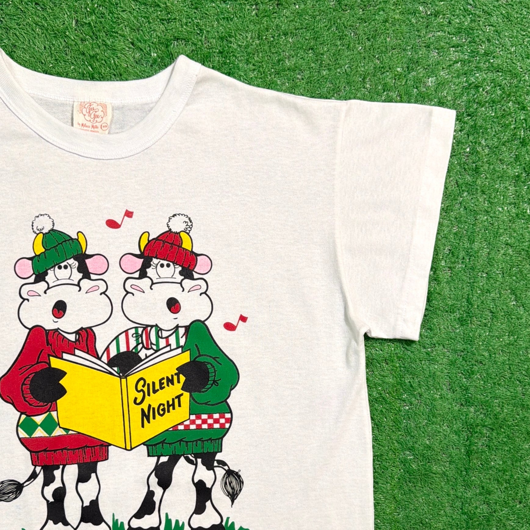 もこっとした表情のウシが歌っているほっこり可愛いイラストで、90sらしいユルさとユーモアが魅力の1枚。アグリークリスマス系のデザインですが、白ベースで着やすく、季節のイベントや冬のコーデにしっかりハマります。