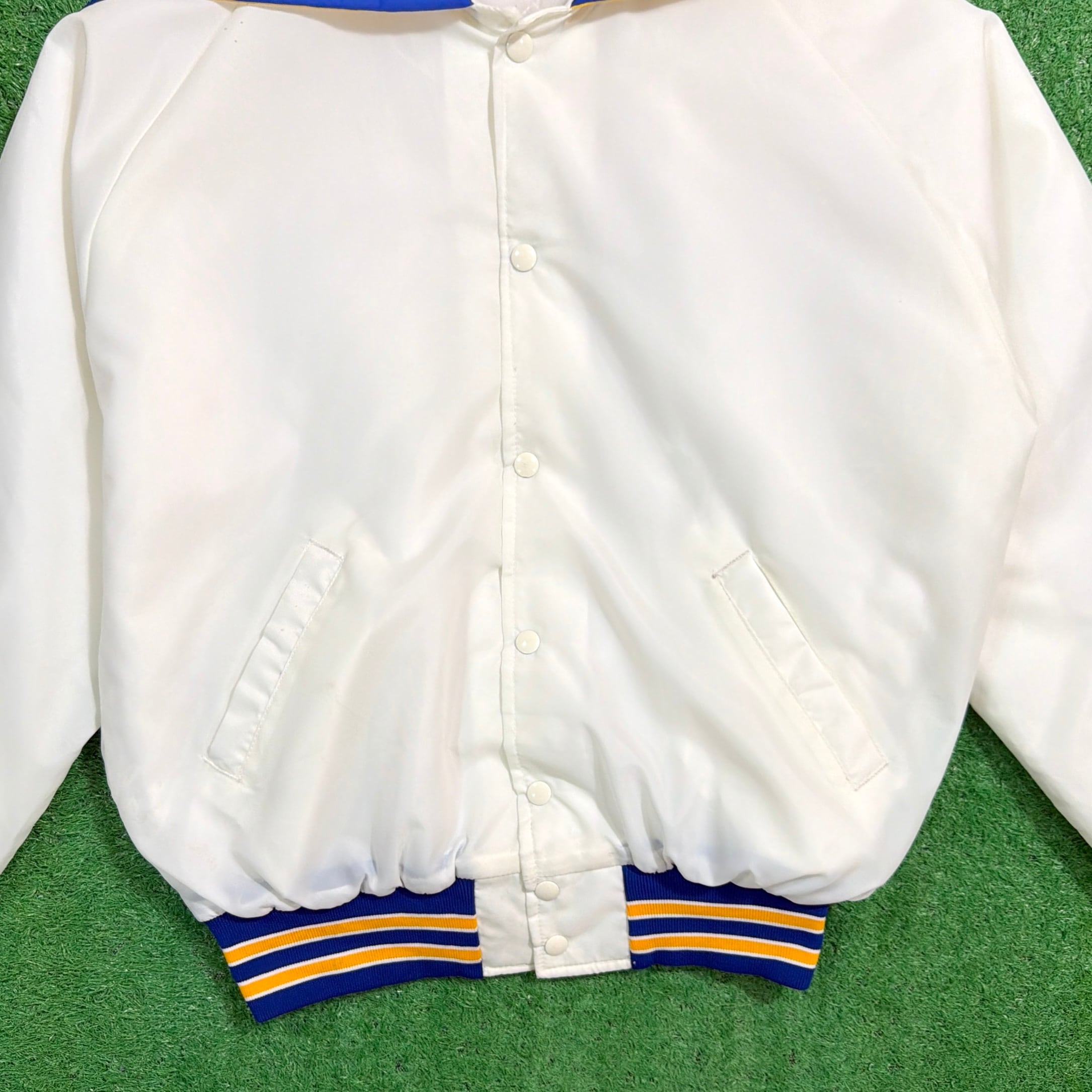 ホワイト×ブルーの爽やかなカラーリングに、大きめのセーラー襟が付いたチアリーダーアイテムらしいデザインがポイント。中綿入りでふんわりとしたボリューム感があり、軽いのにしっかり暖かいのも魅力です。裾と袖口のラインリブがアクセントになり、古着らしい雰囲気を楽しめる一着です。男女問わずユニセックスで着ていただけます。