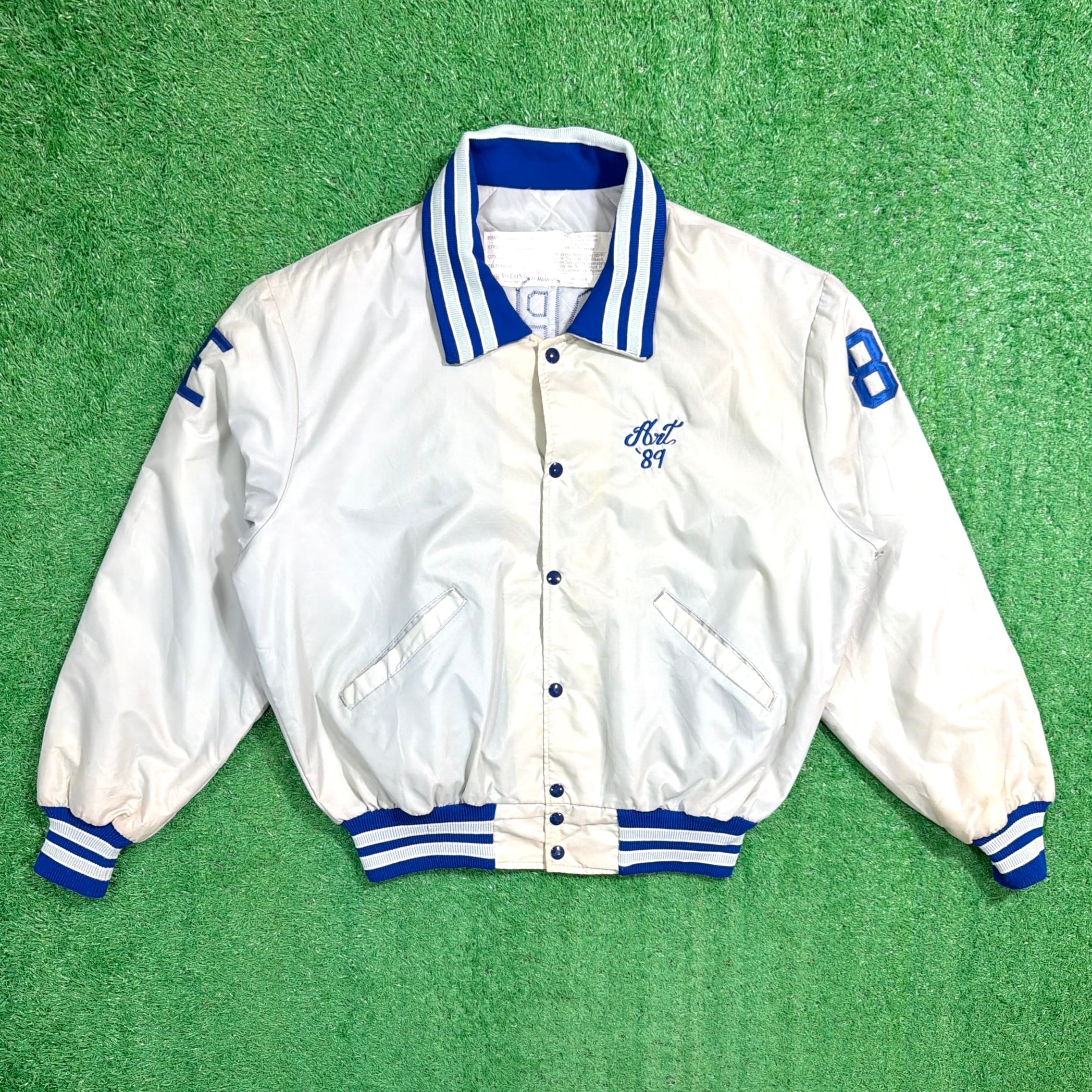ホワイトボディに、ブルー×レッドの配色が映えるクラシックなスクールスタイル。背中には「BISHOP EGAN FOOTBALL」のプリントが入り、当時のアメリカンフットボールチームやスクールジャケットらしい雰囲気を感じさせる一着です。