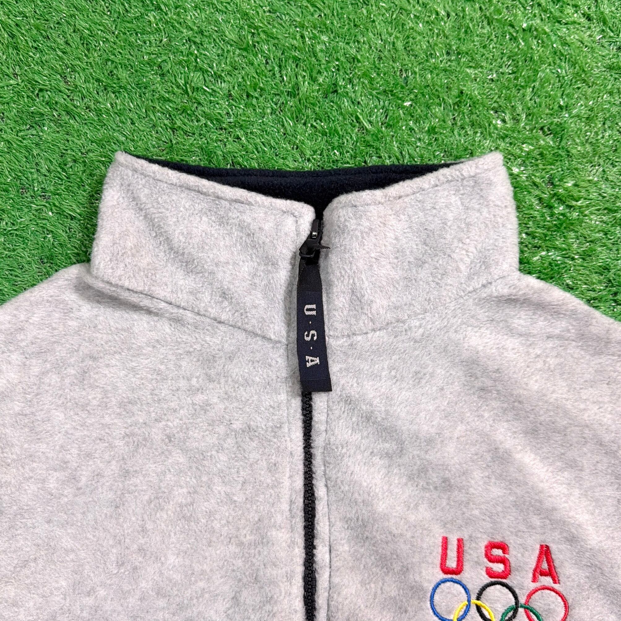 胸元には「USA」と五輪マークの刺繍が入った、オリンピック関連ならではの存在感のあるデザイン。フリース素材で軽く、保温性もしっかりあるため、秋冬のレイヤードに重宝します。フロントはジップアップ仕様で、さっと羽織れるのもポイントです。