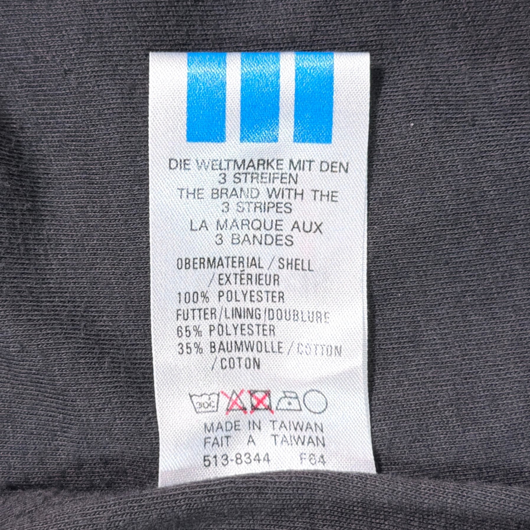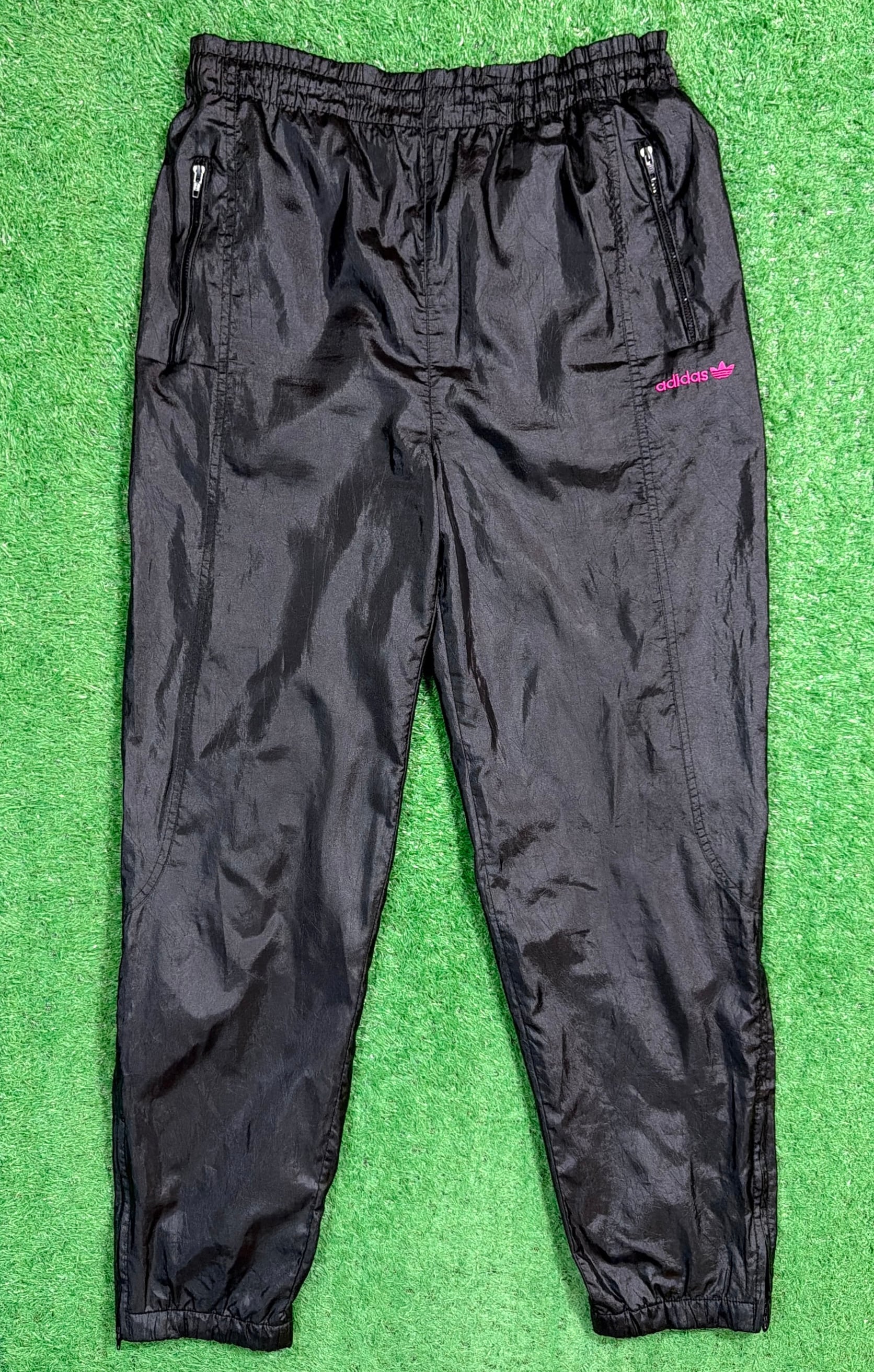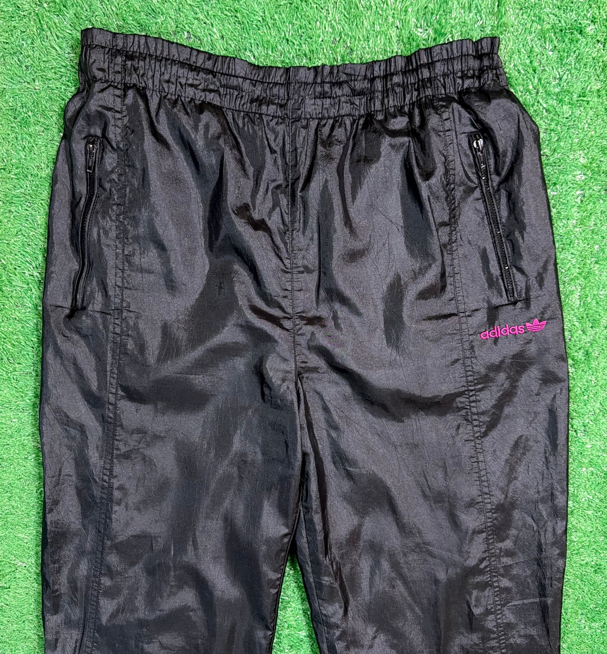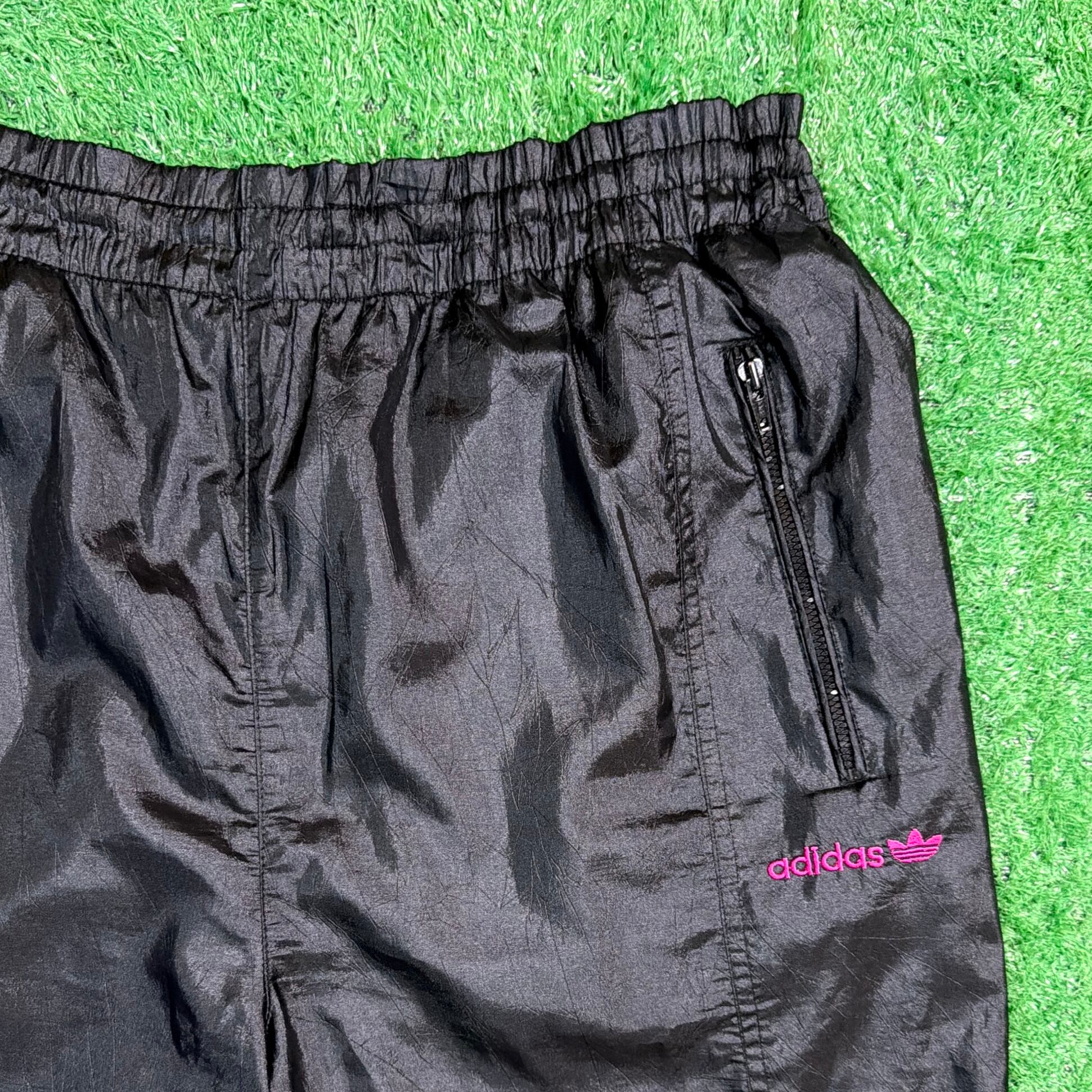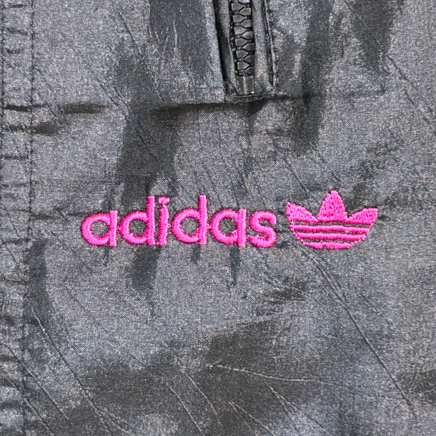 ブラックボディにピンクのトレフォイルロゴ刺繍が映える、当時らしいスポーティーな一本。表地はポリエステル素材で、シャカっとした軽さのある質感が特徴です。