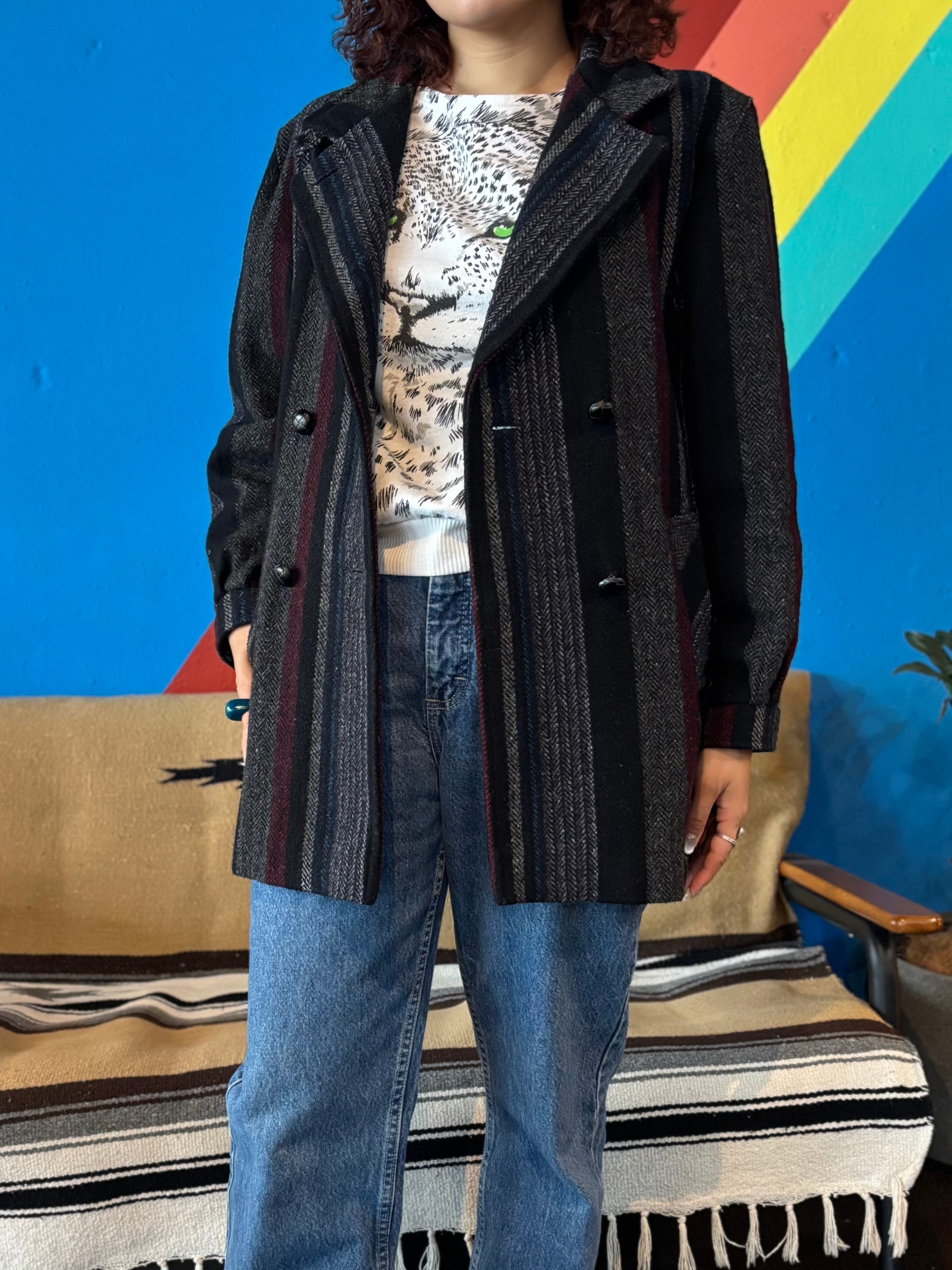 落ち着いたトーンのストライプ配色が印象的で、クラシックな雰囲気を感じる一着。ダブルブレスト仕様で、きちんと感がありつつも古着らしい存在感があります。襟元はボタンの留め方によってスタンドカラーとしても着用可能で、首元の表情を変えられるデザインもポイント。