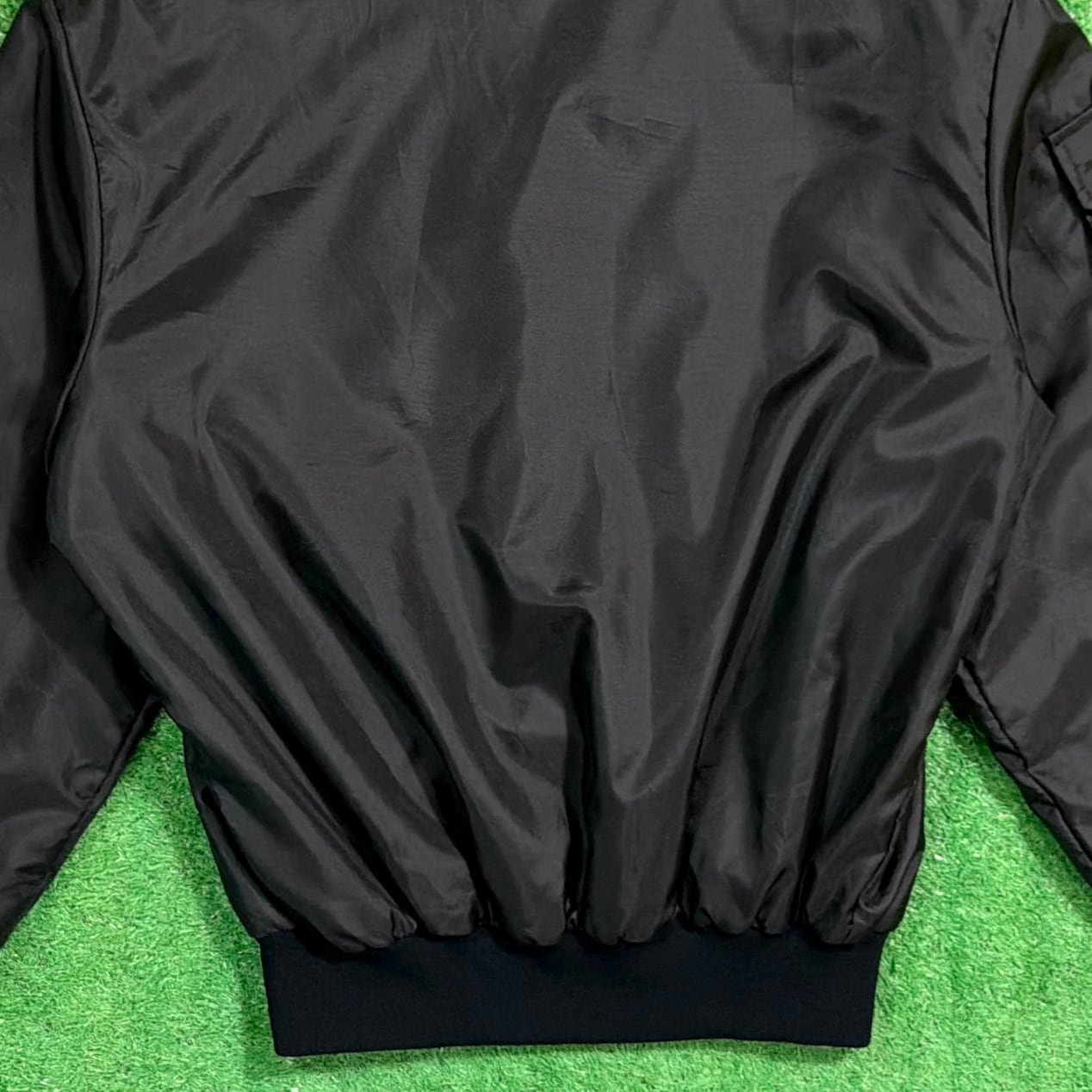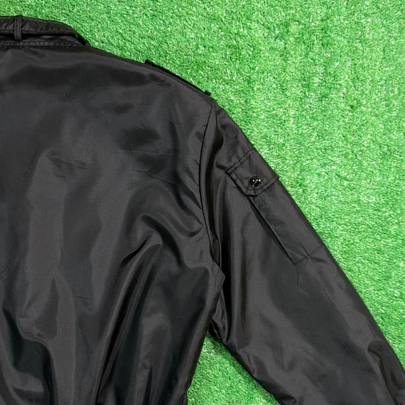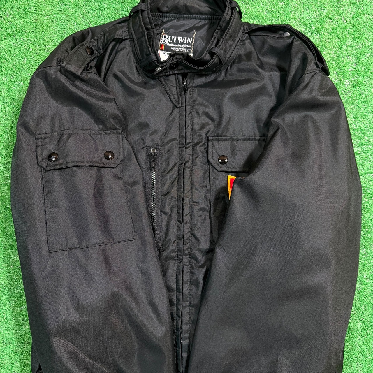 ブラックのナイロンボディに、フロントのワッペンが映える一着。