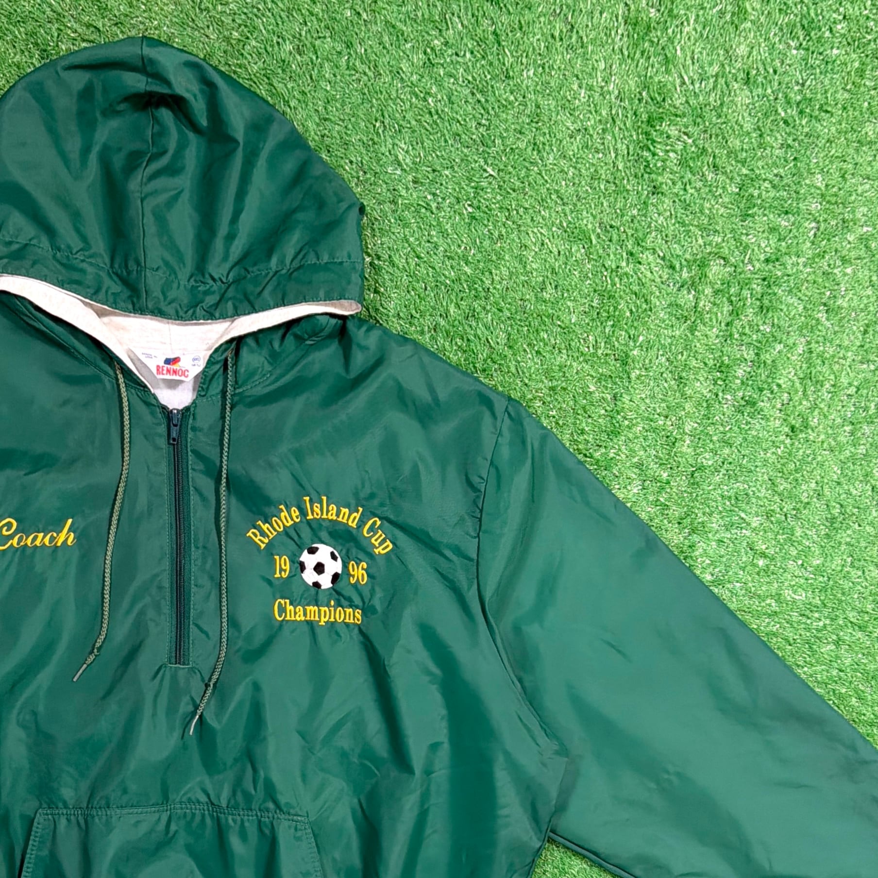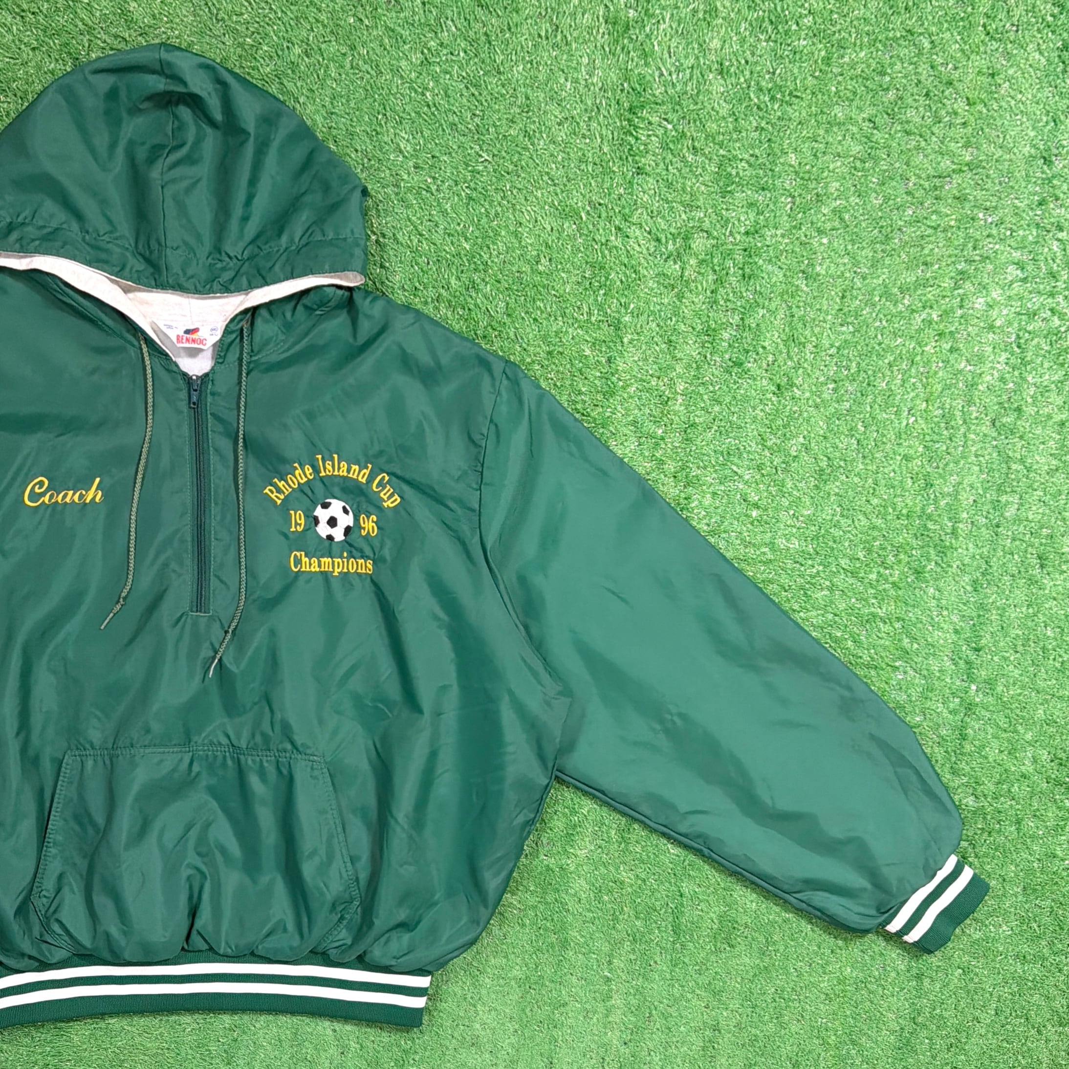 深みのあるグリーンカラーに、フロントとバックには Rhode Island Cup Champions 1996 のプリント入り。サッカー大会の記念ジャケットらしい、アメリカらしい雰囲気がしっかり感じられる一着です。