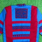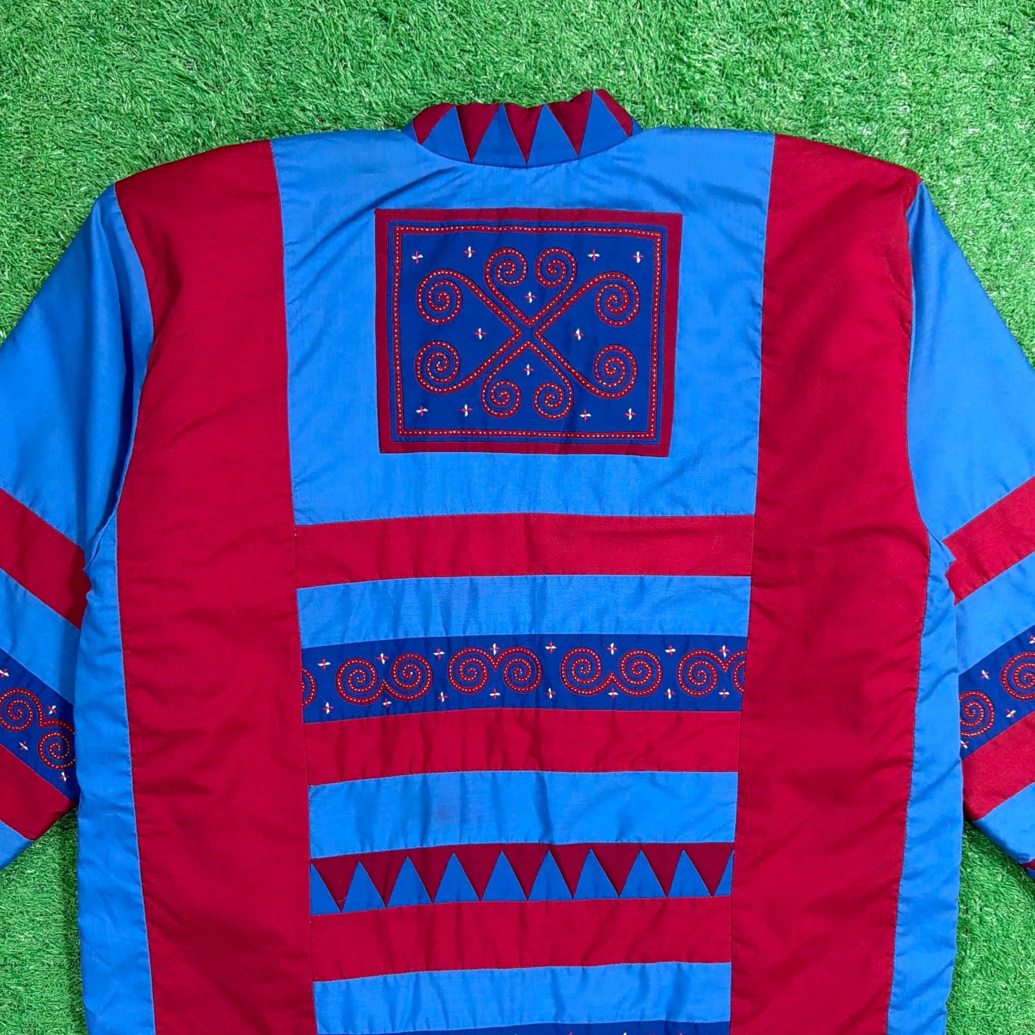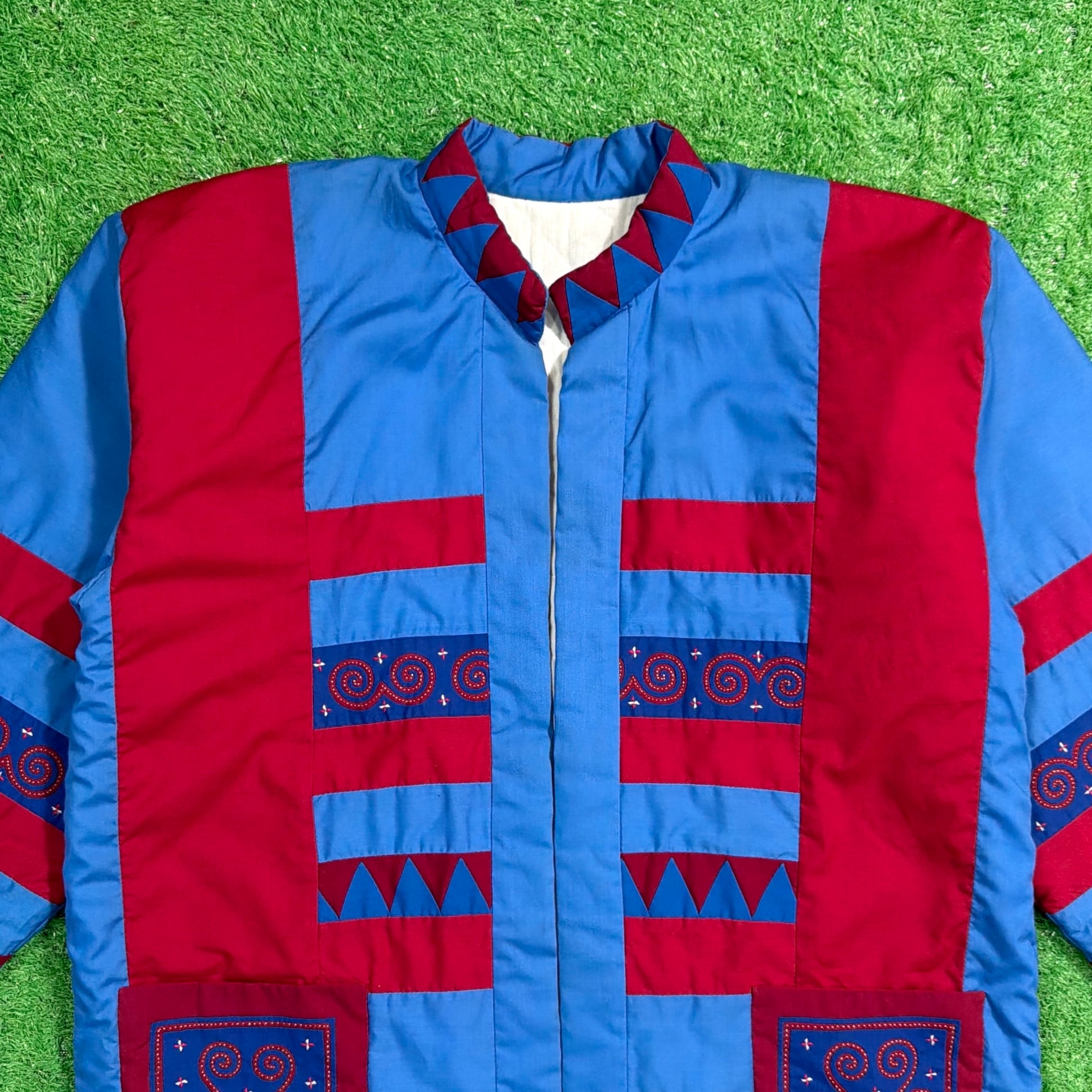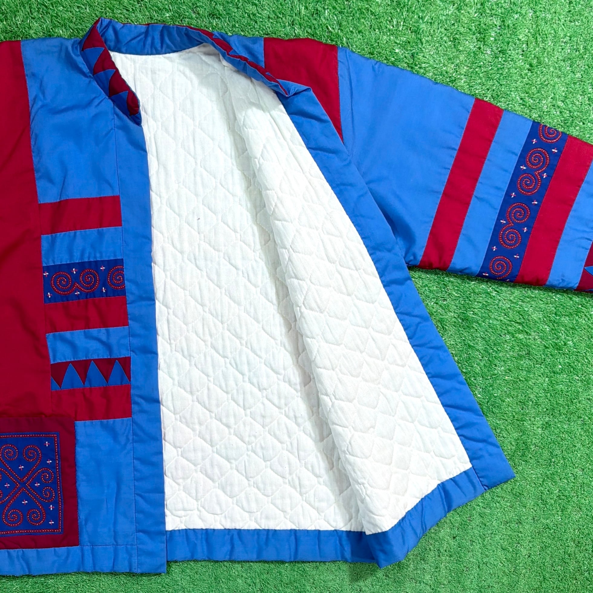 ブルーとレッドの配色が目を惹く、パッチワークデザインの羽織りジャケットです。