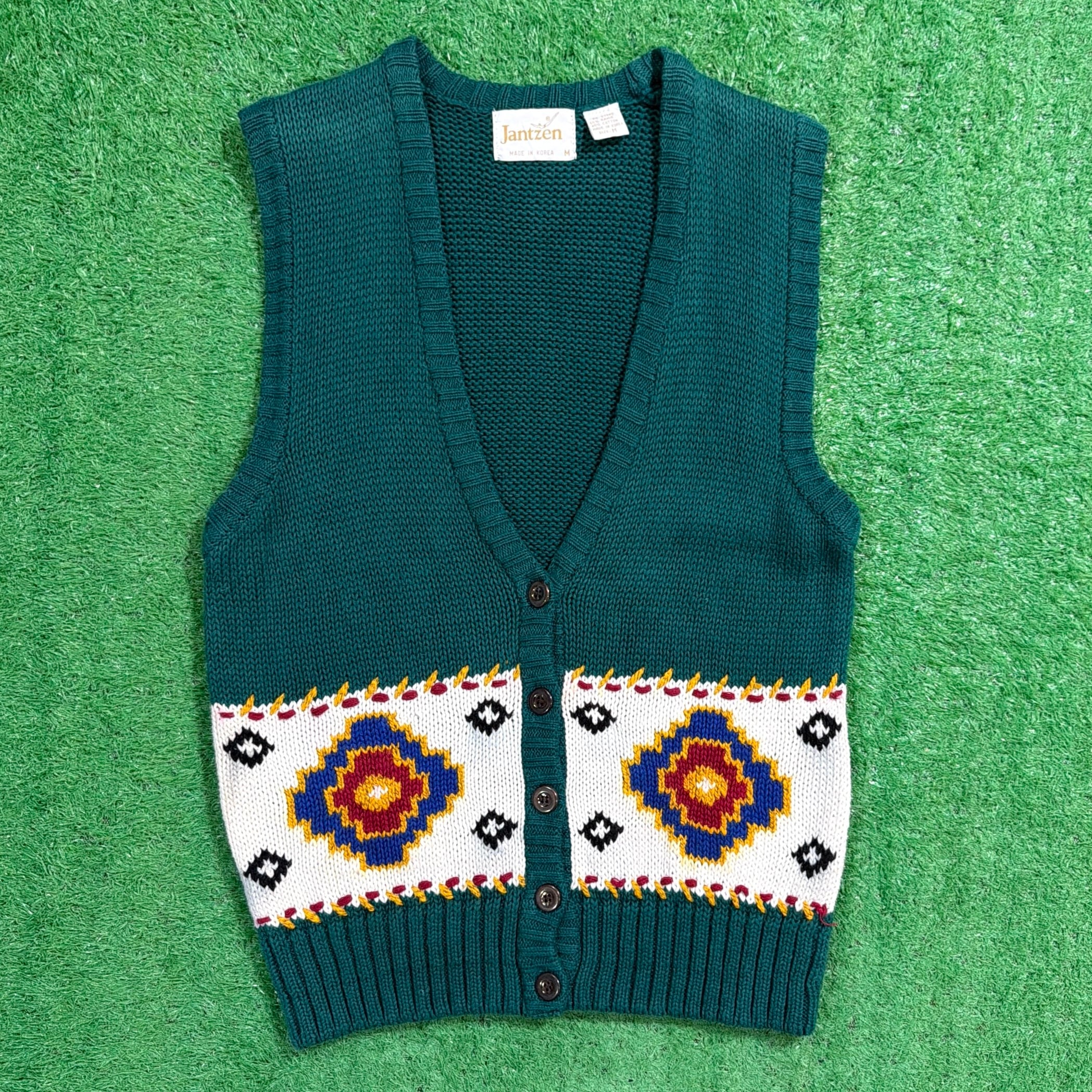 【Lady's】 90s グリーン 幾何学調 ニット ベスト / Made In KOREA 緑 ネイティブ ラミー コットン 90年代 古着 1397
