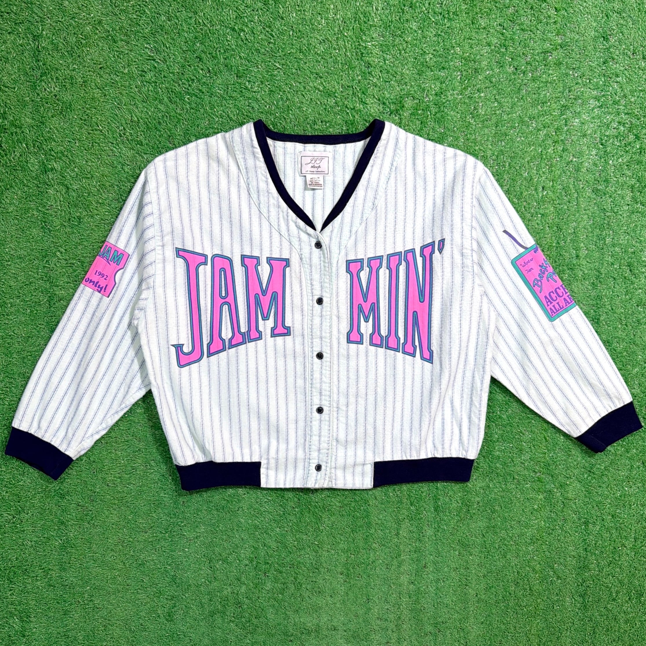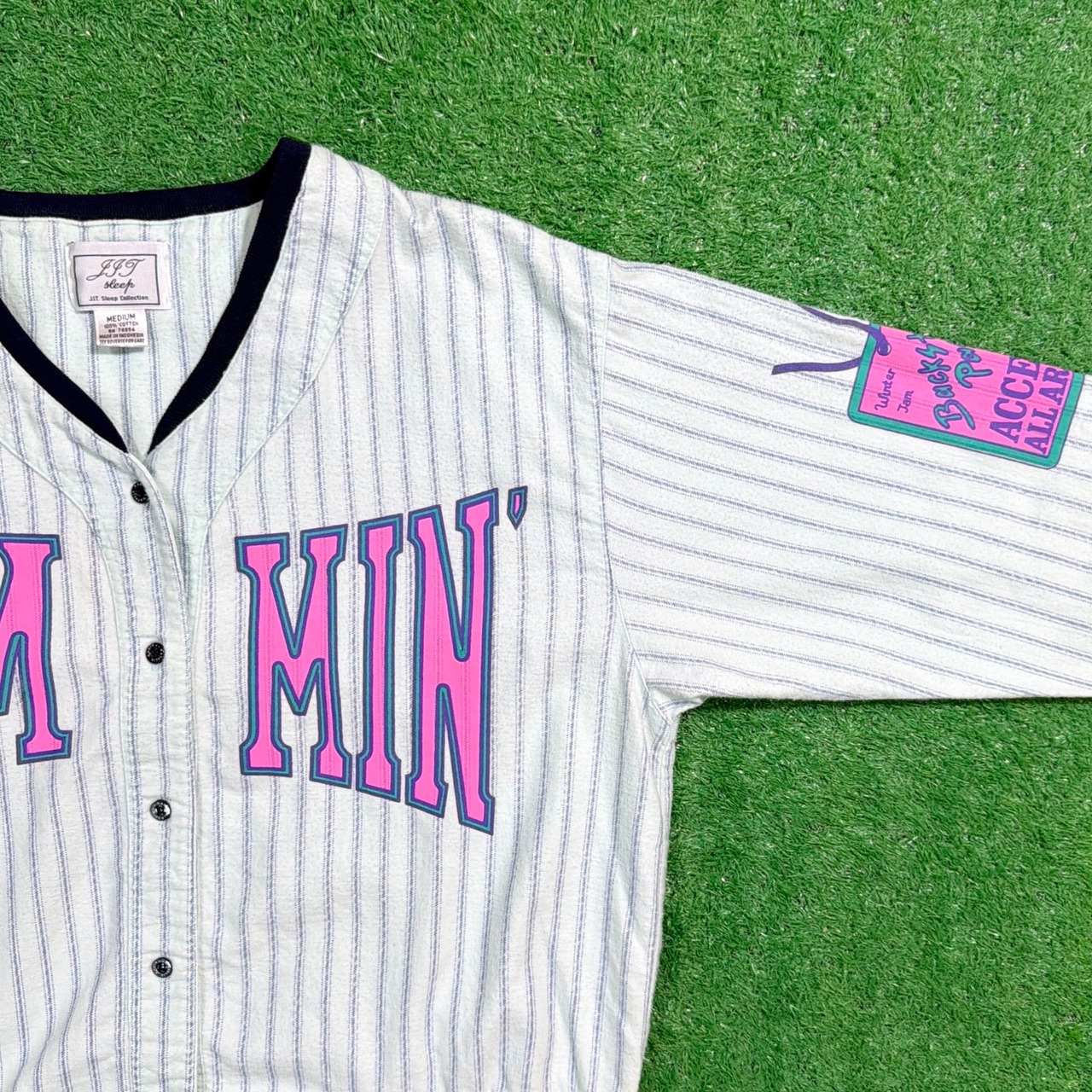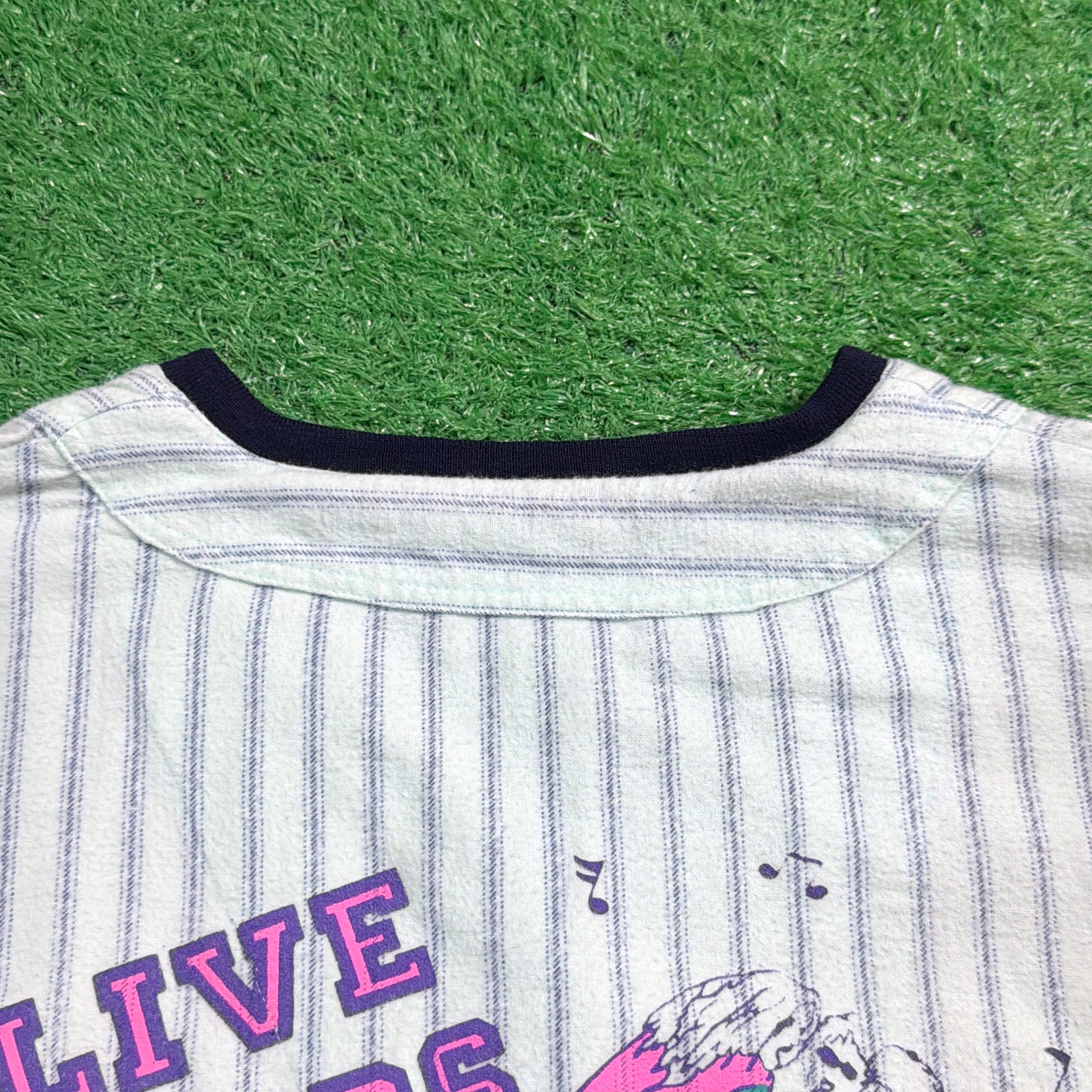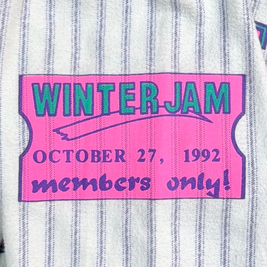 音楽イベントのプリントが入った90年代のベースボールシャツ風トップスです。