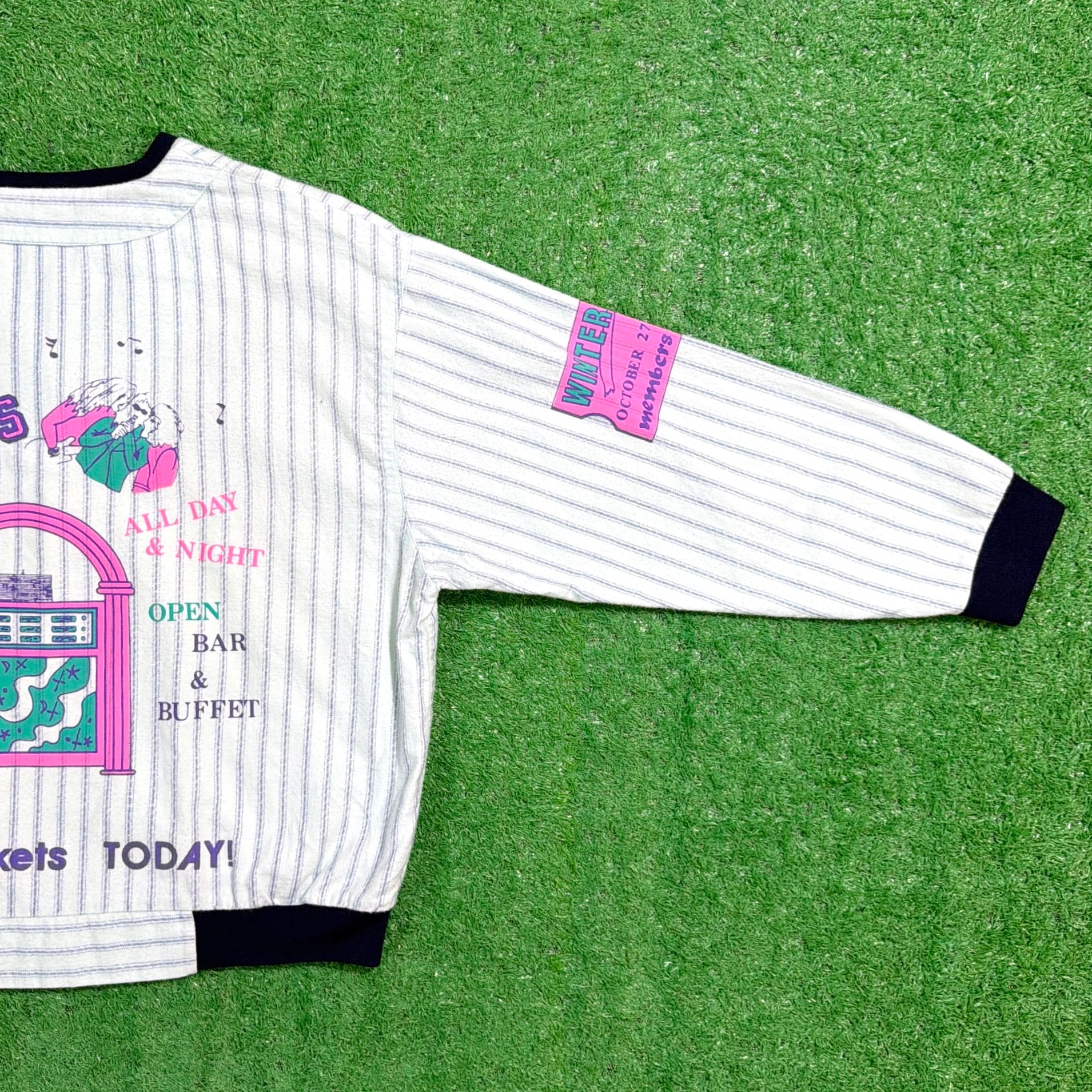 生地はやや薄手で少し起毛感があります。グラフィックがフロントから袖、バックにもプリントされており、90年代らしいポップな配色がたまらない1着です。