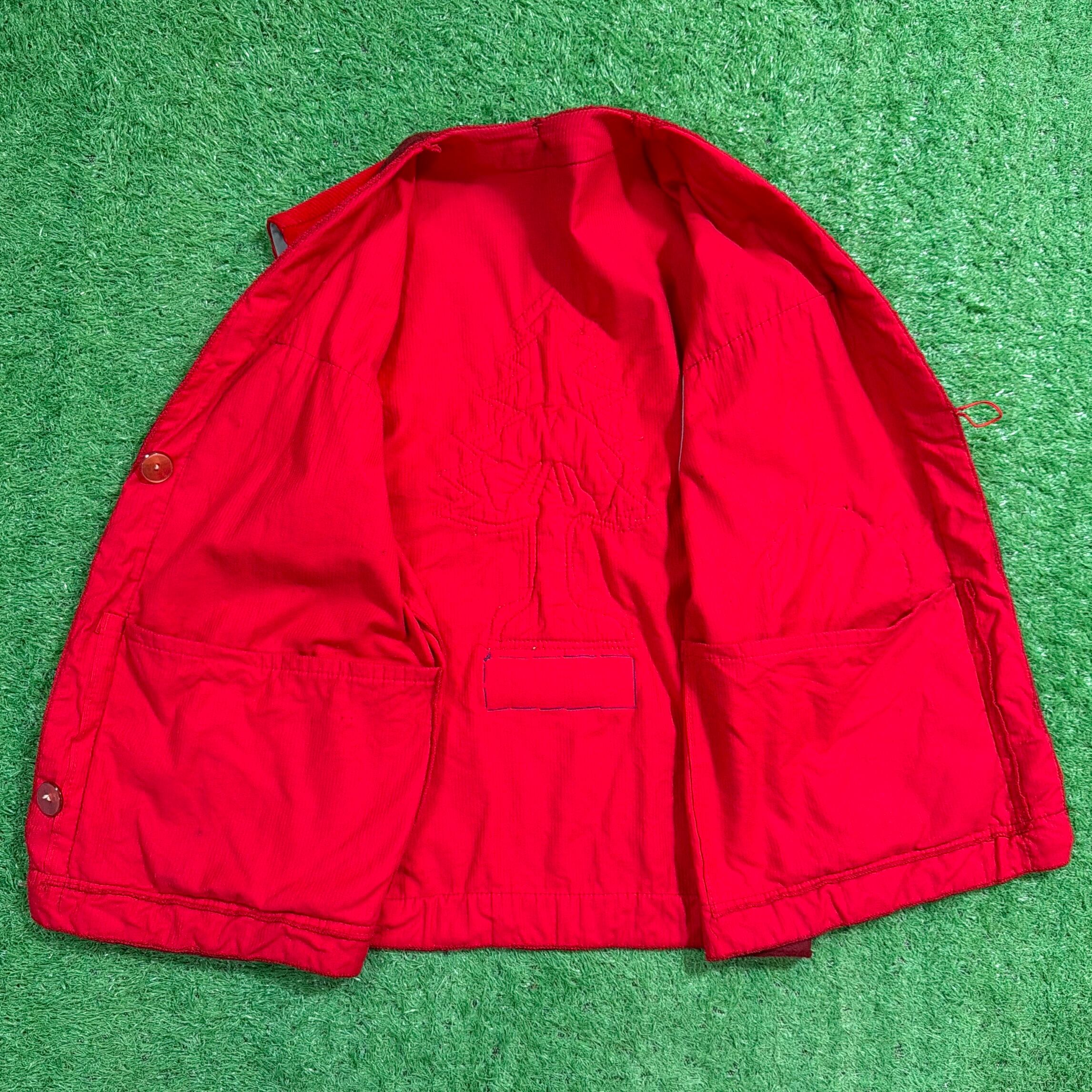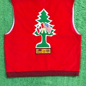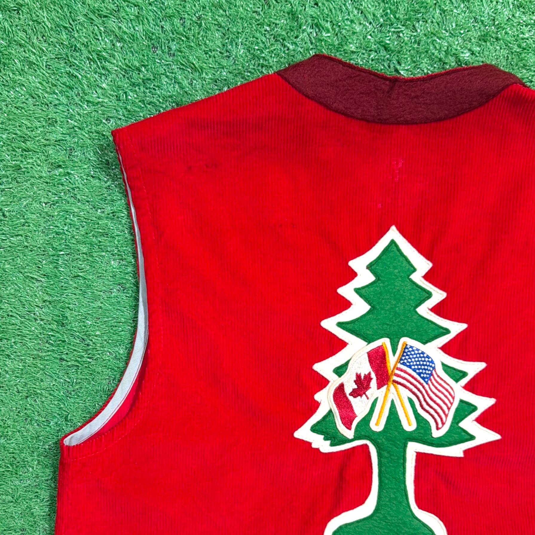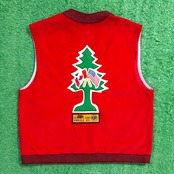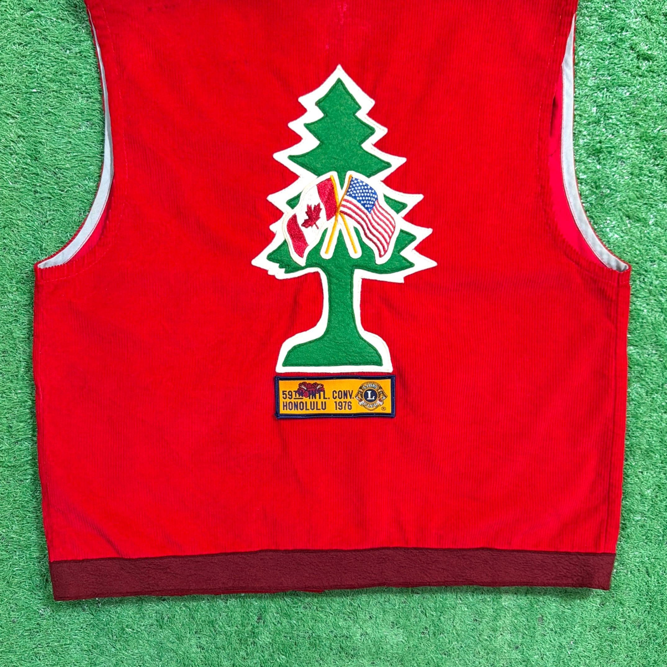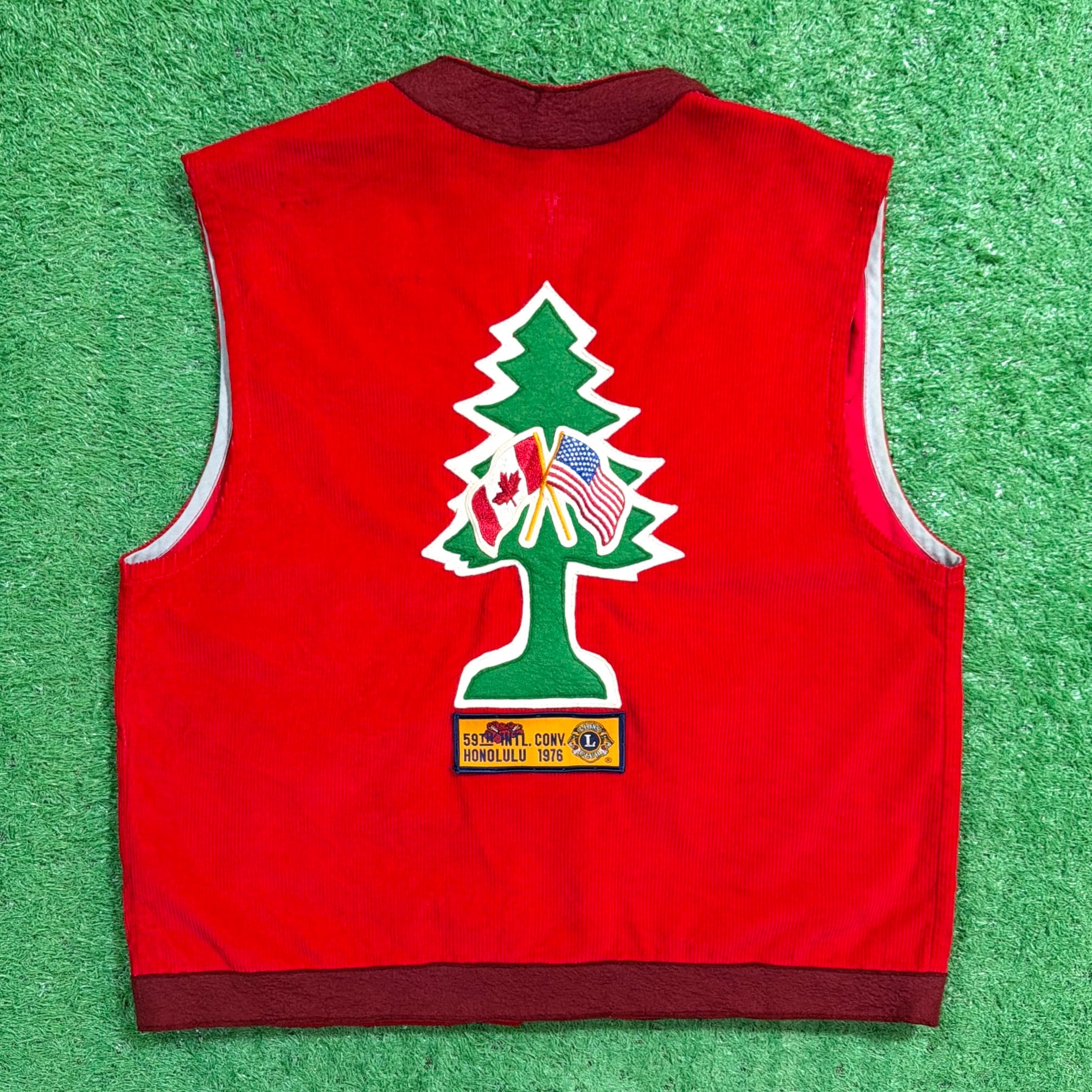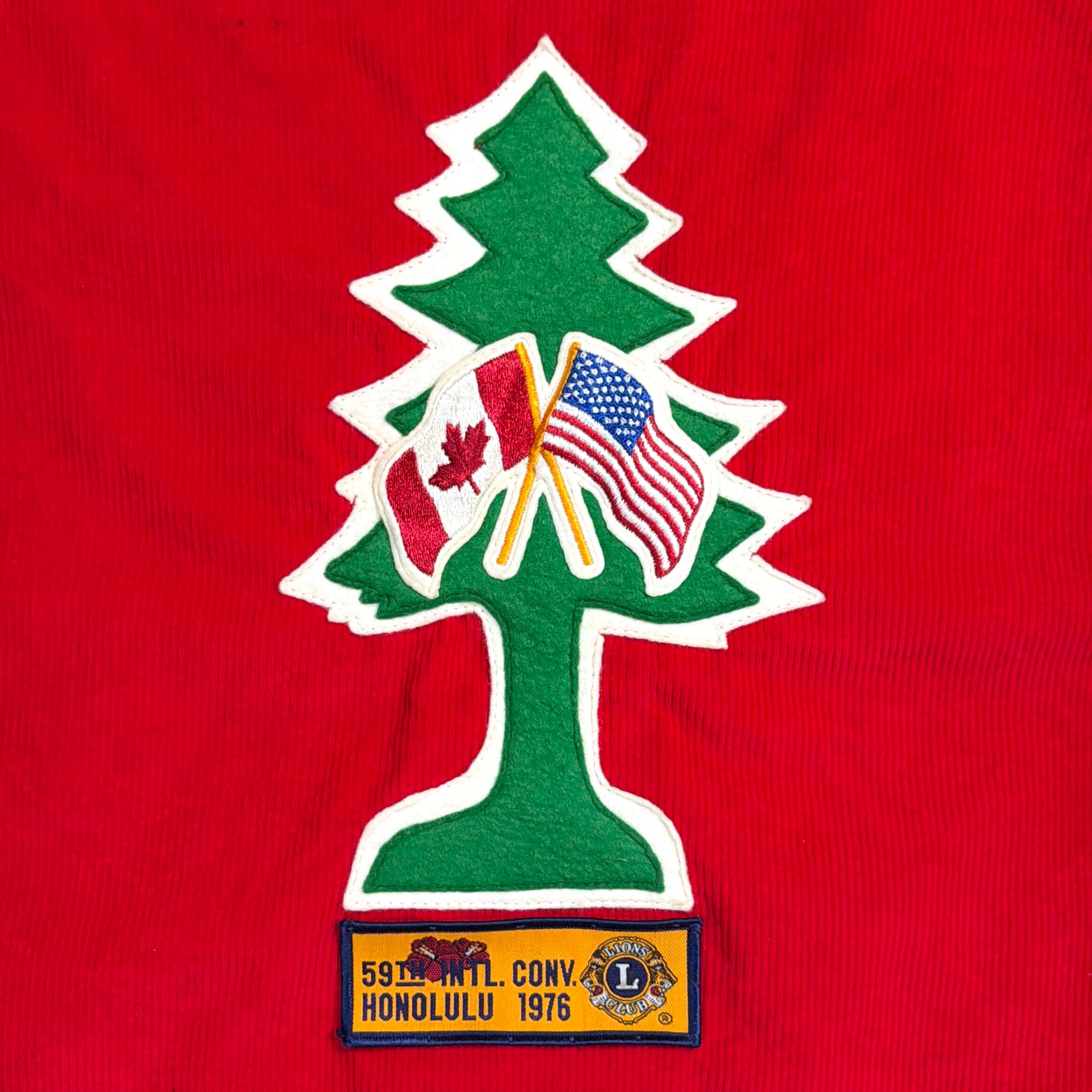 鮮やかなレッドカラーに、フロントには「LIONS INTERNATIONAL」の大型ワッペン、バックにはツリーと国旗モチーフのワッペンが配置された存在感のある一着。Lions Club は、世界的に活動する社会奉仕団体で、当時はクラブ単位でジャケットやベストを作ることも多く、こうしたワッペン付きアイテムは実際にメンバーが着用していたものと考えられます。