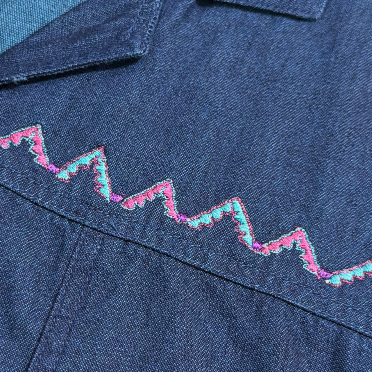 襟元や袖口、裾に入ったジグザグ刺繍がさりげないアクセントになり、シンプルながらも程よく個性を感じられる一枚。シャツとしても、軽い羽織としても使いやすいアイテムです。