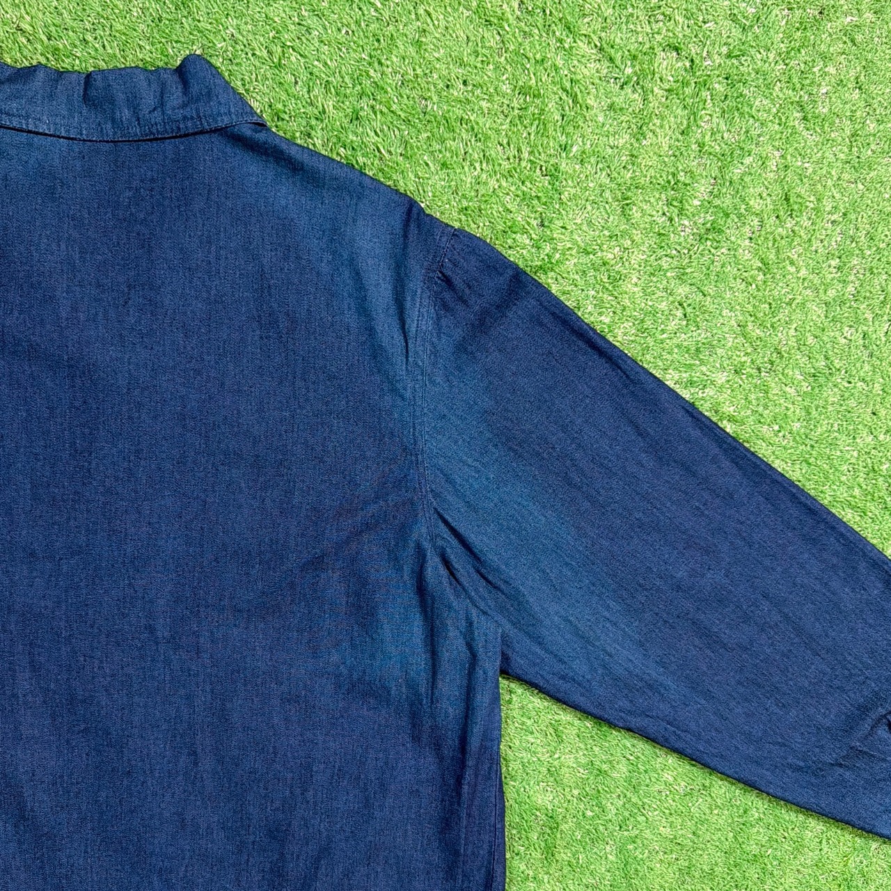 全体的に色落ちが進んだインディゴカラーで、デニムのような雰囲気はありつつも、デニムほど硬さのない、柔らかな生地感が特徴。着込まれたことで生まれた自然なフェードが、90sらしい味のある表情に仕上がっています。