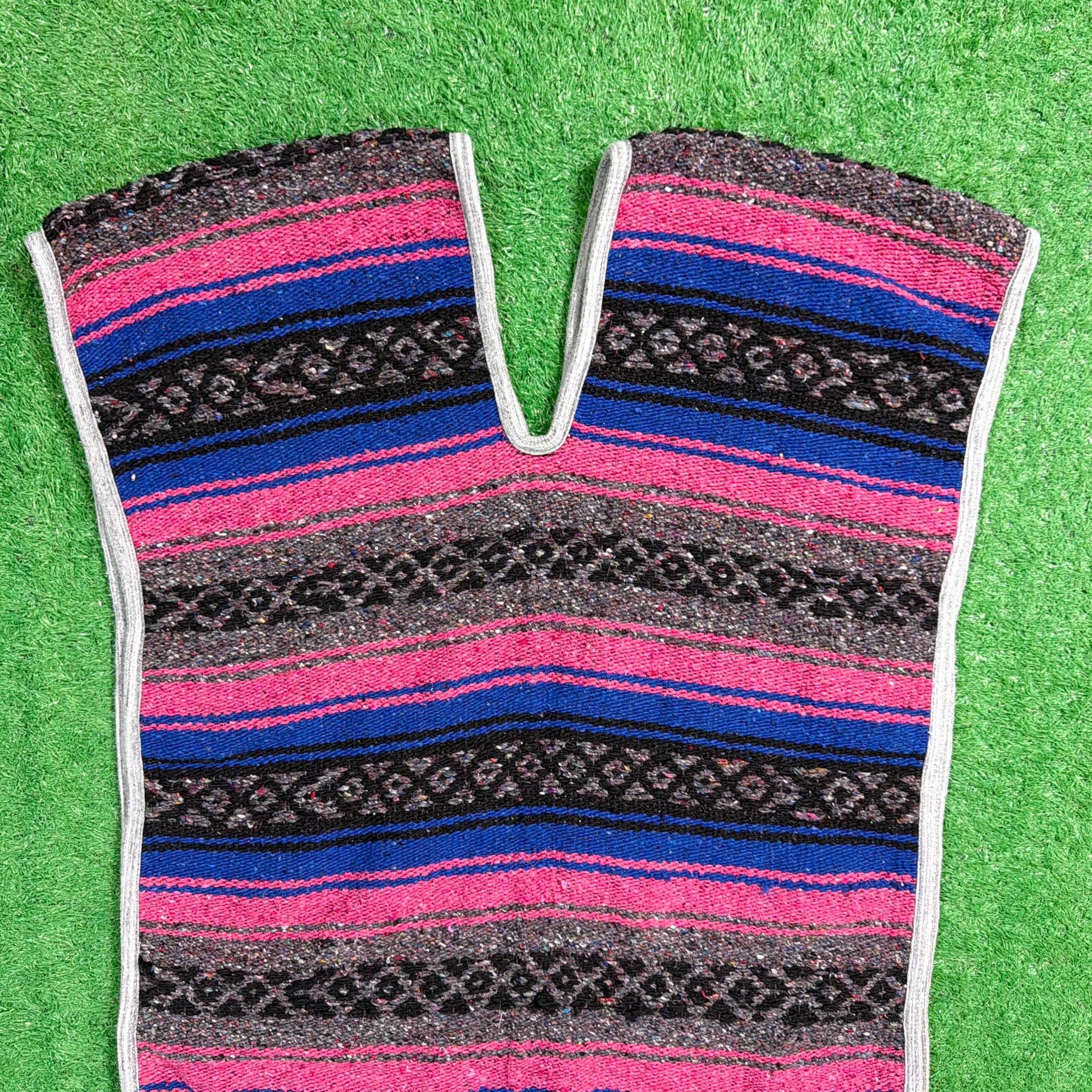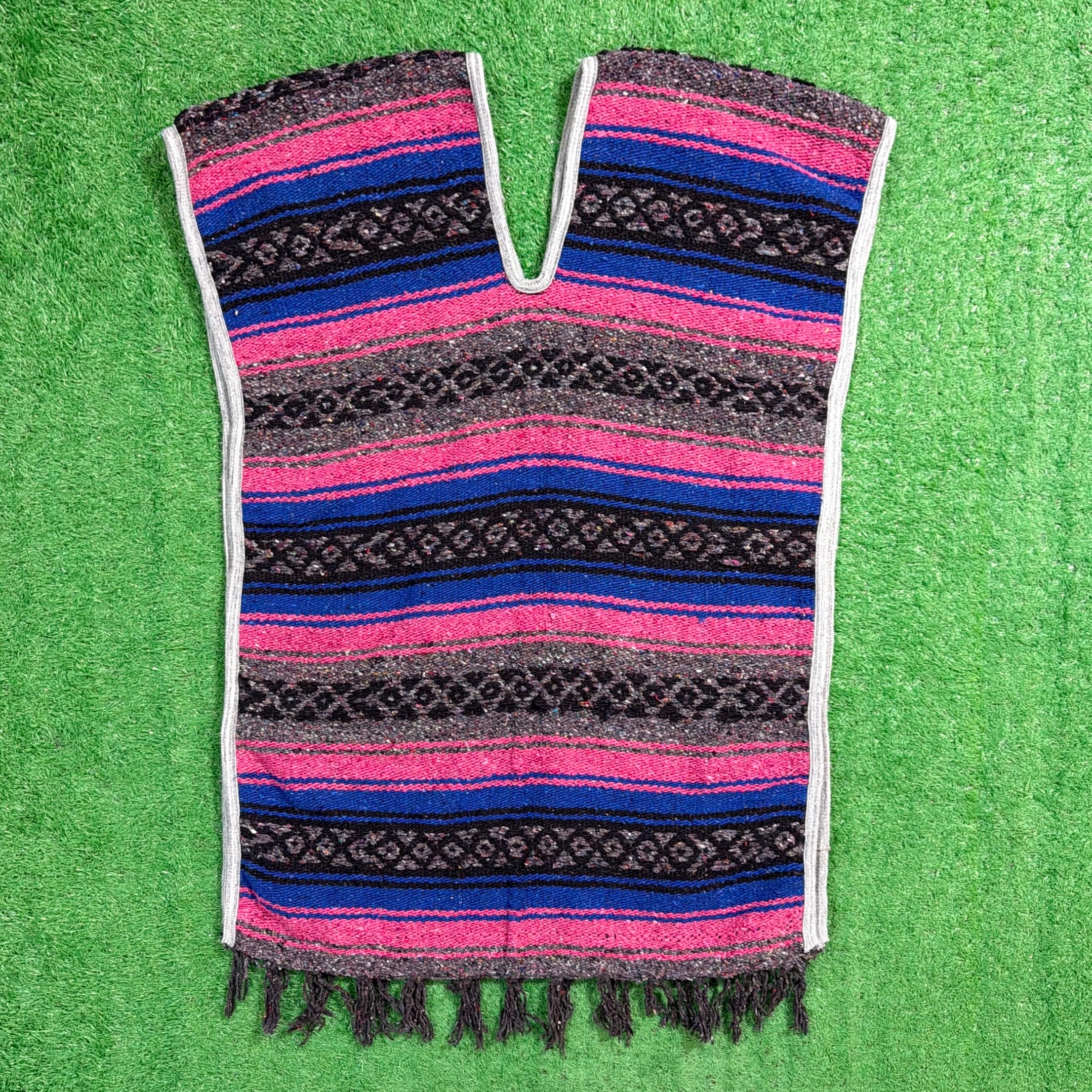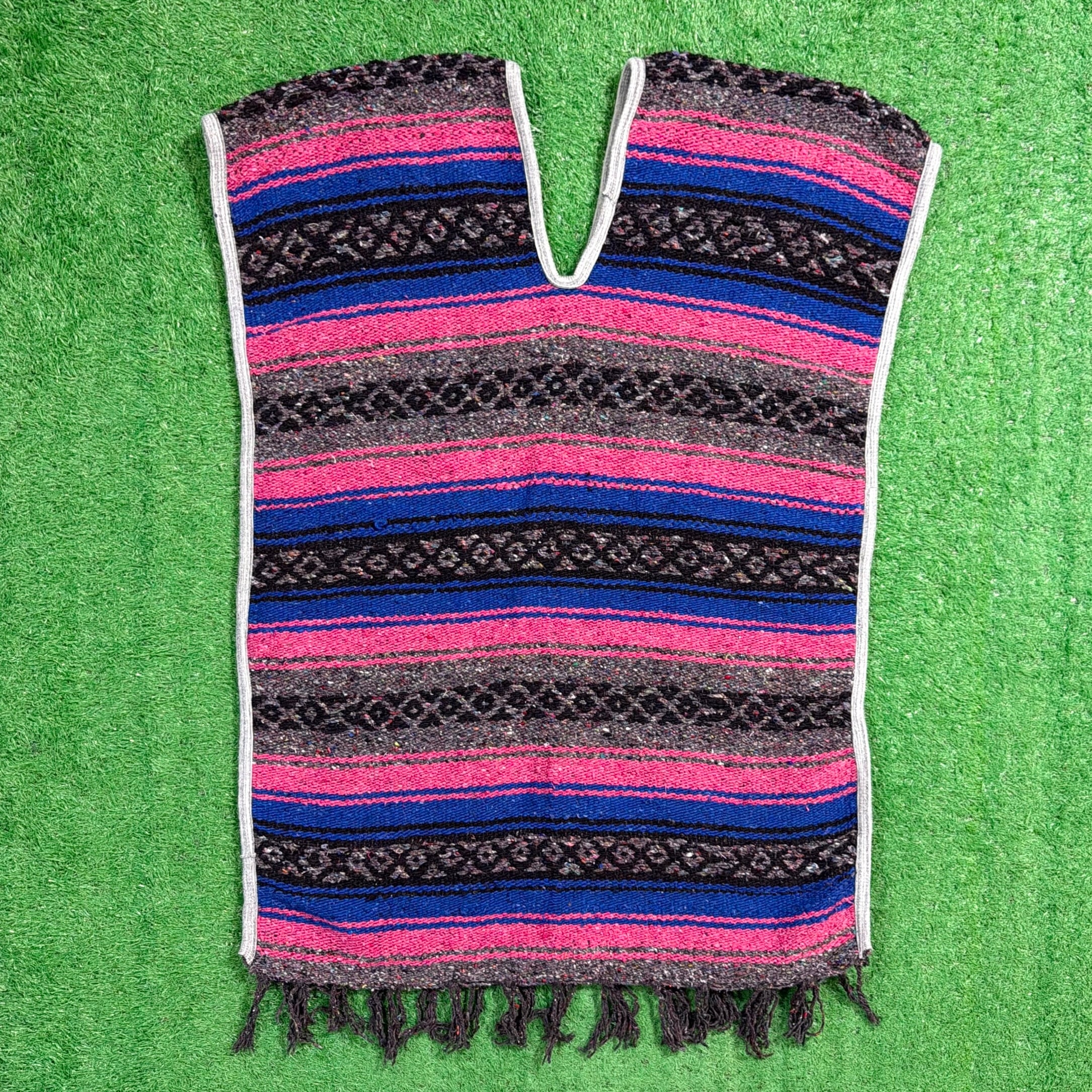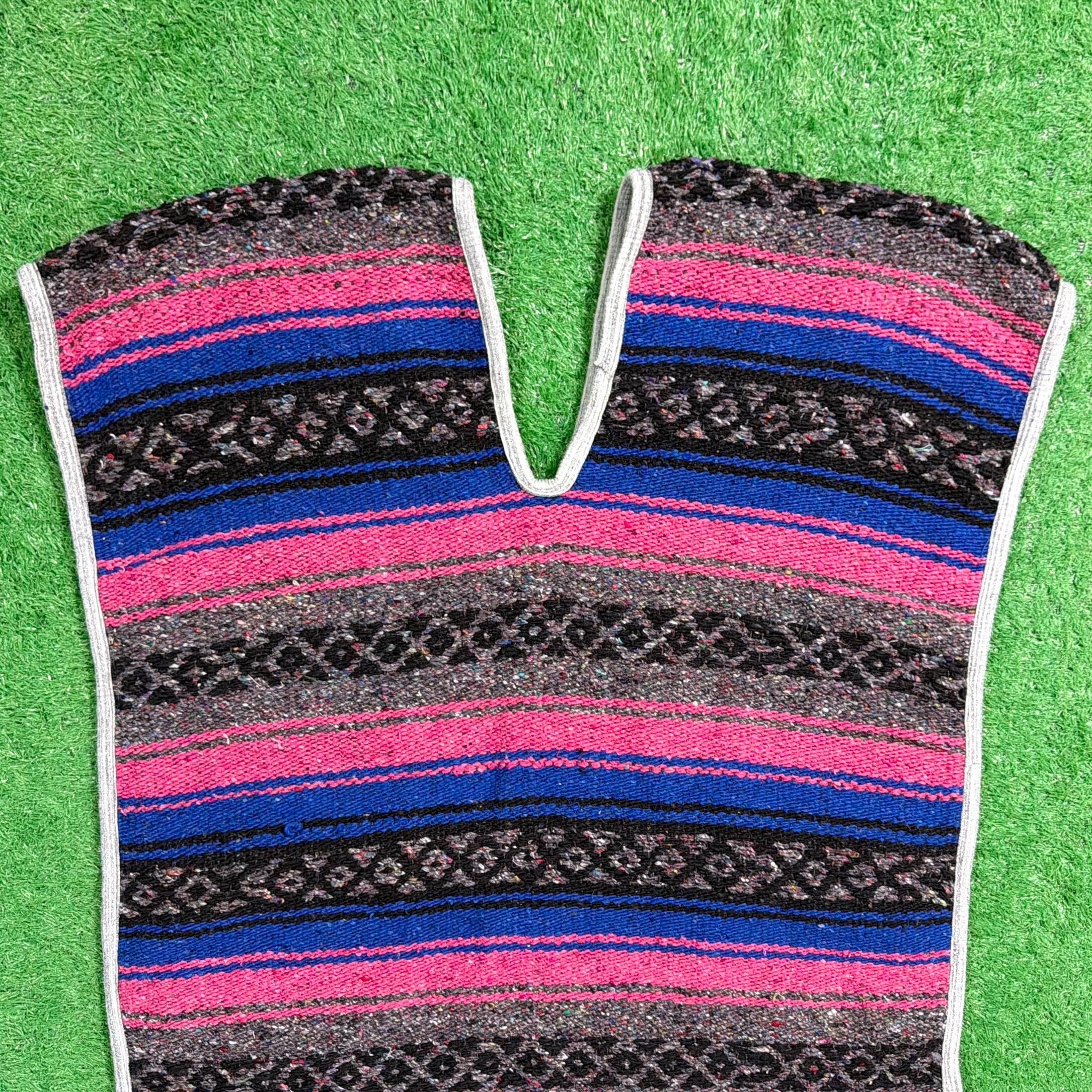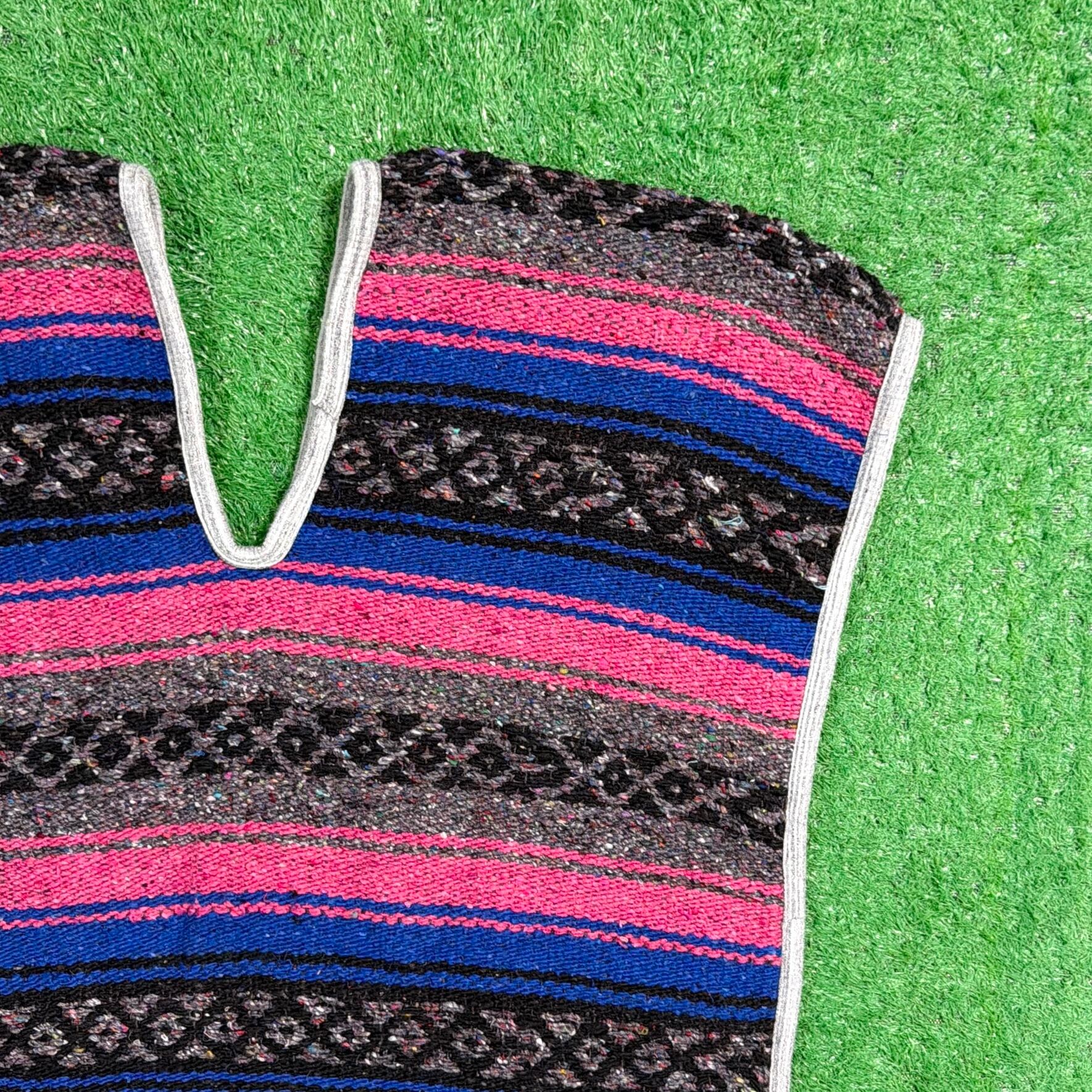 カラフルなボーダー柄が目を引く、メキシカンブランケット素材のポンチョです。