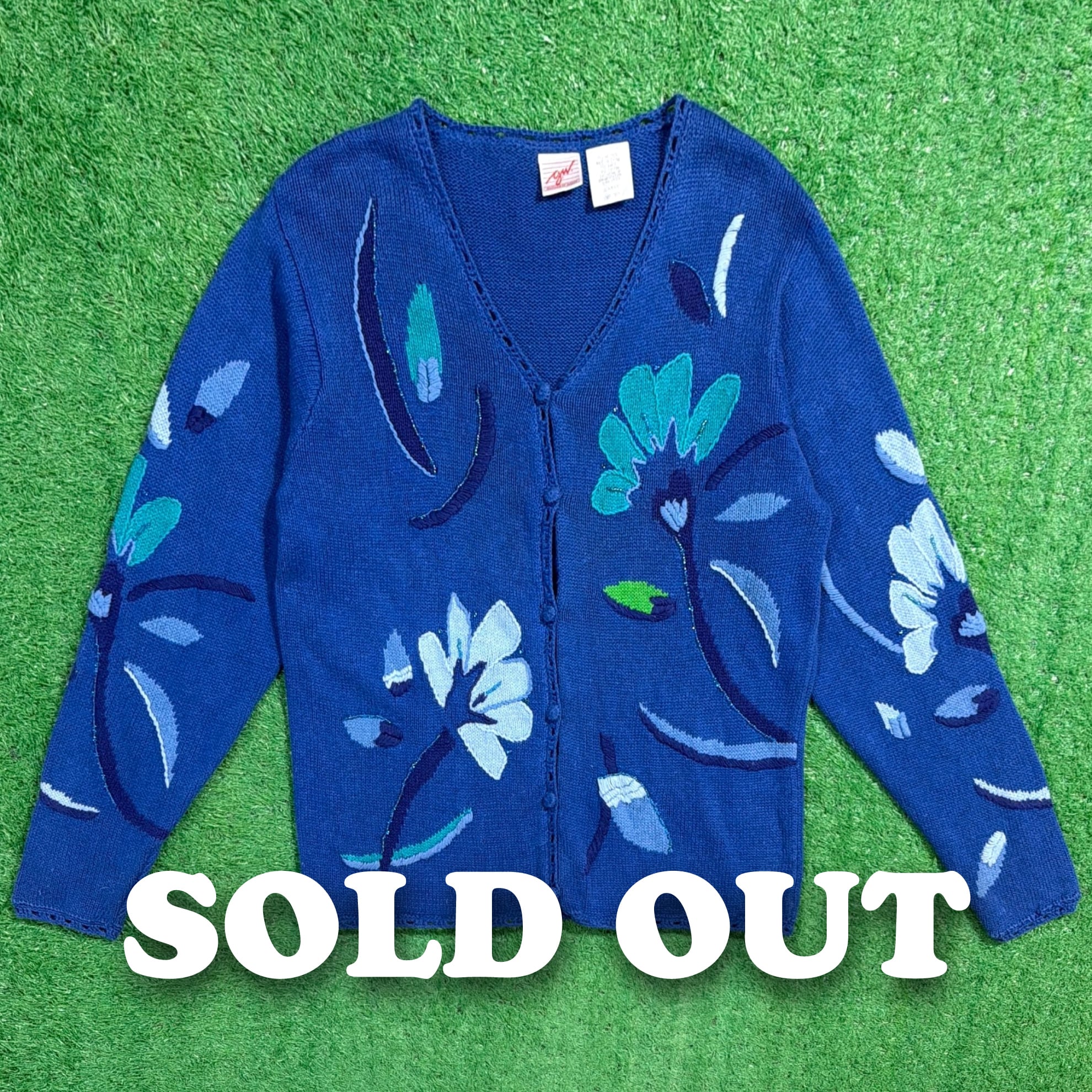 1980年代らしい色使いと、フラワーモチーフが印象的なニットカーディガンです。