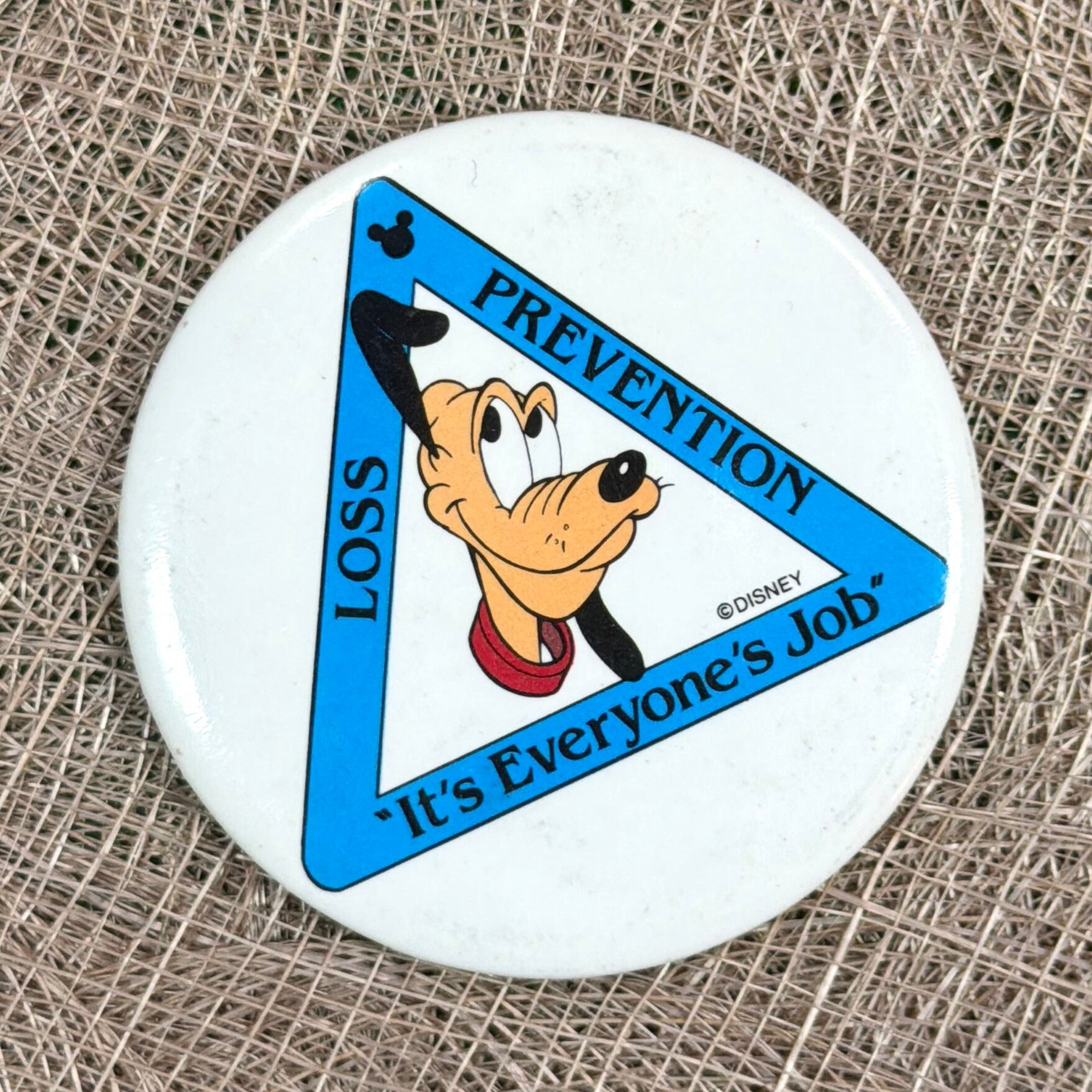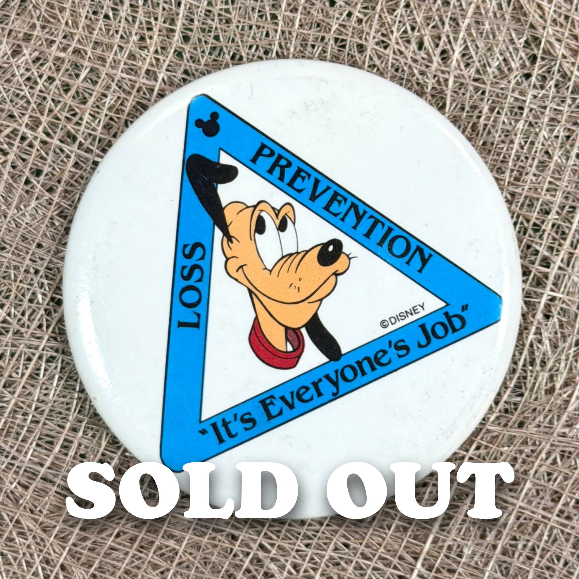 バッジには「LOSS PREVENTION is everyone’s job(盗難防止はみんなの仕事)」というメッセージが入り、ディズニーの施設や店舗で使われていた、スタッフ向けの啓発デザインと思われます。注意喚起の内容ながら、プルートの表情やポップな配色によって、ディズニーらしいやさしい雰囲気に仕上がっているのが特徴。一般的なキャラクターバッジとは違った、少し通好みな一枚です。