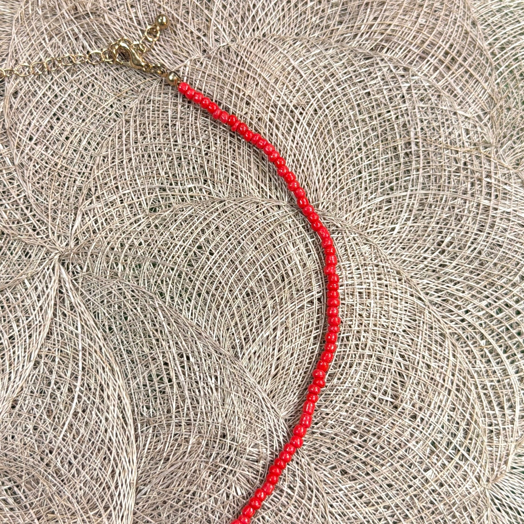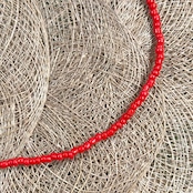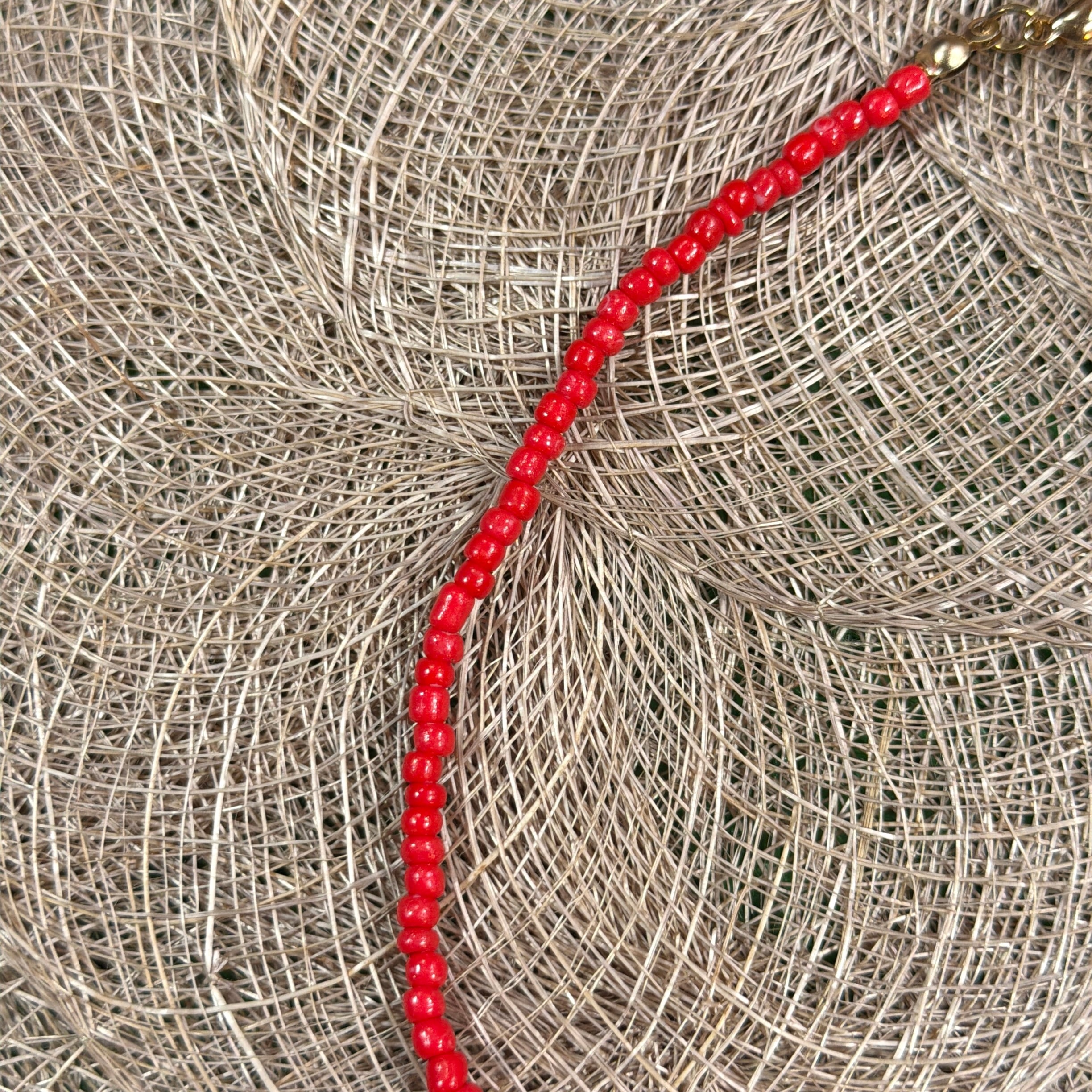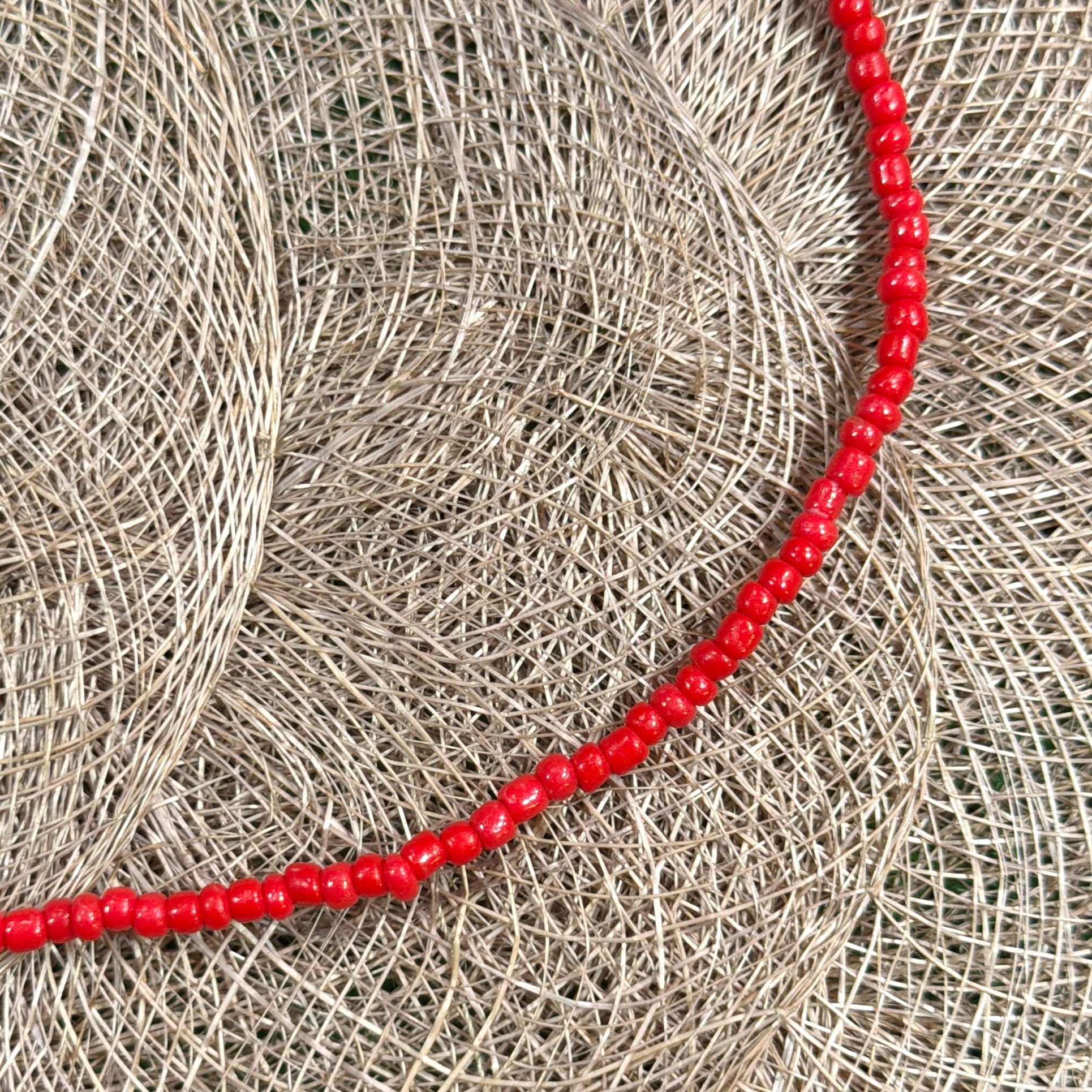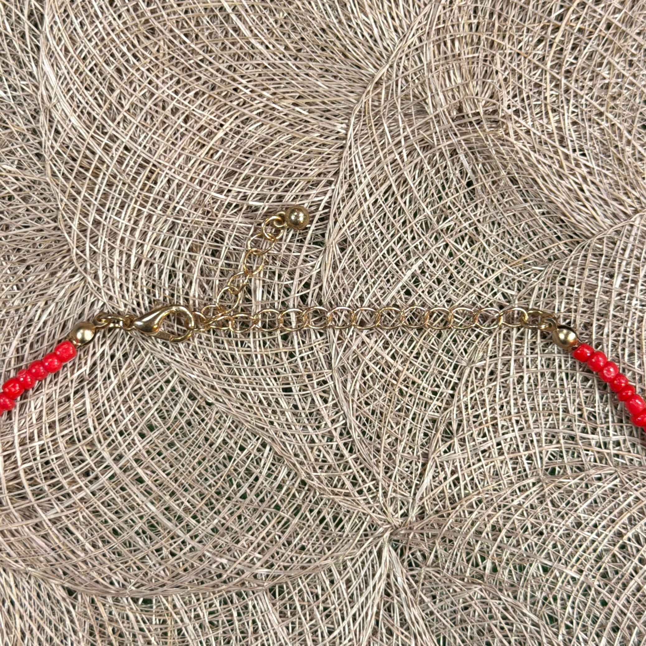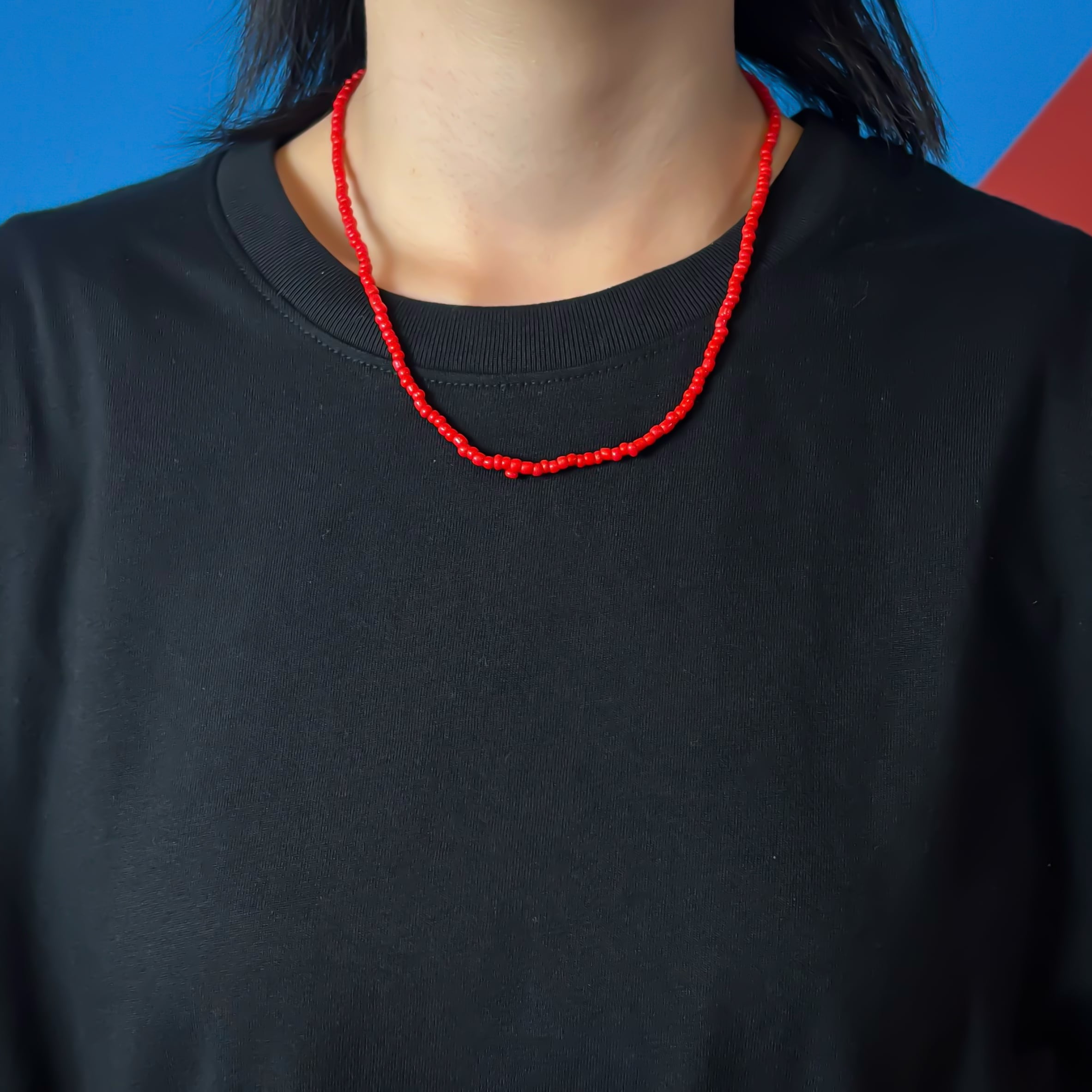 小ぶりなビーズサイズで主張しすぎず、首元にさりげなく色味を足してくれるアイテム。赤の発色がスタイリングのアクセントになり、無地のトップスにも自然に馴染みます。ユニセックスで使いやすいデザインなのもポイントです。