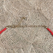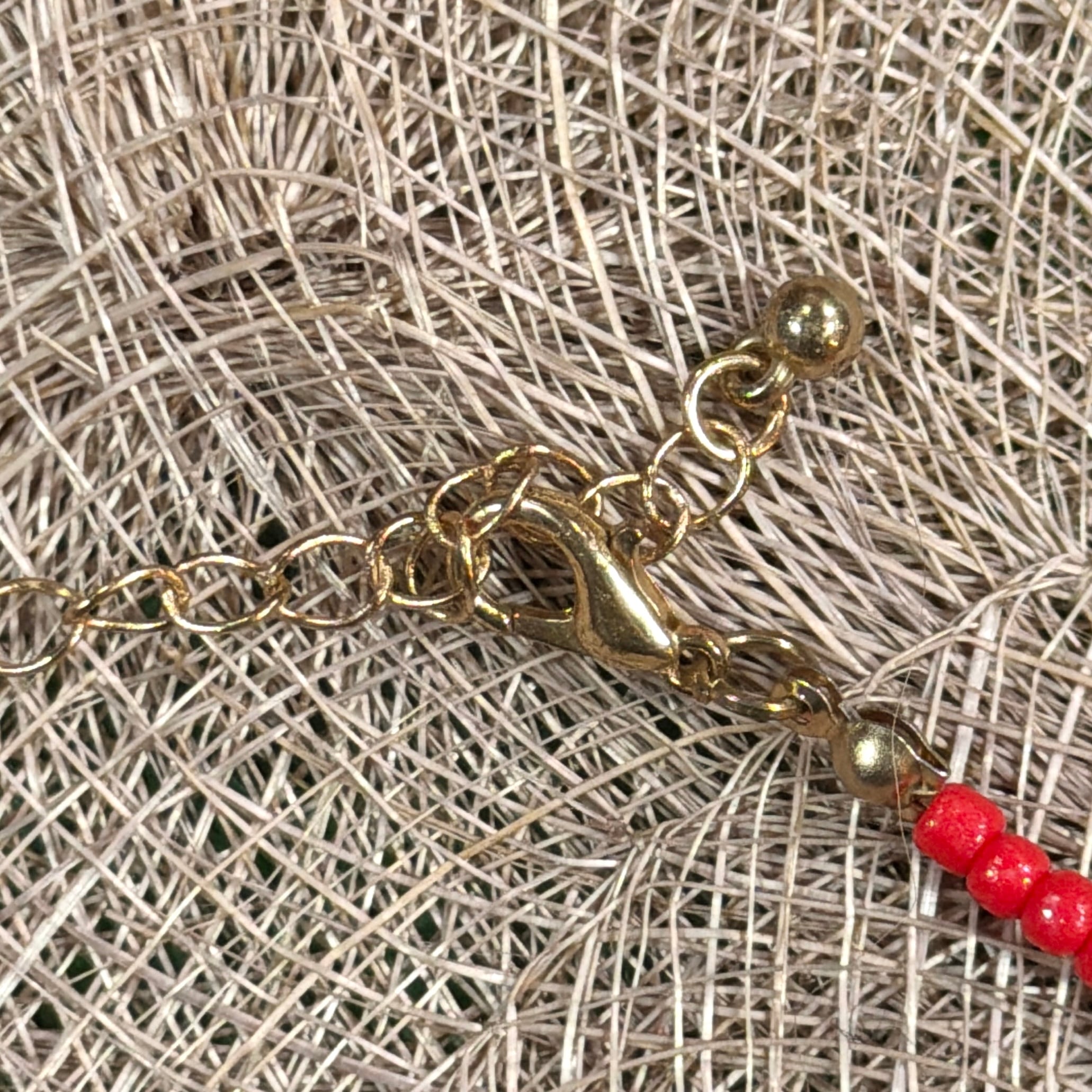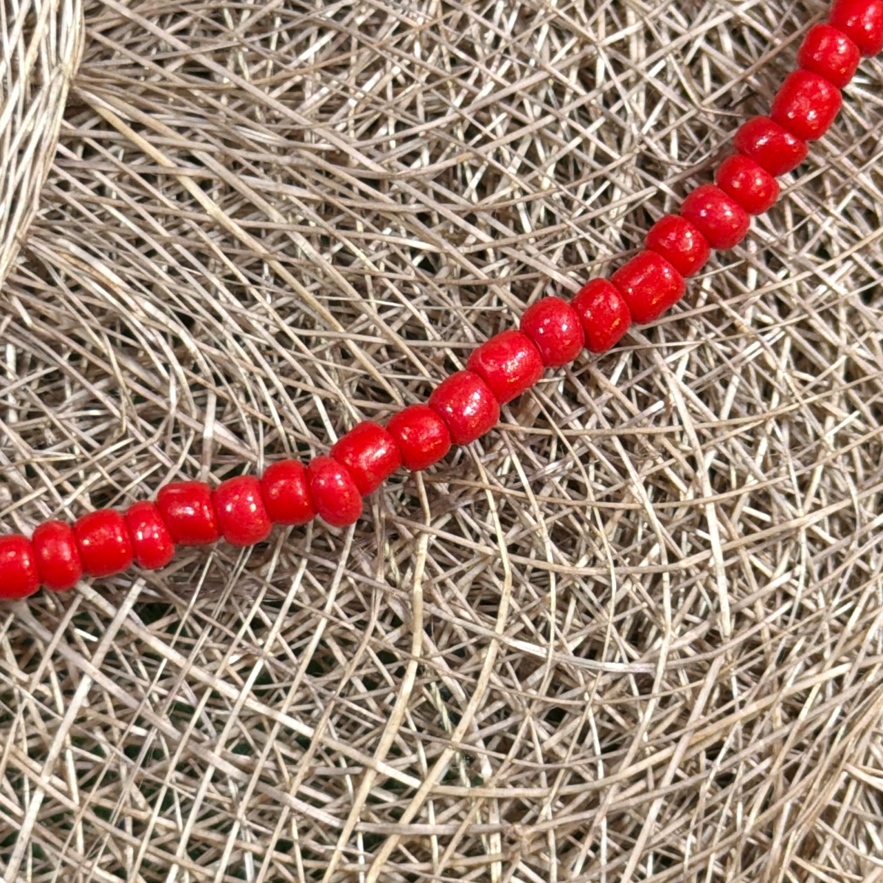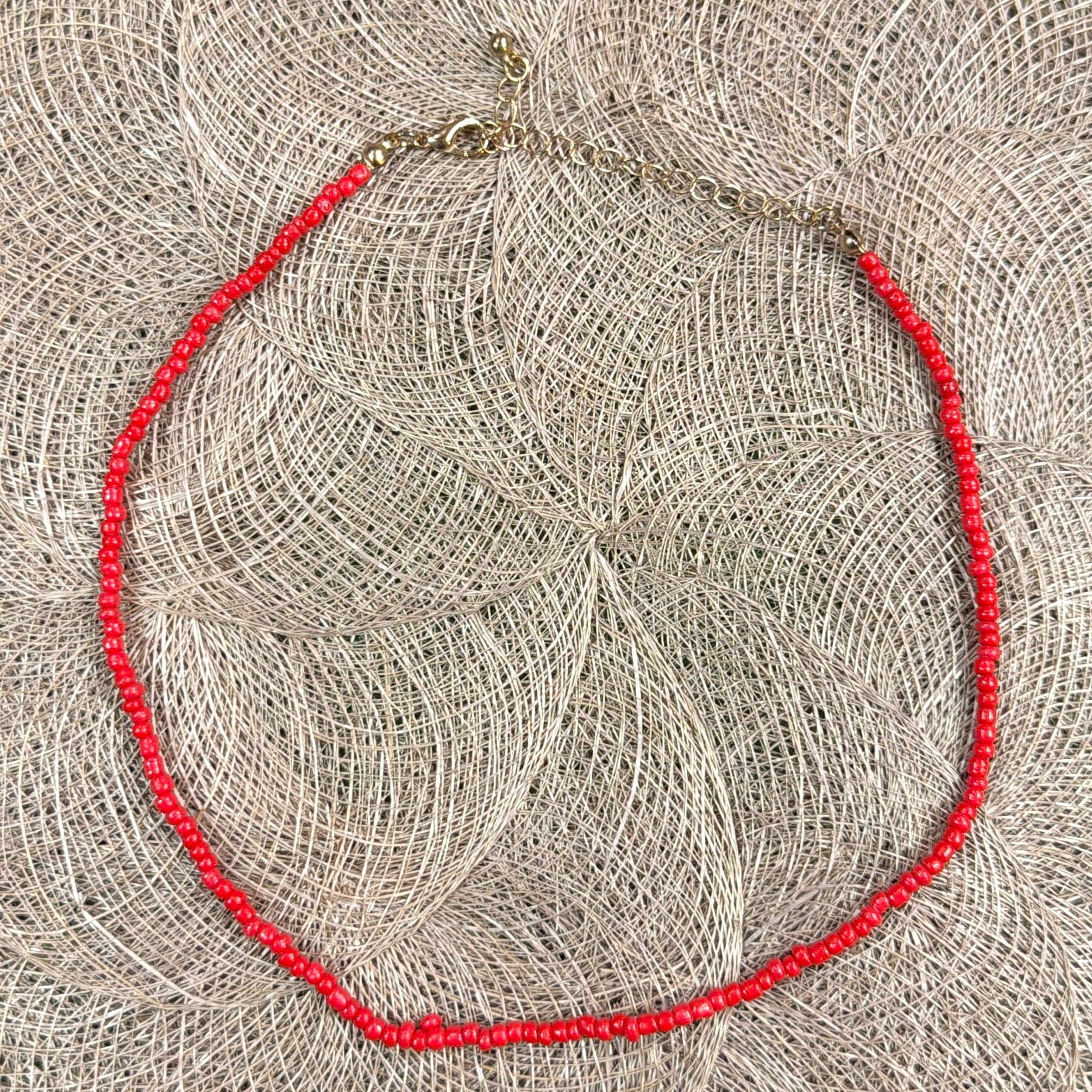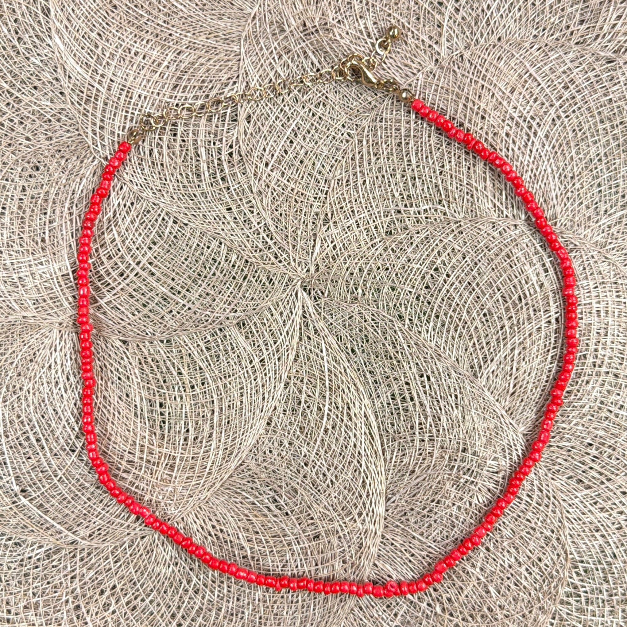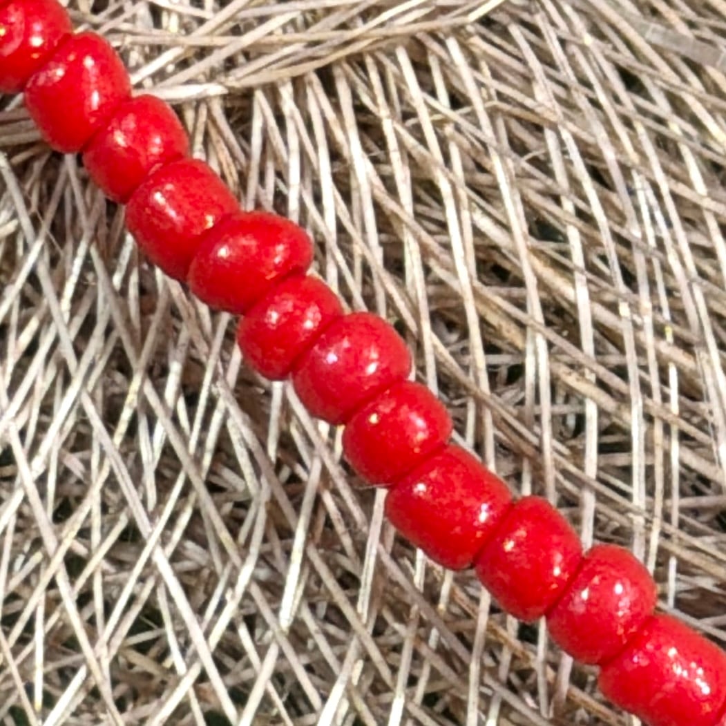 小ぶりなビーズサイズで主張しすぎず、首元にさりげなく色味を足してくれるアイテム。赤の発色がスタイリングのアクセントになり、無地のトップスにも自然に馴染みます。ユニセックスで使いやすいデザインなのもポイントです。