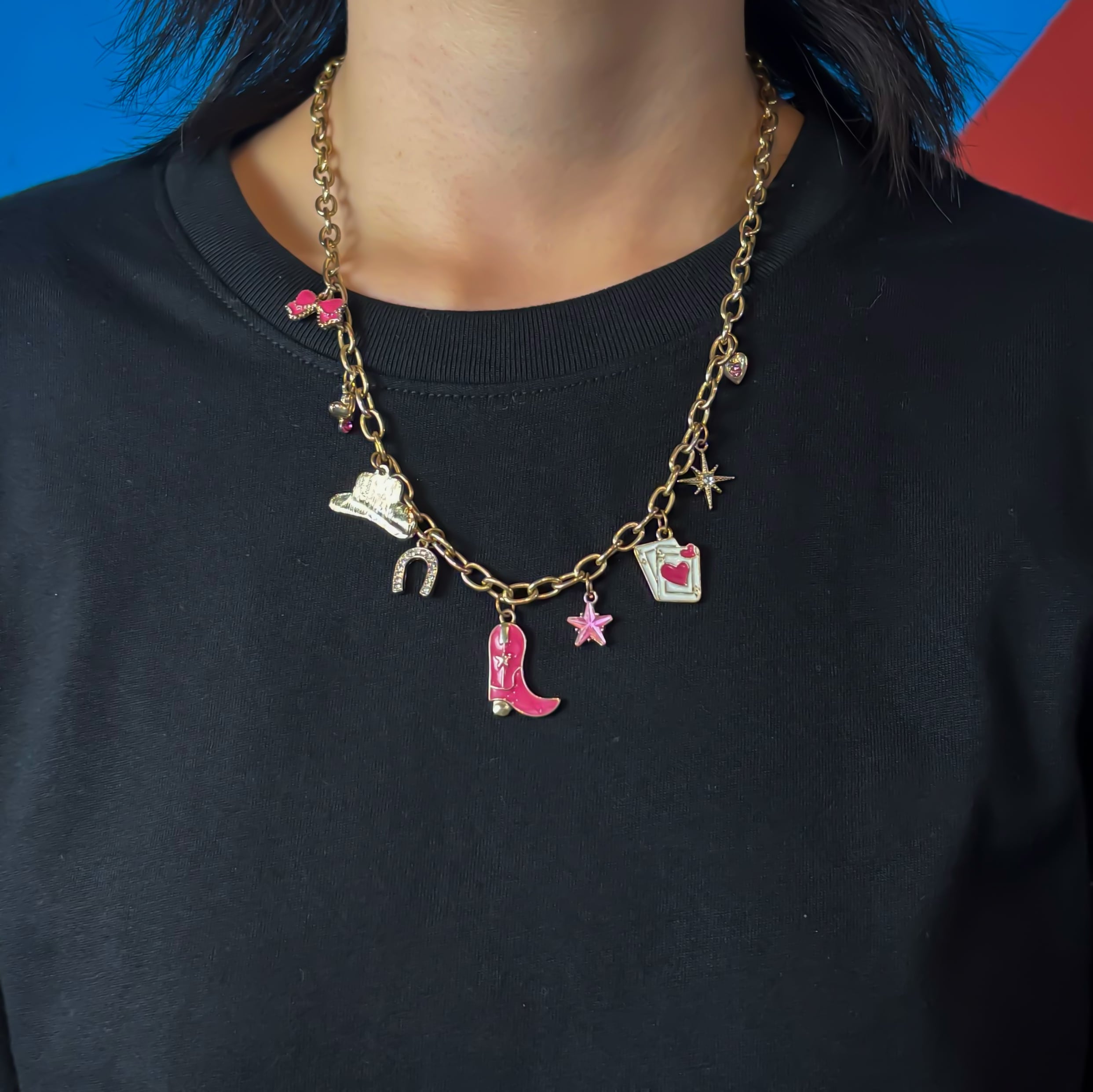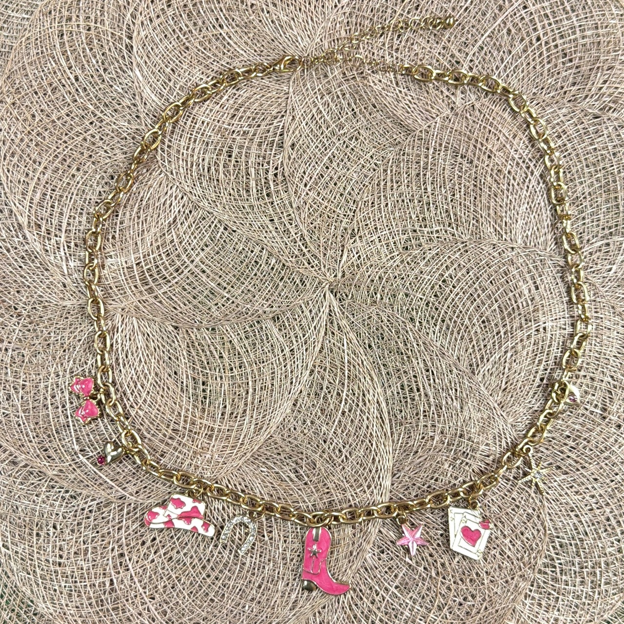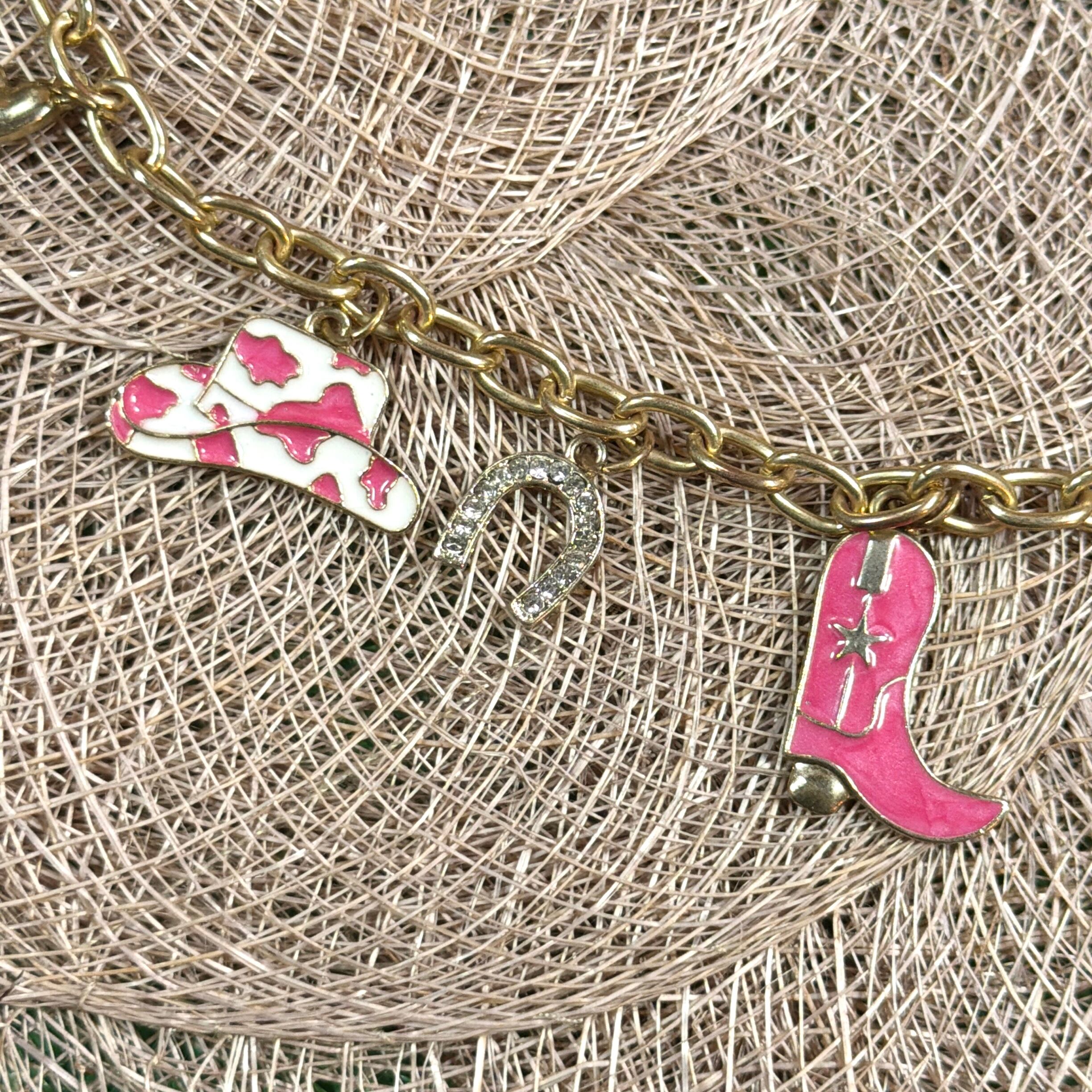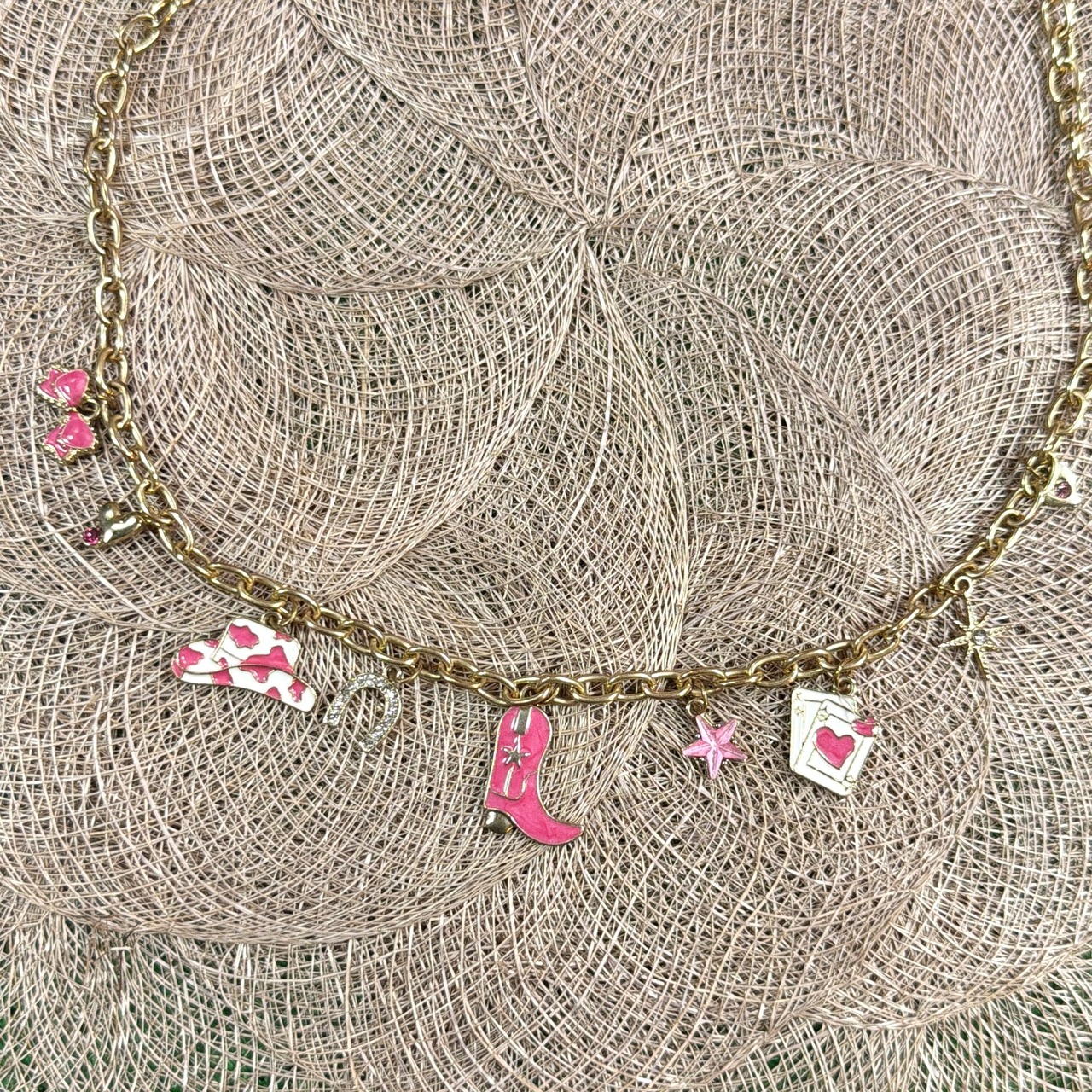 ブーツやハット、星、ハートなどのチャームがバランスよく配置されており、ゴールドカラーのチェーンにピンクを効かせた配色が印象的。