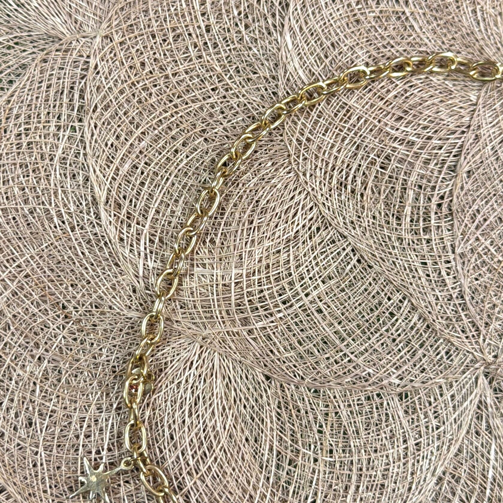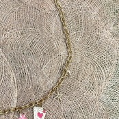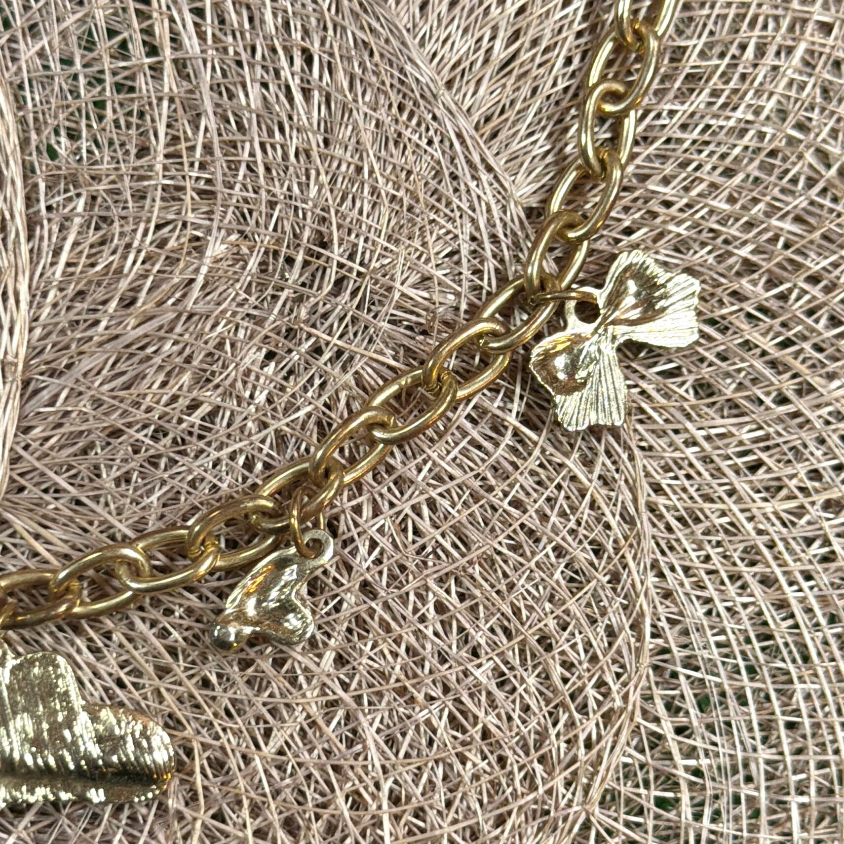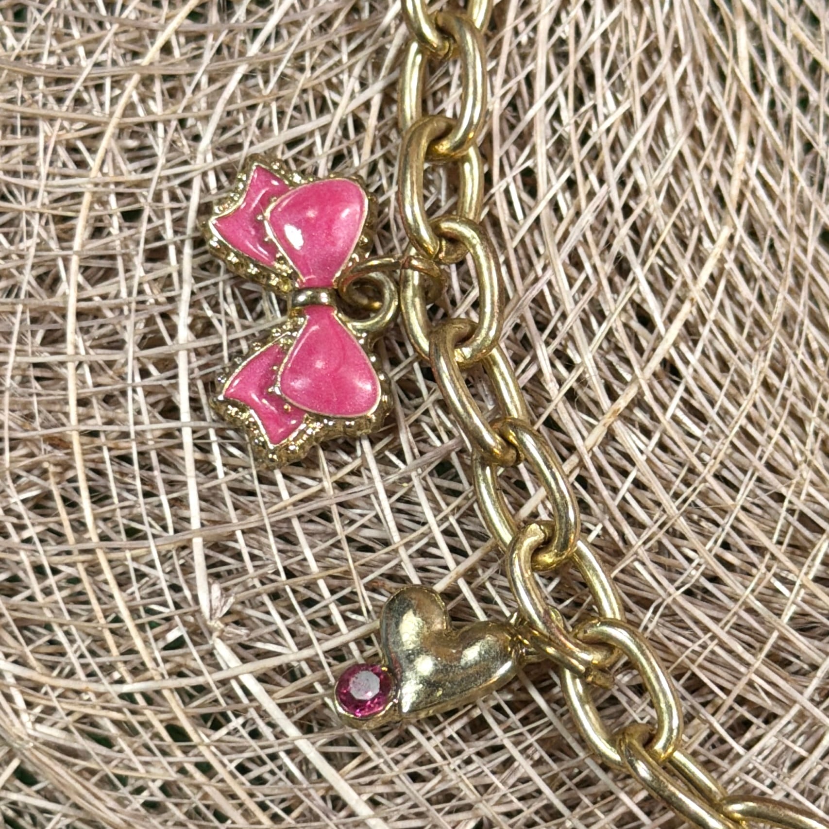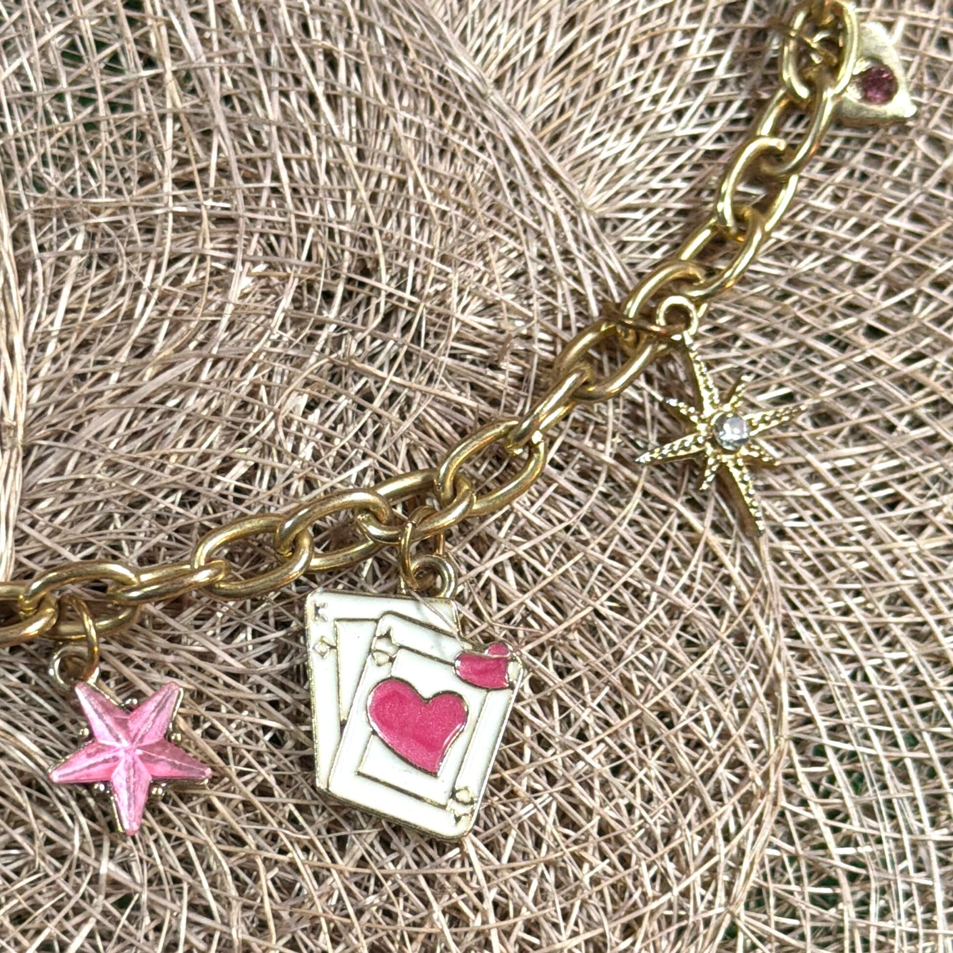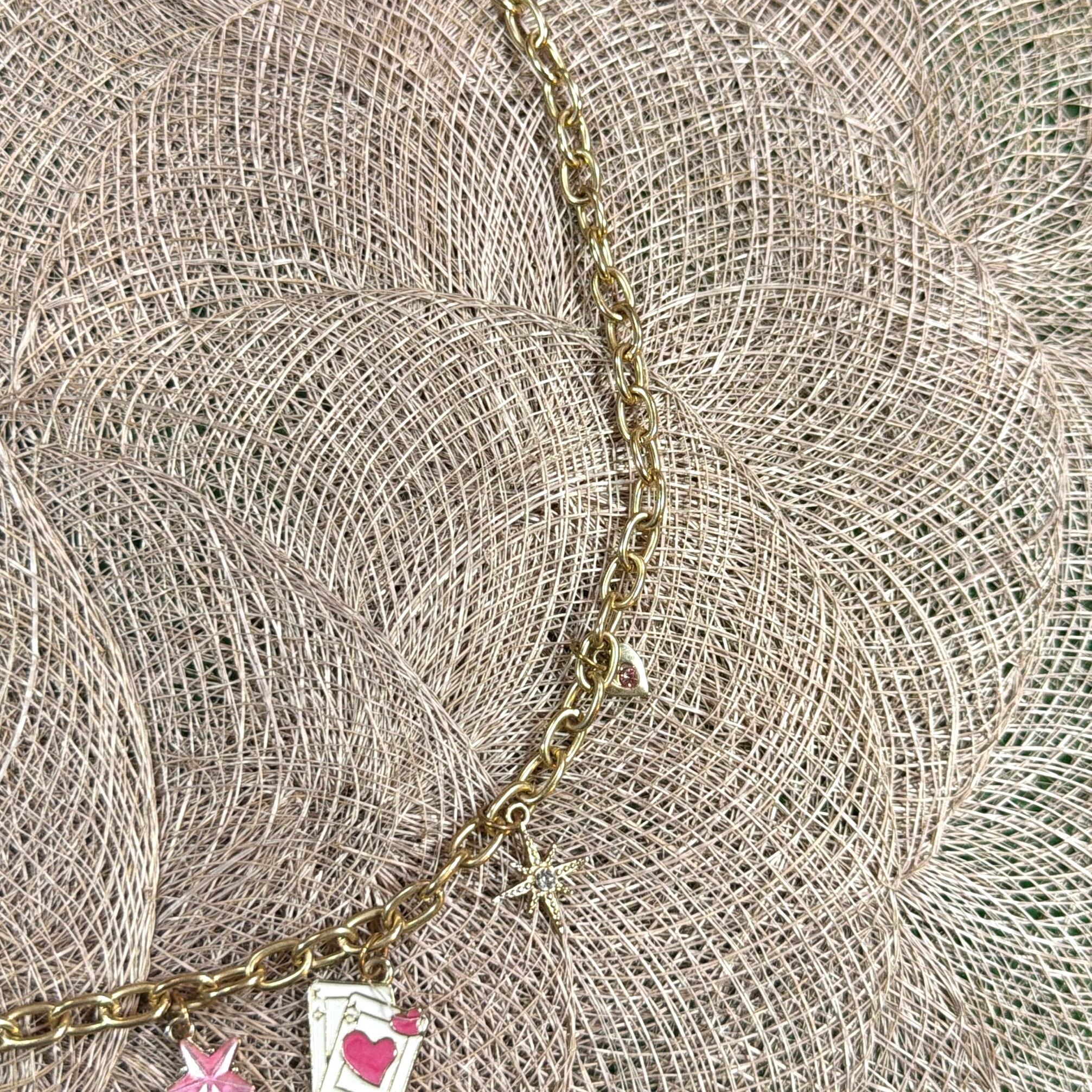 ブーツやハット、星、ハートなどのチャームがバランスよく配置されており、ゴールドカラーのチェーンにピンクを効かせた配色が印象的。