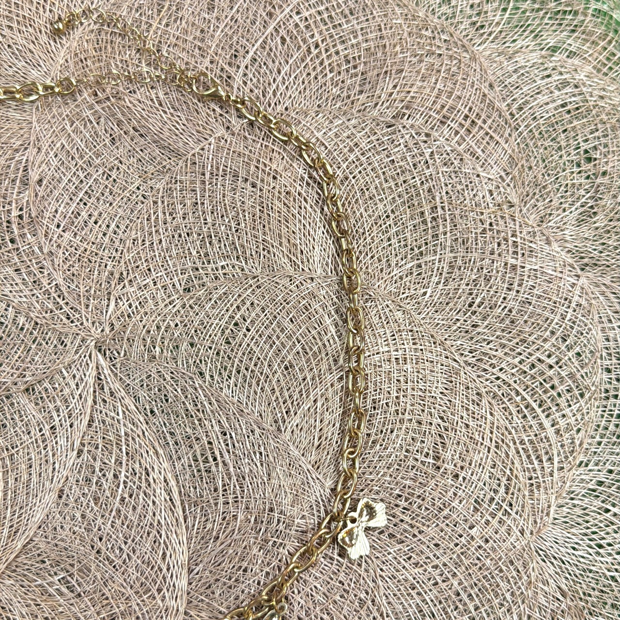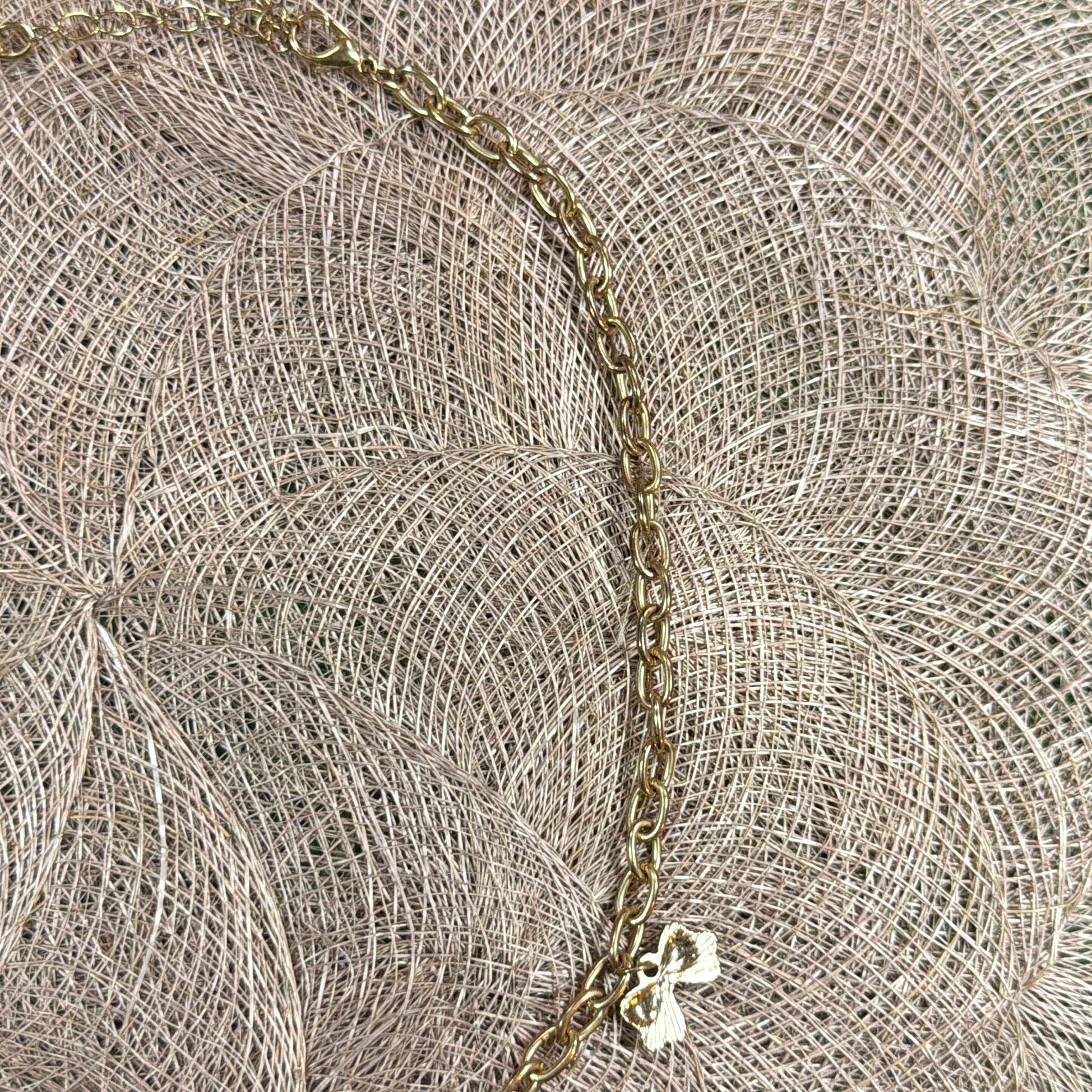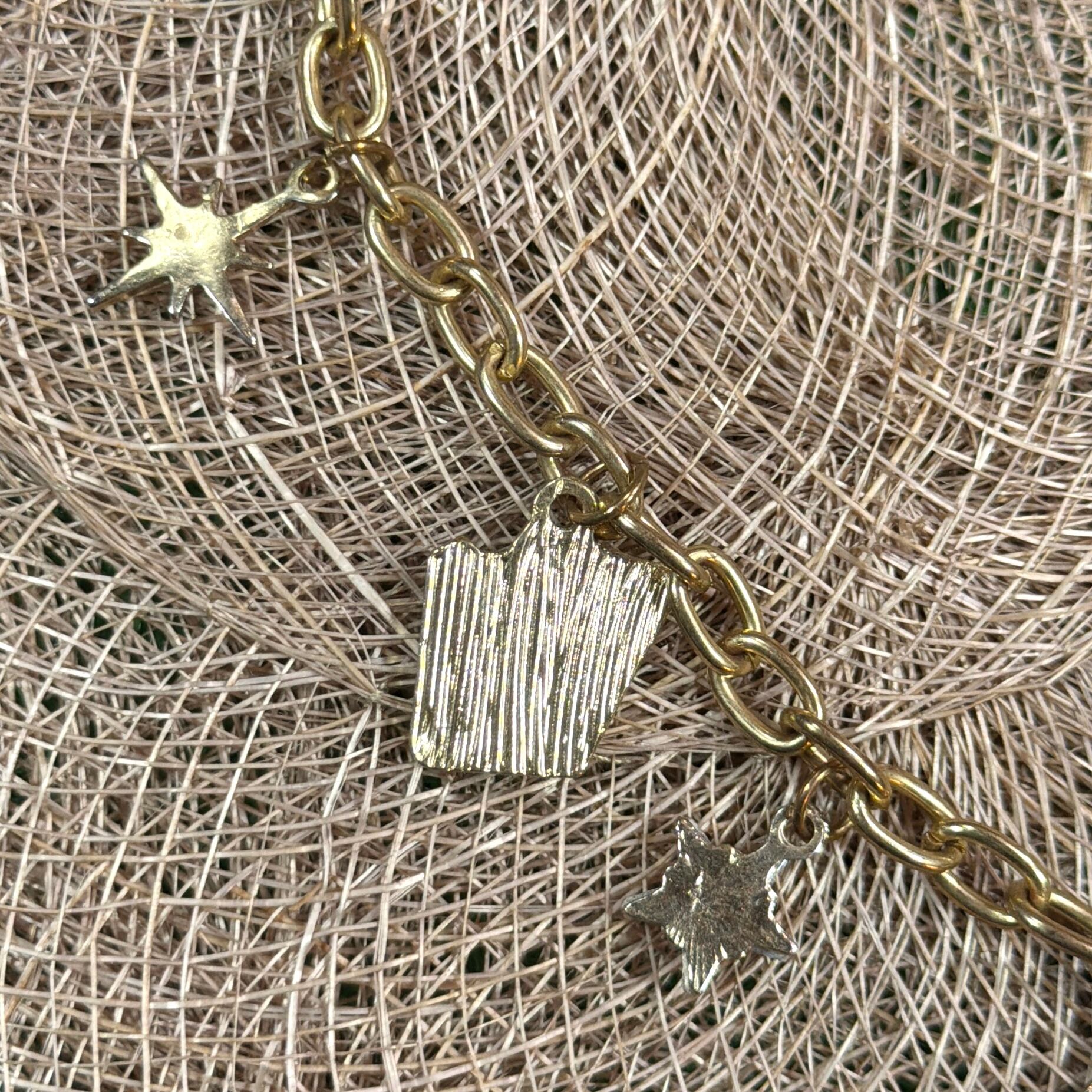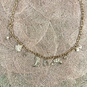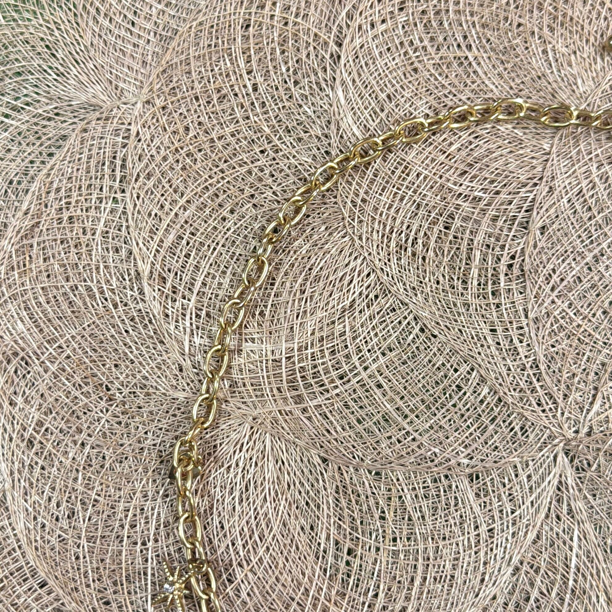 ブーツやハット、星、ハートなどのチャームがバランスよく配置されており、ゴールドカラーのチェーンにピンクを効かせた配色が印象的。