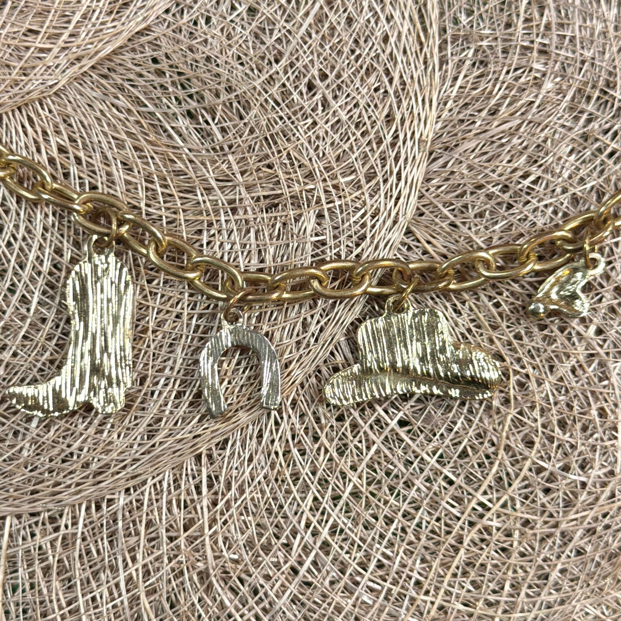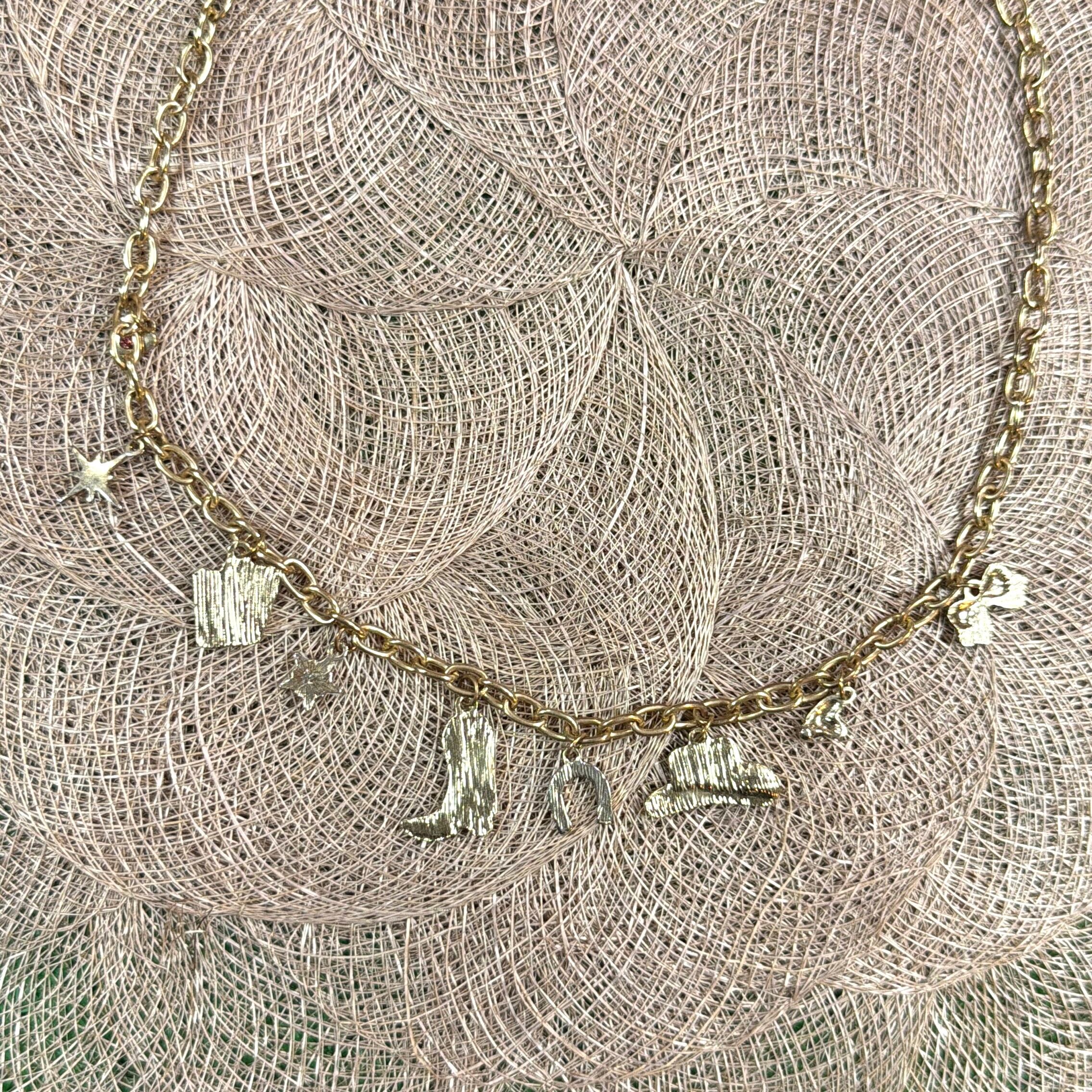 ウエスタンやカウボーイモチーフのチャームを組み合わせた、遊び心のあるネックレスです。