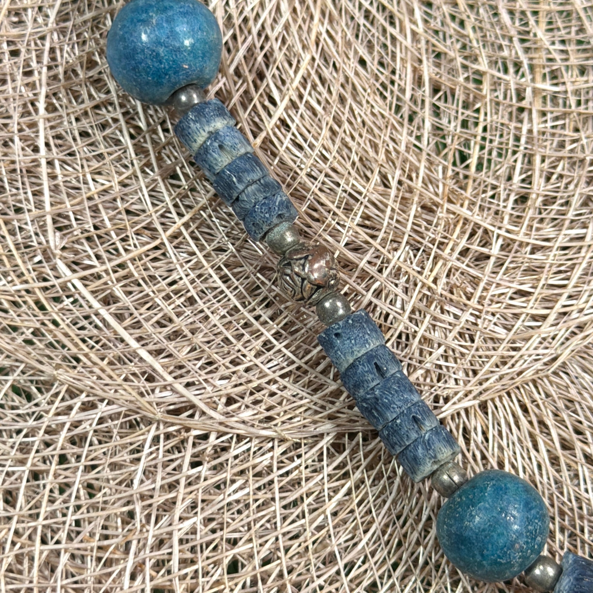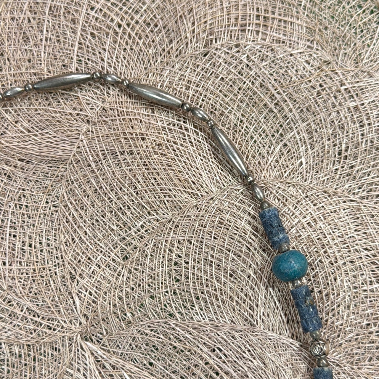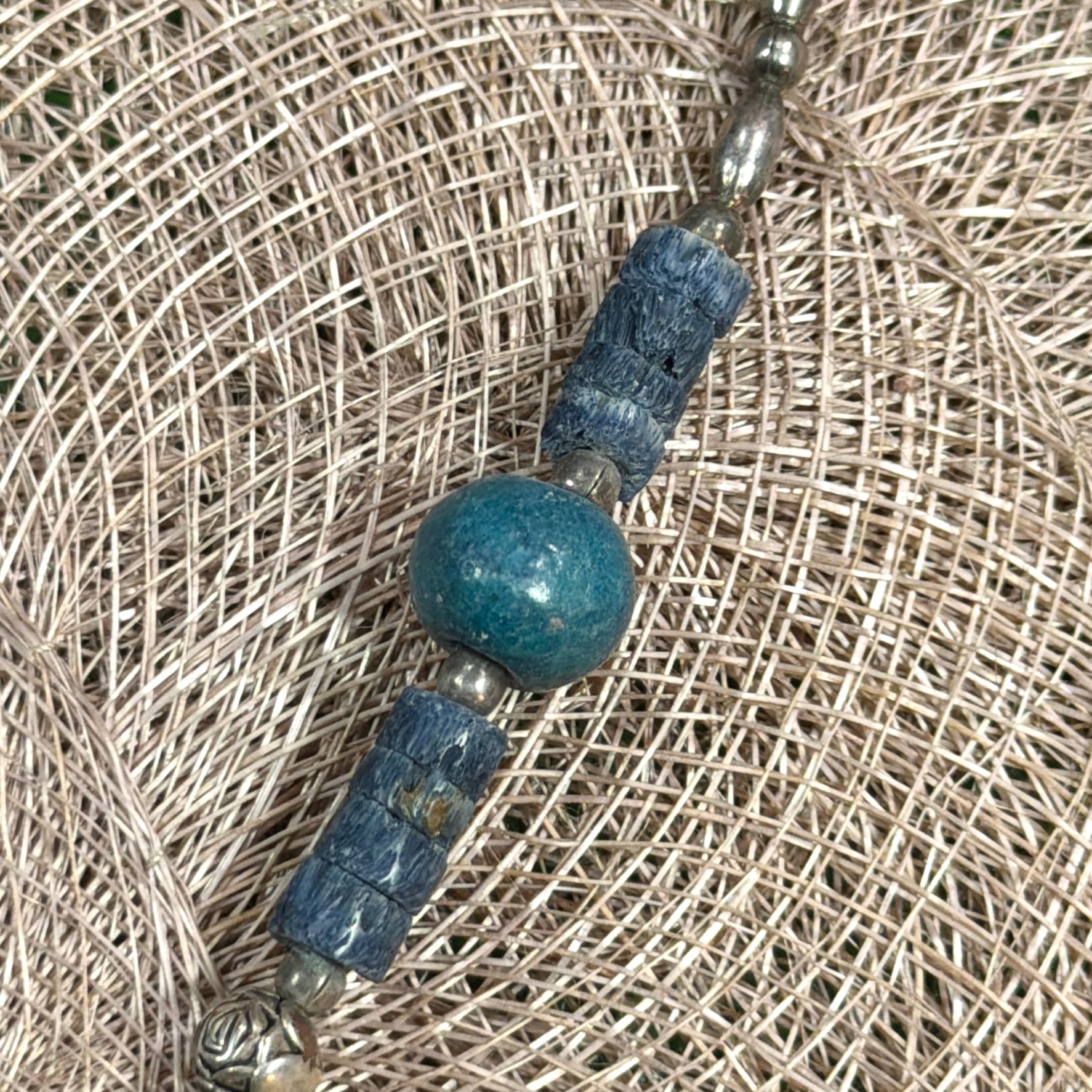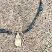 トップには人物を思わせるモチーフがが目を引く存在感のあるデザイン。周囲にはブルー系のビーズとシルバーカラーのパーツが組み合わされ、全体として落ち着きのある雰囲気に仕上がっています。
